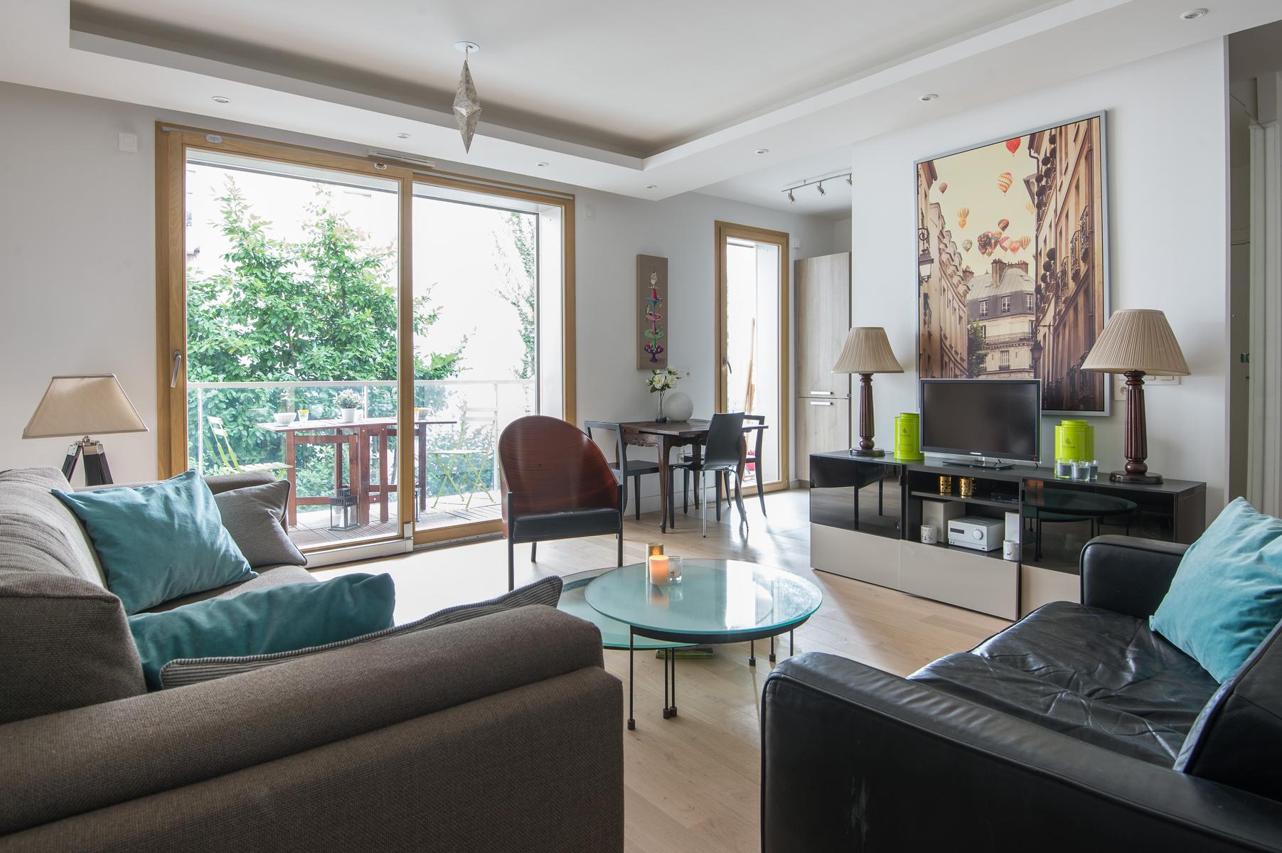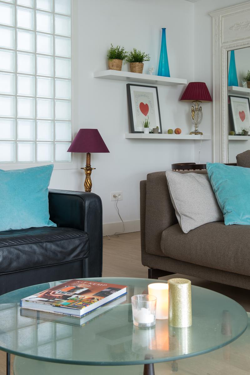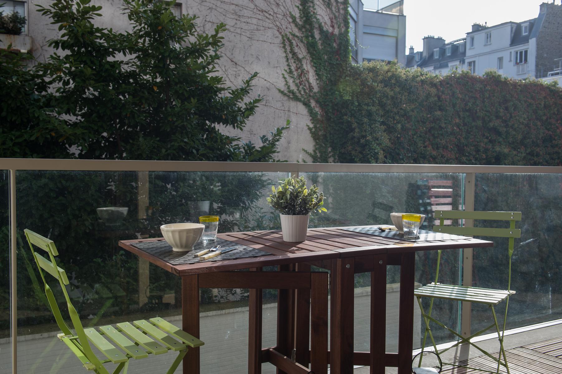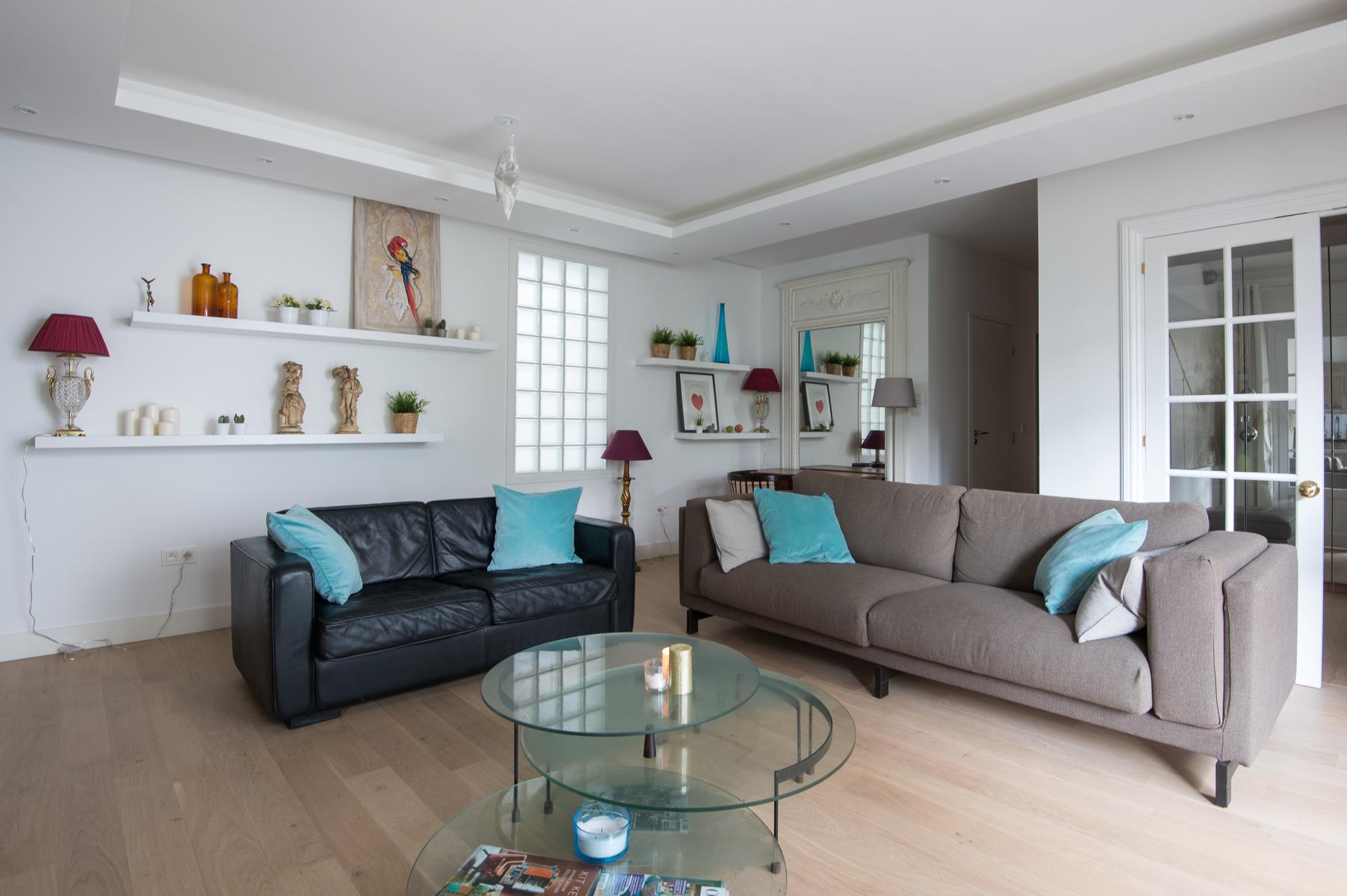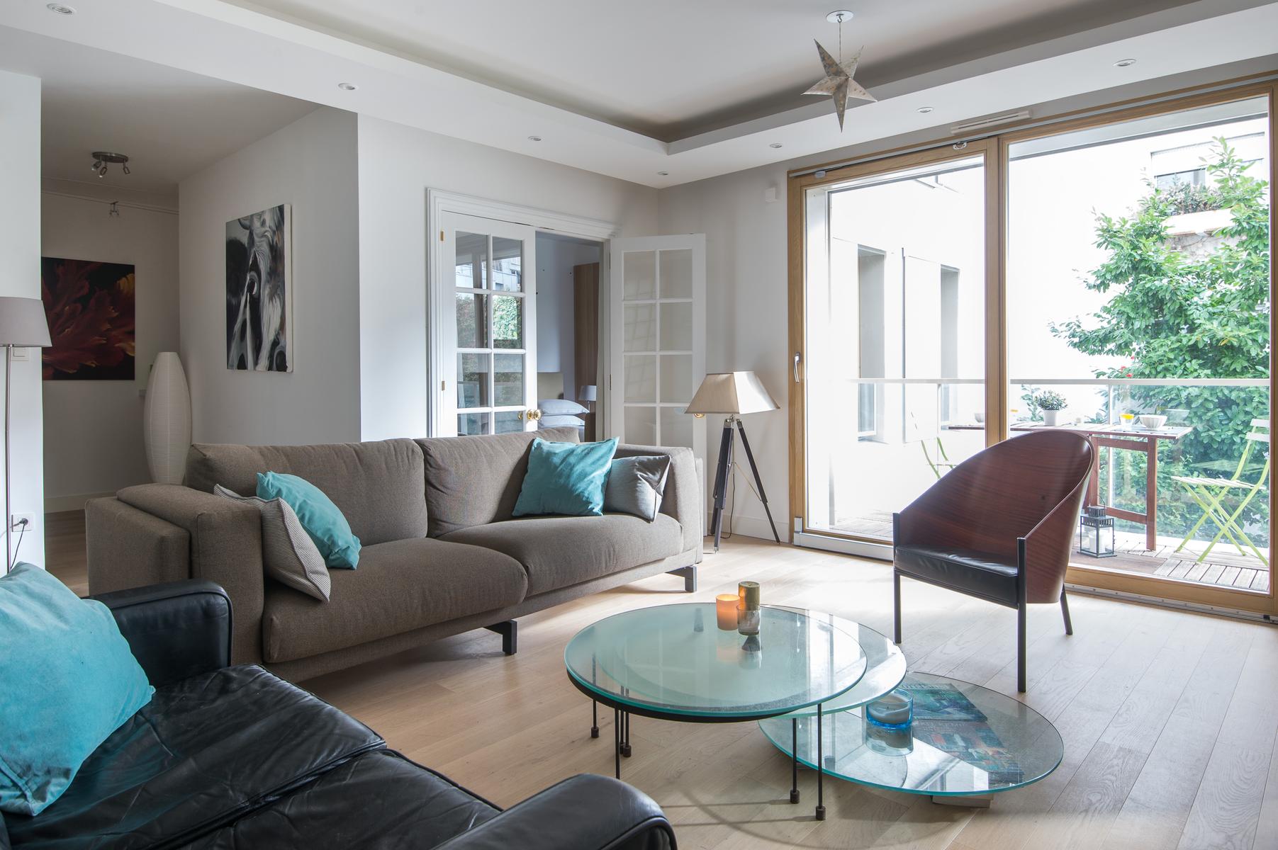 A l’image d’Auteuil-Passy, la rue de la Pompe VII se veut détendue. Vous pénétrez directement dans l’espace de vie ouvert, peint en blanc et au sol en bois, égayé par ses nombreuses œuvres d’art, ses plantes en pot et ses accessoires colorés. En plus de deux canapés douillets, chacun recouvert de coussins turquoise, il y a une table à manger et un bureau antique. De larges baies vitrées s’ouvrent sur le charmant balcon de cette maison, où il y a une table pour deux personnes.