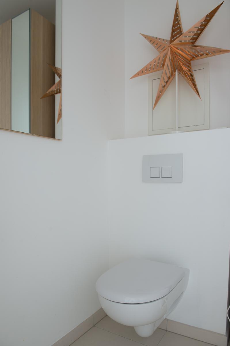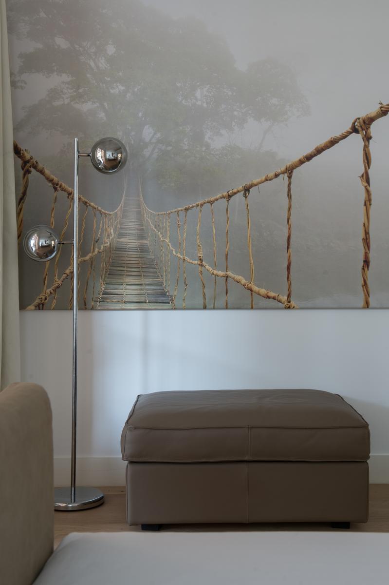 Ensuite, une porte donnant sur un côté de l’espace de vie ouvert donne accès à la cuisine contemporaine. Puis, par une deuxième porte, il y a un couloir qui mène d’abord aux toilettes et à la salle de bain élégante. Il y a aussi un bureau – simple et serein, avec un canapé-lit – et la chambre des maîtres. Ce dernier est un espace particulièrement calme, avec un lit double accueillant, des armoires miroir et plusieurs toiles apaisantes.
