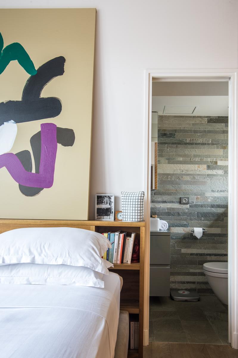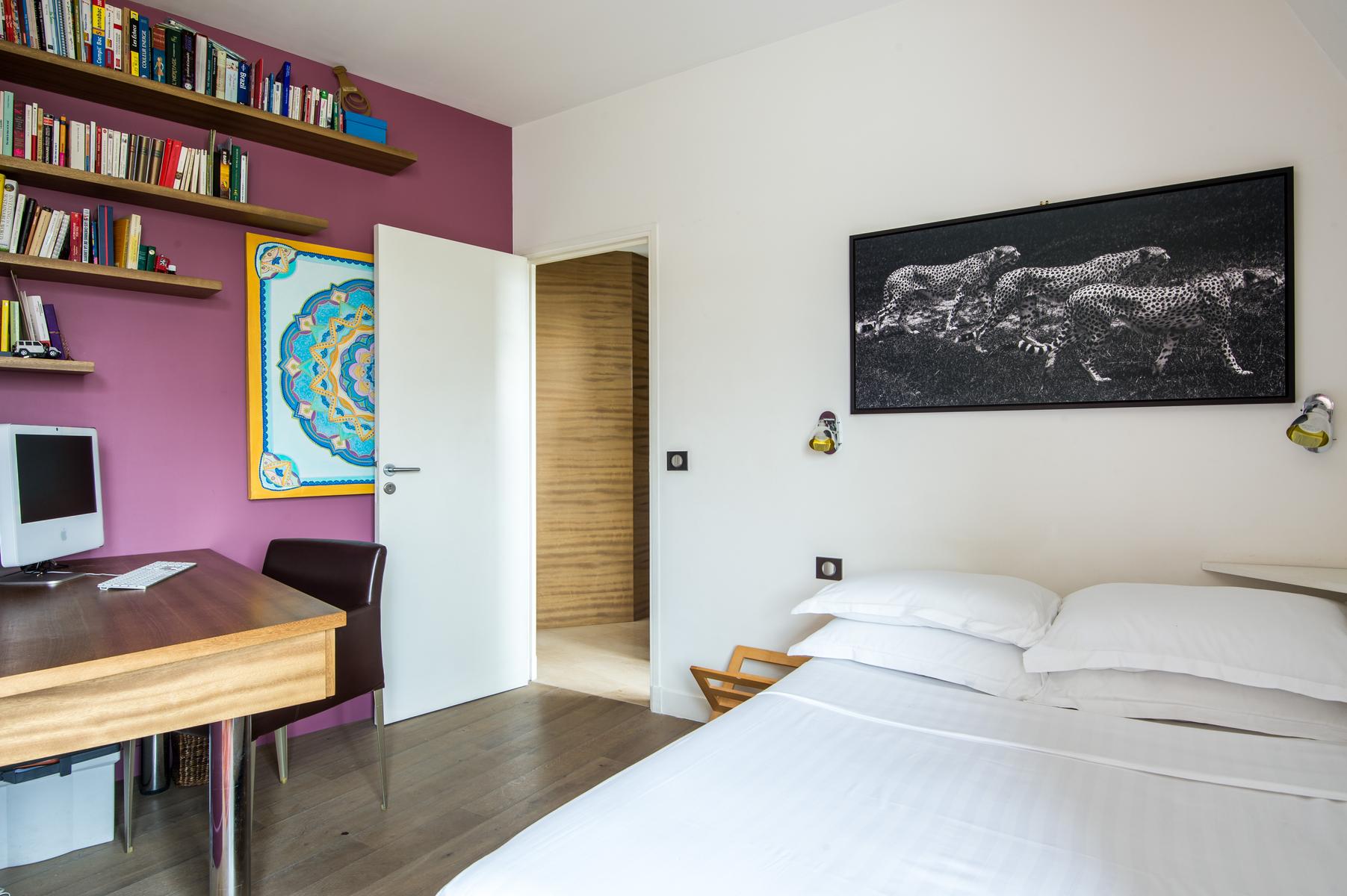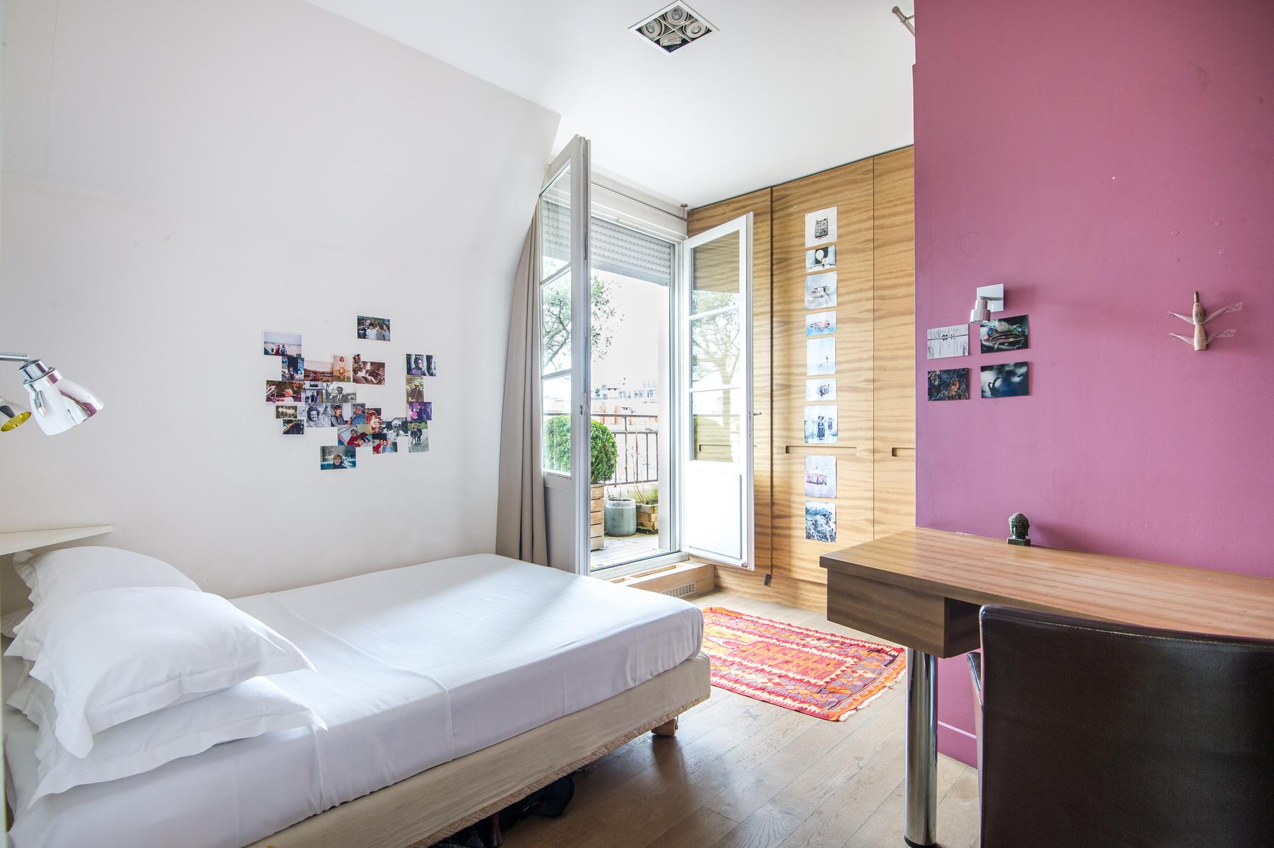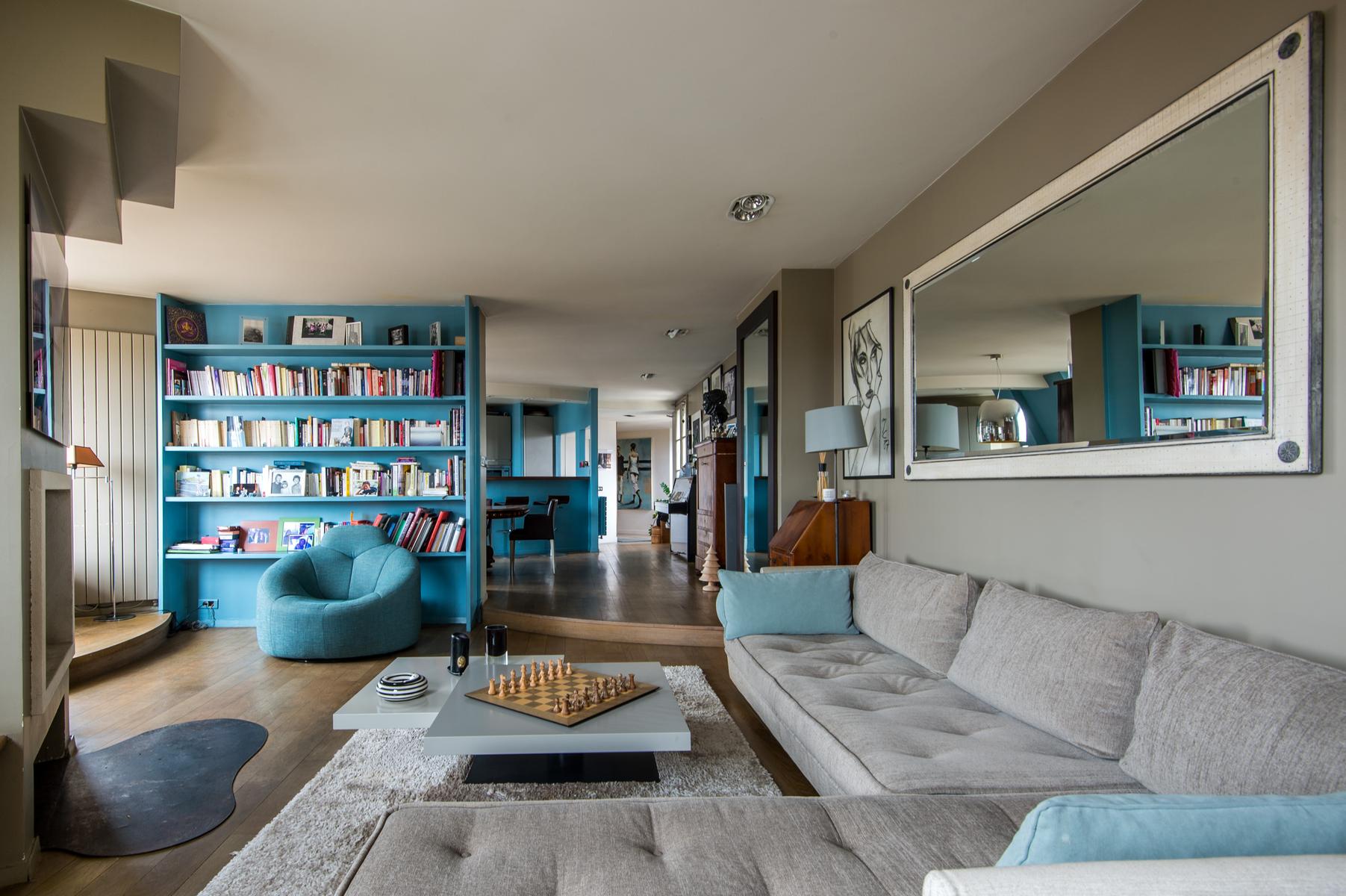 Rue de Passy II is a three bedroom, three bathroom home in Eiffel Tower. From the kitchen’s contemporary turquoise breakfast bar and contrasting antique table, to the sitting room’s collection of cool furniture and yet cooler artworks, this home’s open-plan living area feels very vibrant. The bedrooms are stylish and characterful too, and the little balcony has a close-up view of the Eiffel Tower. The area’s central and very elegant – you’ll find upscale boutiques and restaurants aplenty nearby. The Jardins du Trocadéro and Eiffel Tower are within walking distance, and it’s just a three-minute stroll to Passy metro station.