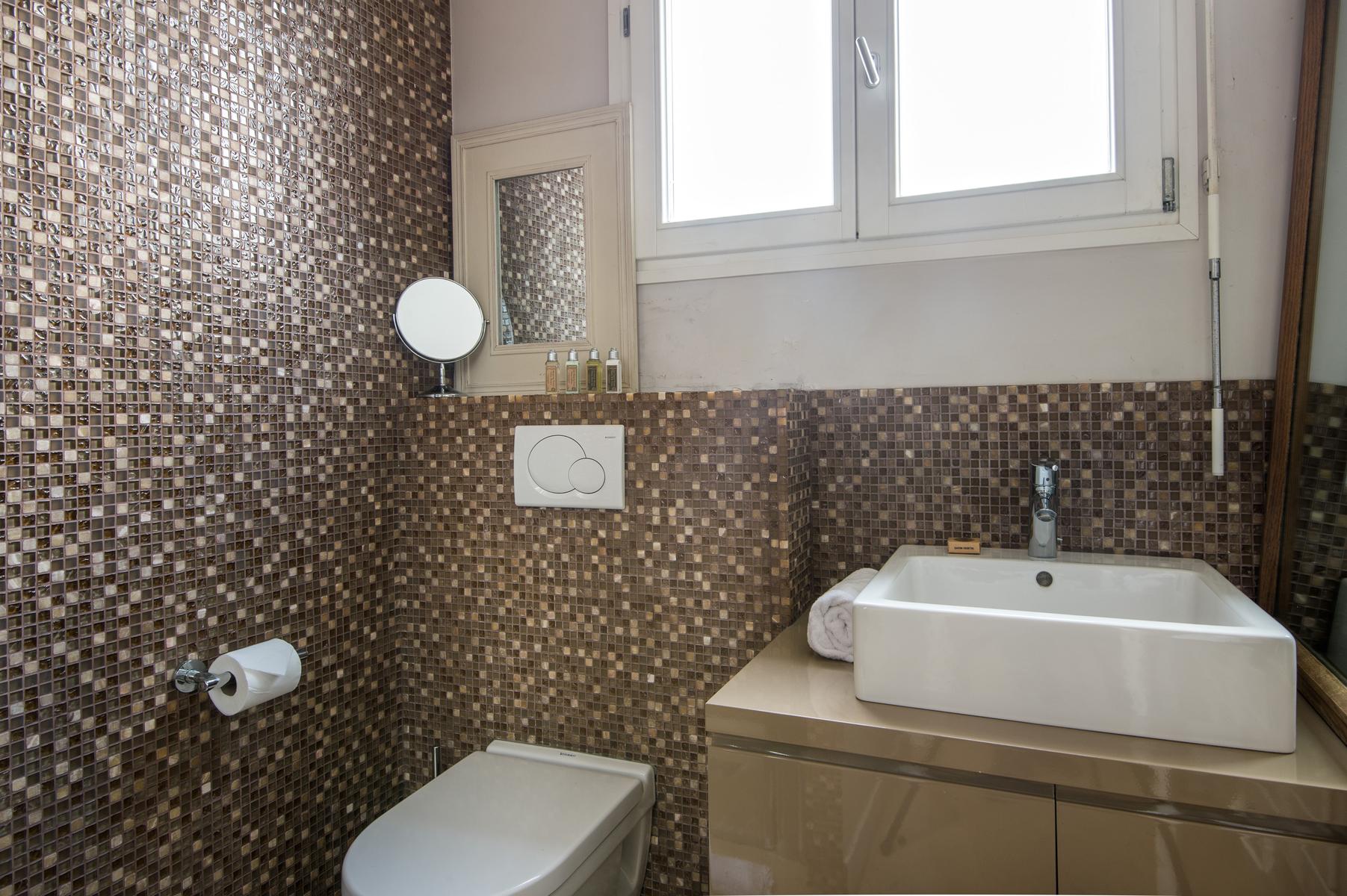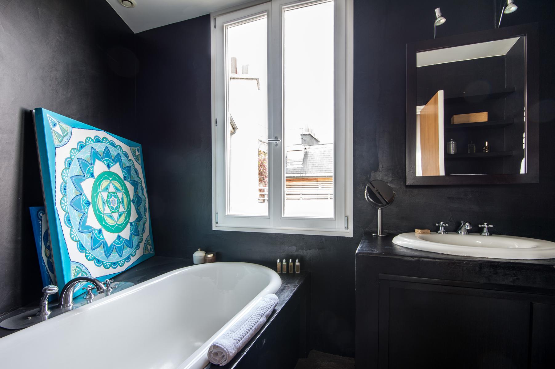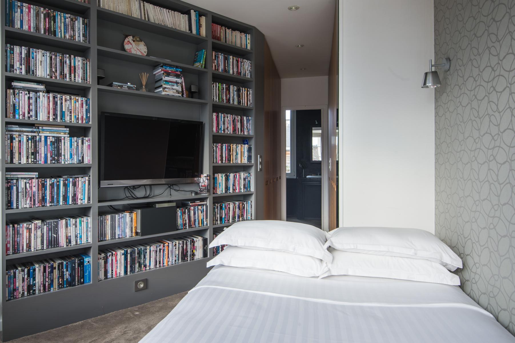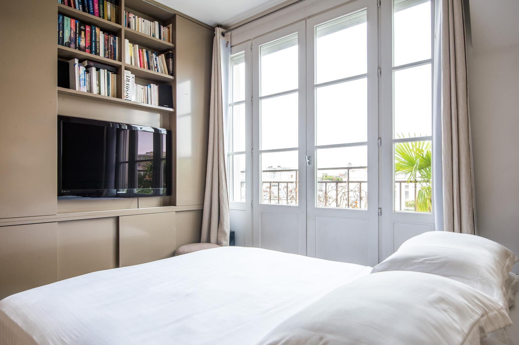 Rue de Passy II is a three bedroom, three bathroom home in Eiffel Tower. From the kitchen’s contemporary turquoise breakfast bar and contrasting antique table, to the sitting room’s collection of cool furniture and yet cooler artworks, this home’s open-plan living area feels very vibrant. The bedrooms are stylish and characterful too, and the little balcony has a close-up view of the Eiffel Tower. The area’s central and very elegant – you’ll find upscale boutiques and restaurants aplenty nearby. The Jardins du Trocadéro and Eiffel Tower are within walking distance, and it’s just a three-minute stroll to Passy metro station.