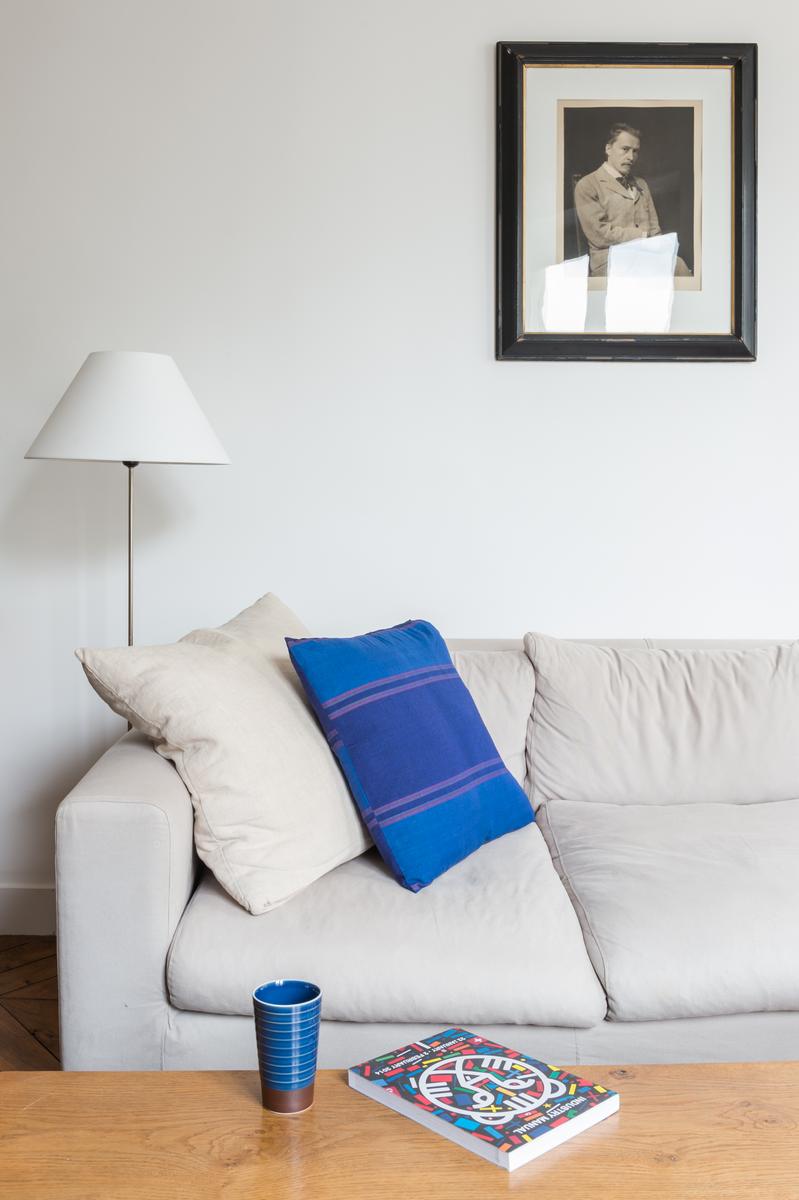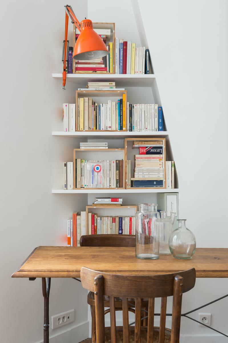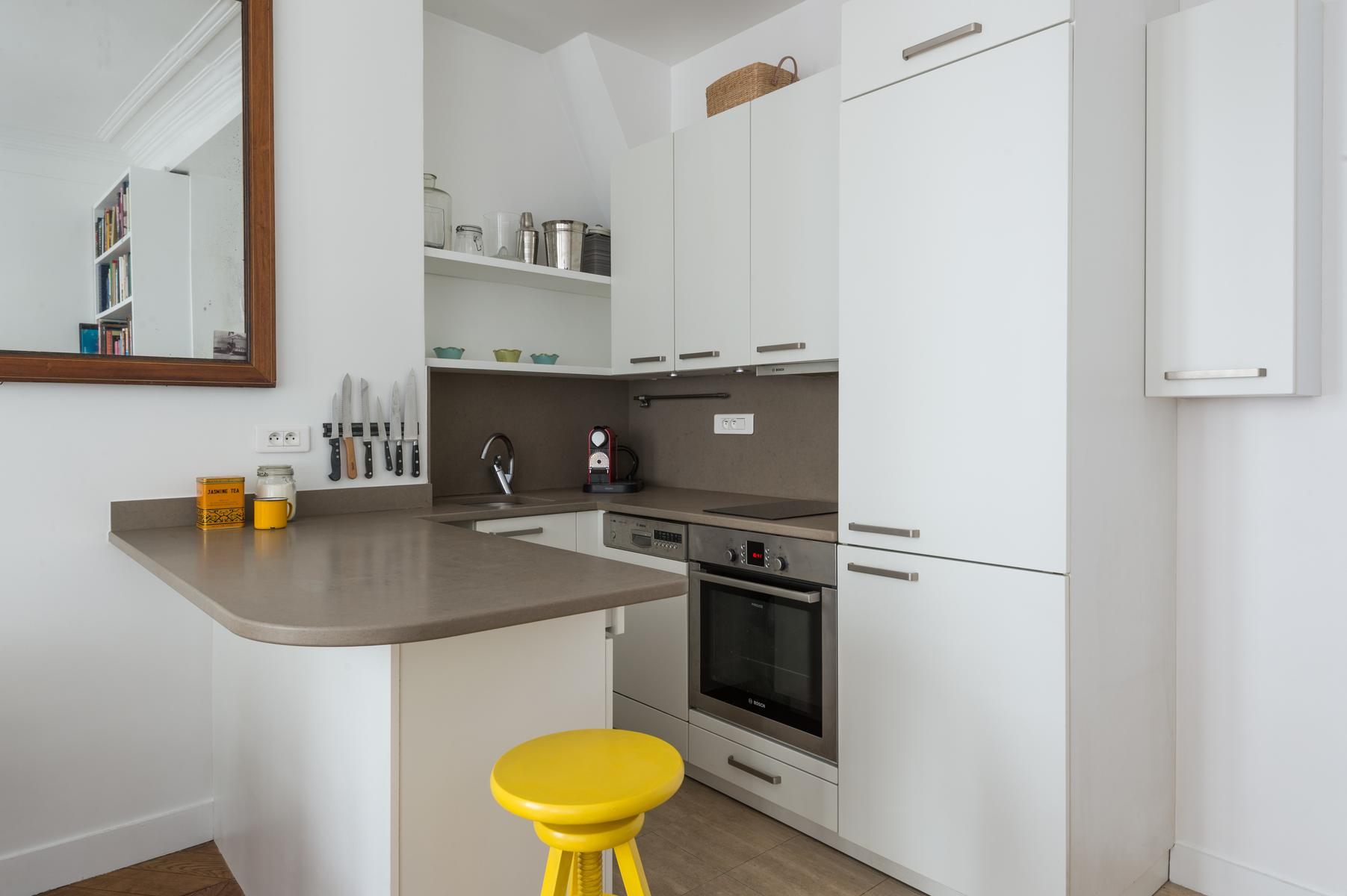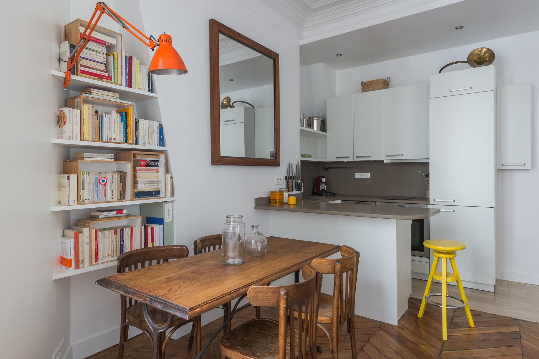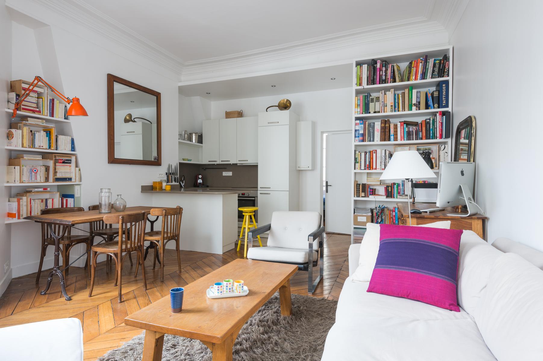 Des murs bordés de livres, des détails en bois et des pops au décor coloré – cette charmante maison se trouve au cœur vibrant du Marais. Au deuxième étage, la porte d’entrée mène directement à un espace de vie ouvert. C’est une pièce peinte en blanc, avec des parquets et de longues fenêtres traditionnelles. Dans un coin se trouve un coin cuisine – élégamment conçu en gris et blanc. A côté du bar du petit-déjeuner, vous trouverez un coin-repas bordé de livres, avec une table et des chaises vintage. Et juste en face, c’est le coin salon de cette maison. Un canapé crème, un fauteuil et un ottoman s’assoient autour d’une table basse en bois, et il y a aussi un petit bureau.