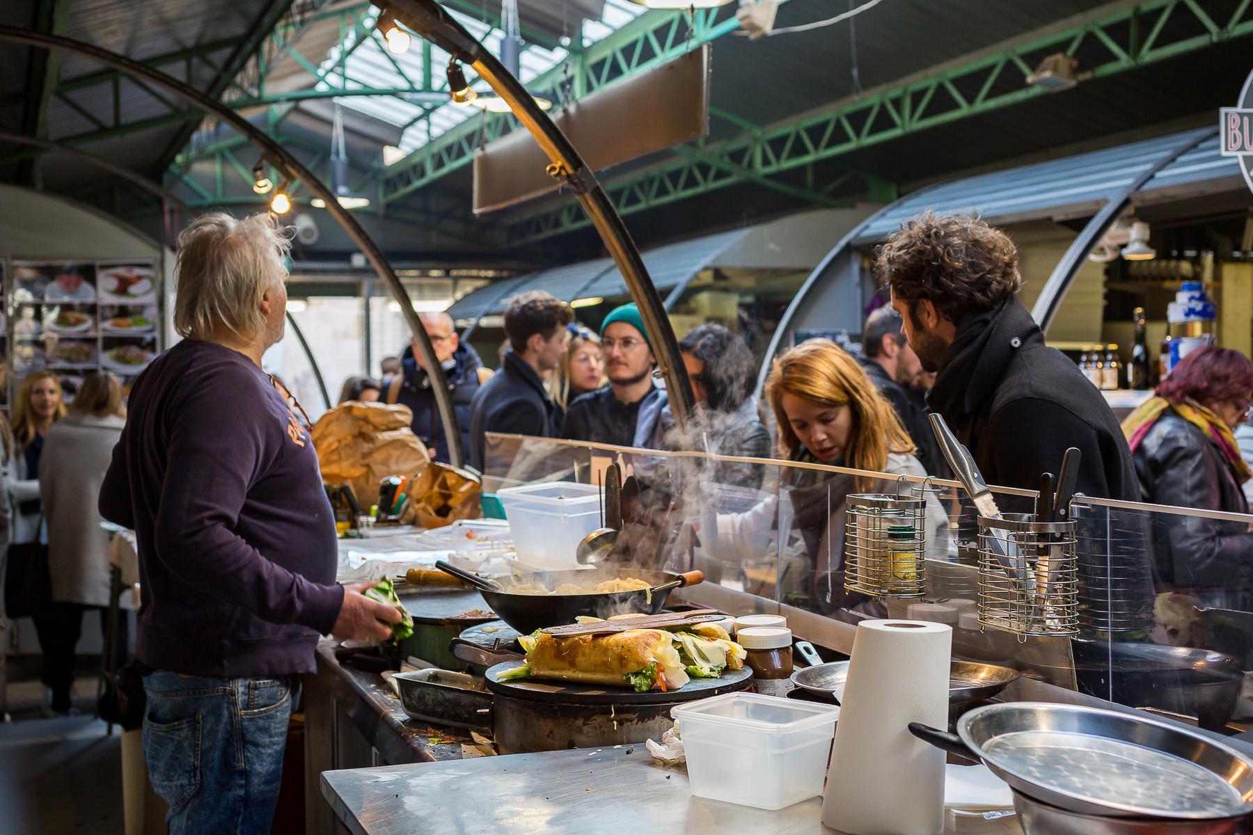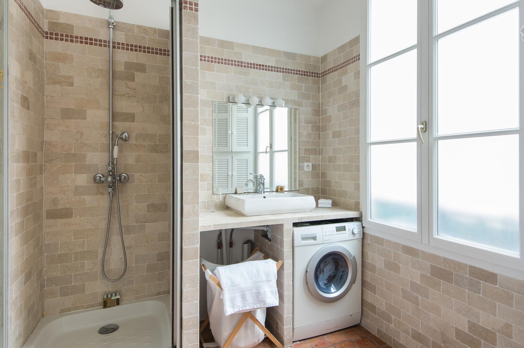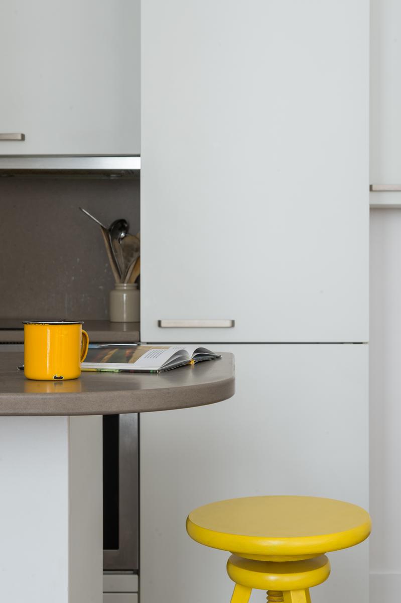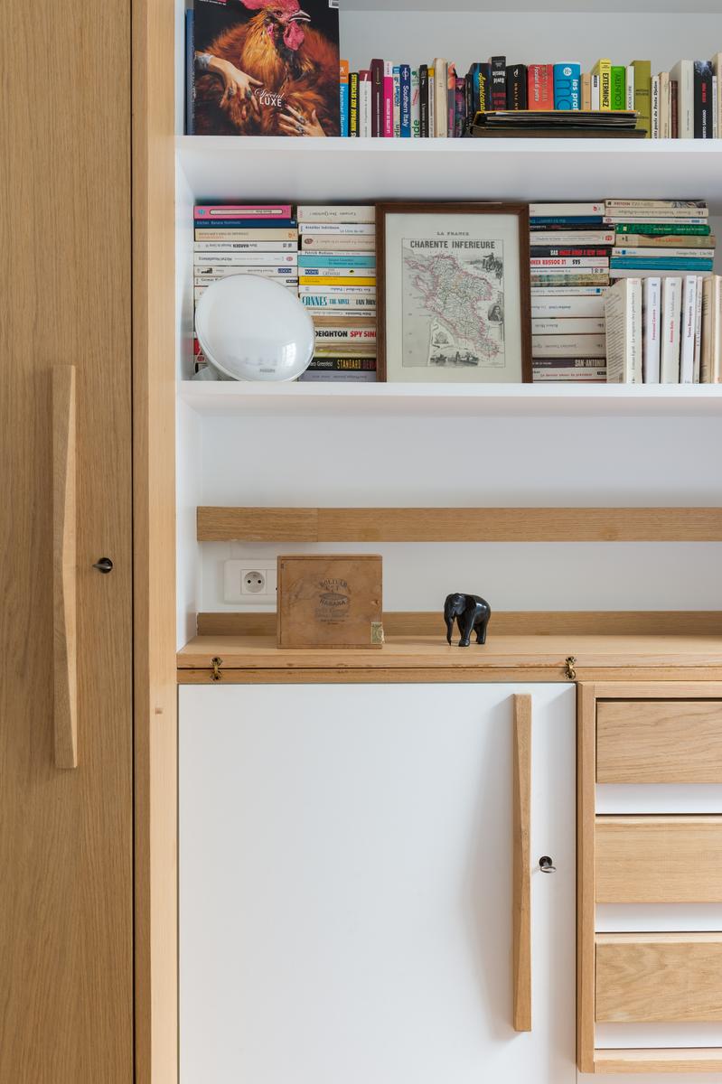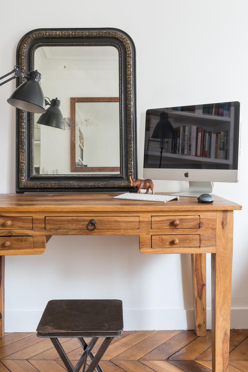 Des murs bordés de livres, des détails en bois et des pops au décor coloré – cette charmante maison se trouve au cœur vibrant du Marais. Au deuxième étage, la porte d’entrée mène directement à un espace de vie ouvert. C’est une pièce peinte en blanc, avec des parquets et de longues fenêtres traditionnelles. Dans un coin se trouve un coin cuisine – élégamment conçu en gris et blanc. A côté du bar du petit-déjeuner, vous trouverez un coin-repas bordé de livres, avec une table et des chaises vintage. Et juste en face, c’est le coin salon de cette maison. Un canapé crème, un fauteuil et un ottoman s’assoient autour d’une table basse en bois, et il y a aussi un petit bureau.