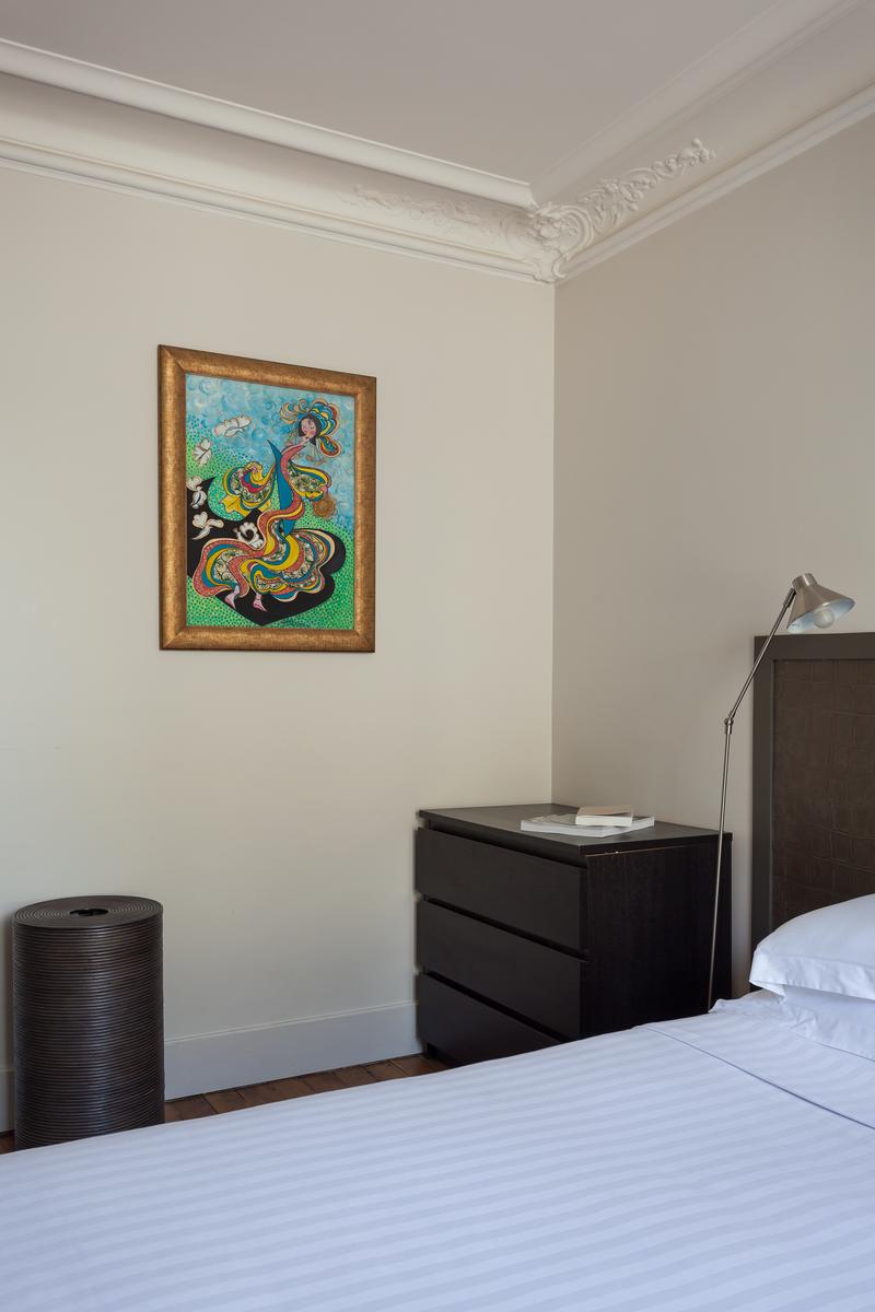 Enfin, il y a la chambre principale – la dernière à droite. Les accessoires raffinés de cette pièce – le miroir sculpté, l’œuvre d’art à cadre doré – ajoutent à la sensation de bien-être, et la tête de lit en bois surdimensionnée ajoute une touche finale (résolument de bon goût).