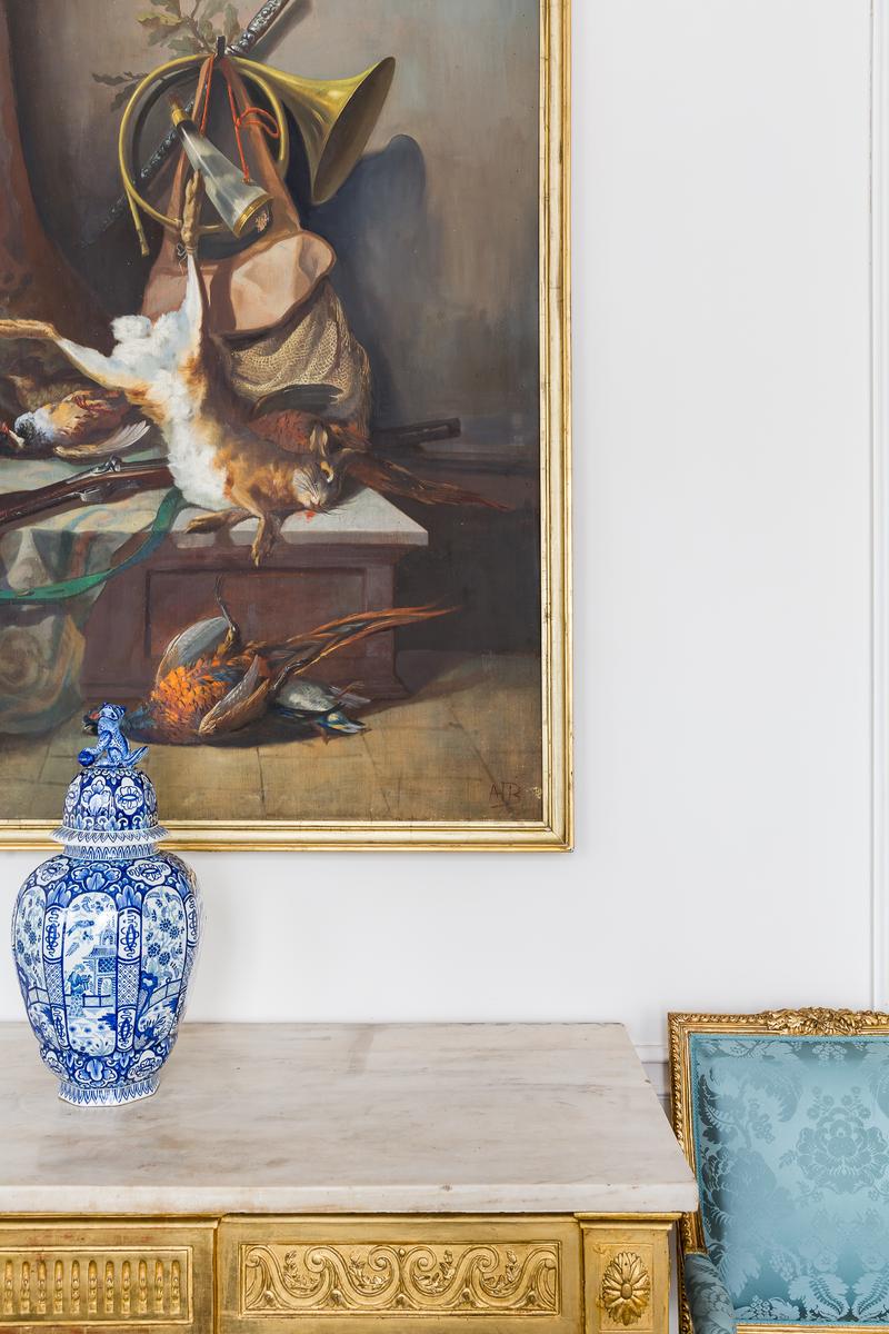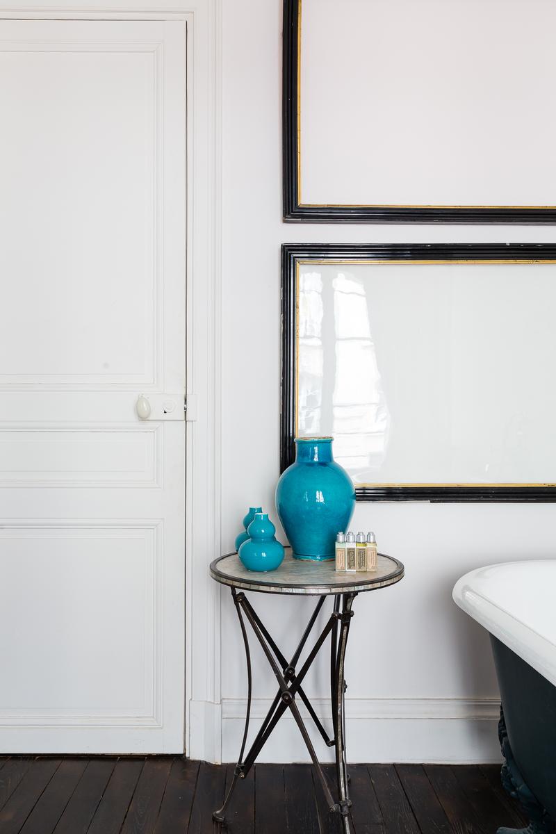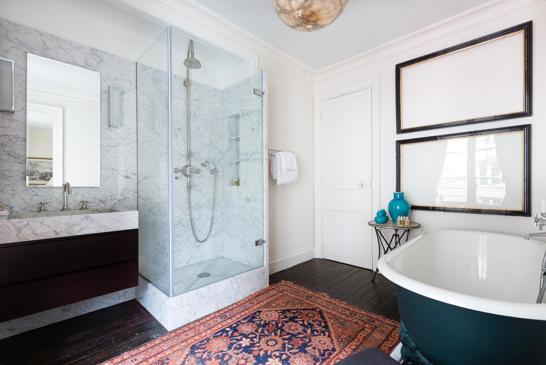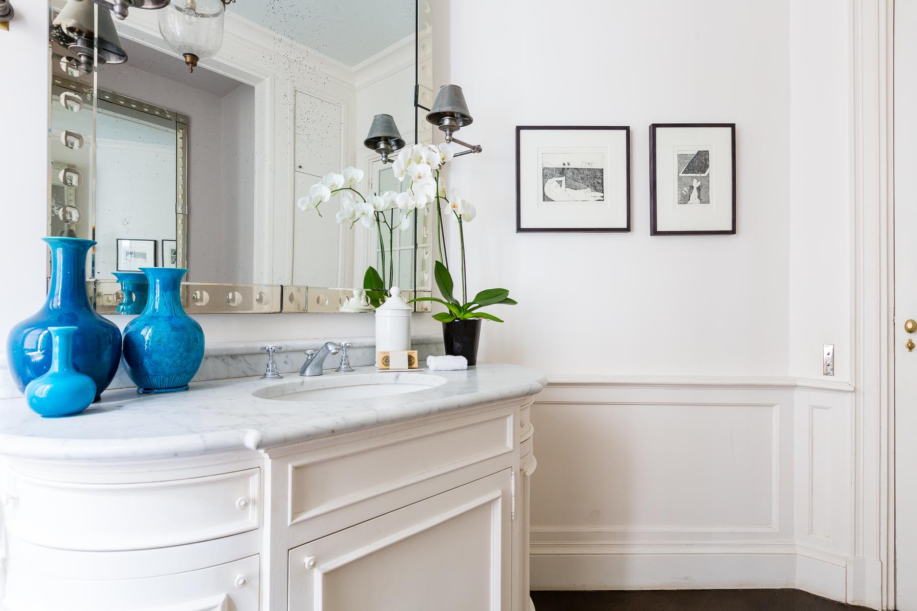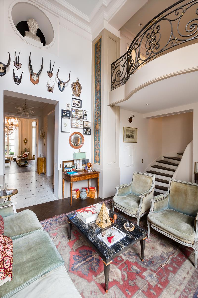 Des antiquités élaborées aux murs et plafonds dorés, tout ce qui se trouve à l’intérieur de la rue de Varenne III fait une déclaration. La porte d’entrée s’ouvre en face de la salle à manger, qui possède une longue table polie. Il jouxte un salon – richement décoré, avec de gracieux canapés et tables d’appoint et plusieurs peintures à l’huile. Puis un deuxième salon se trouve à droite du couloir. Bien que plus petit, il est tout aussi grand, avec des étagères en turquoise et en or, bordées d’anciens volumes. Une porte d’entrée vous conduit à un passage qui mène à une salle de bains, à une salle de bains et à la chambre des maîtres légèrement plus subtile (mais toujours splendide).