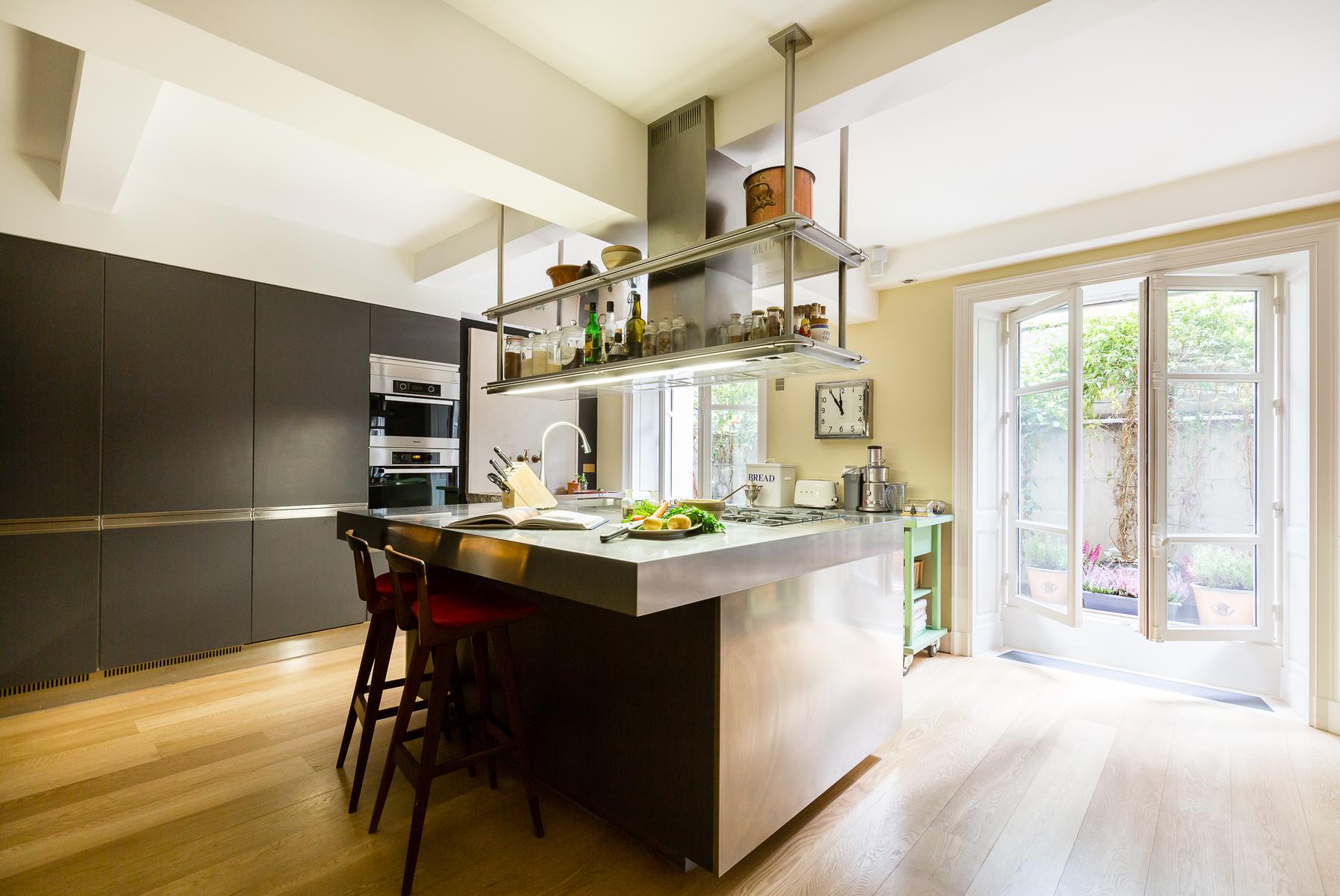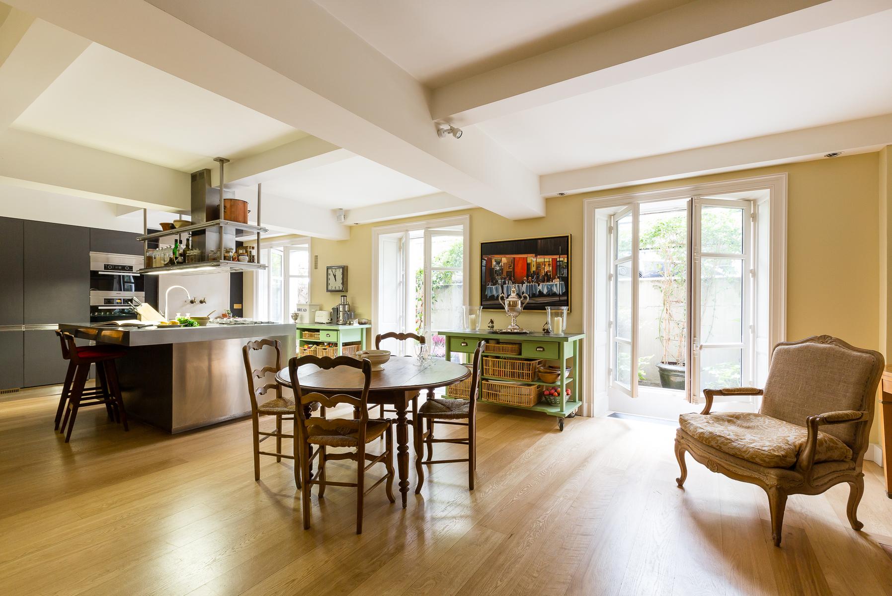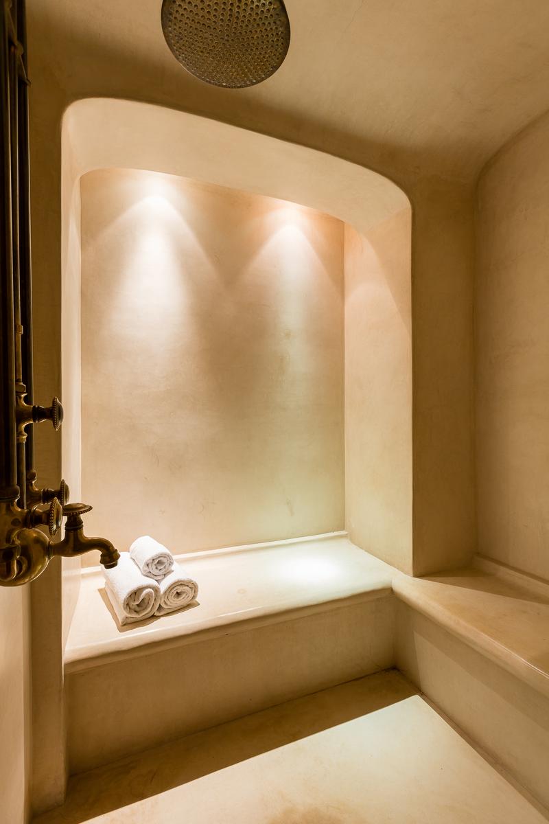 En dessous, il y a la cuisine, où une table classique se trouve en face d’un bar élégant, et un salon rouge et or qui jouxte un hammam. Et au premier étage, vous trouverez un cabinet de toilette et les deux autres chambres à coucher – toutes deux décorées avec élégance et l’une avec salle de bain privative.