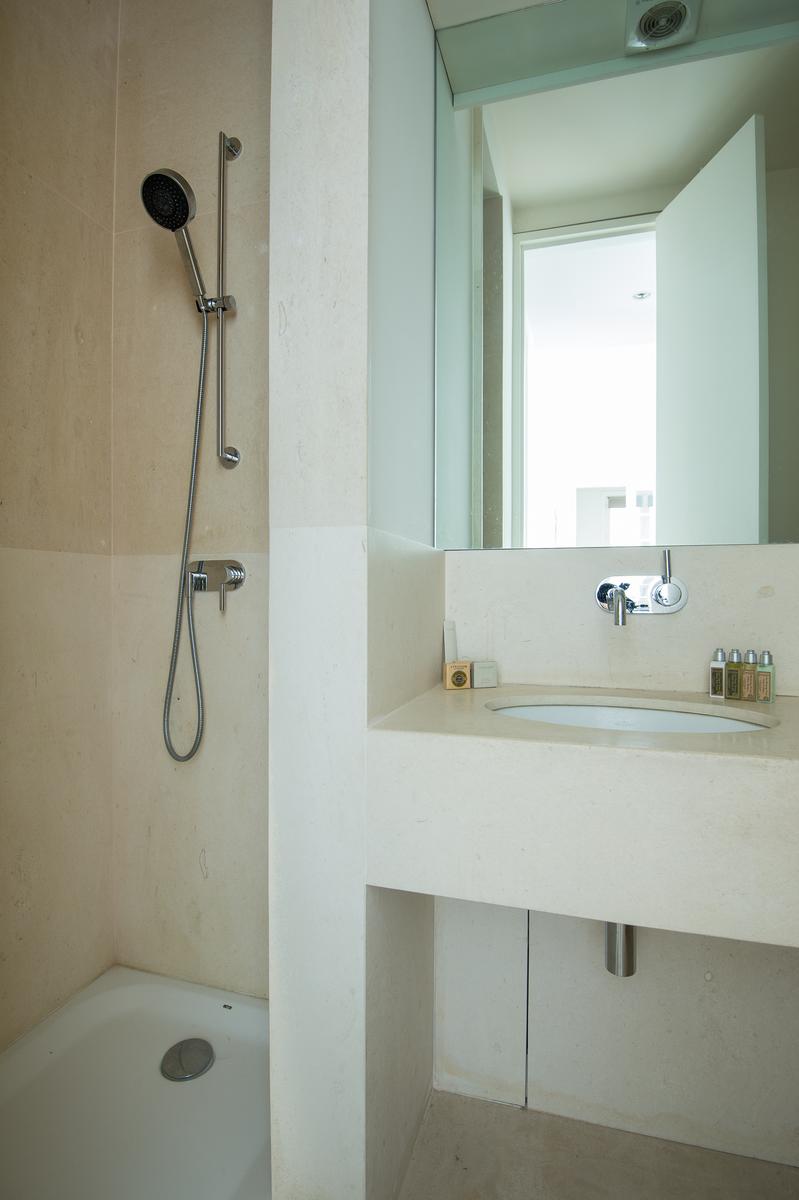 Enfin, il y a la chambre principale au bout du couloir à gauche de l’entrée. La palette de couleurs grises et les silhouettes nettes de cette chambre en font un endroit tentant pour se retirer, d’autant plus qu’il y a un bain à roulettes dans l’élégante salle de bain.