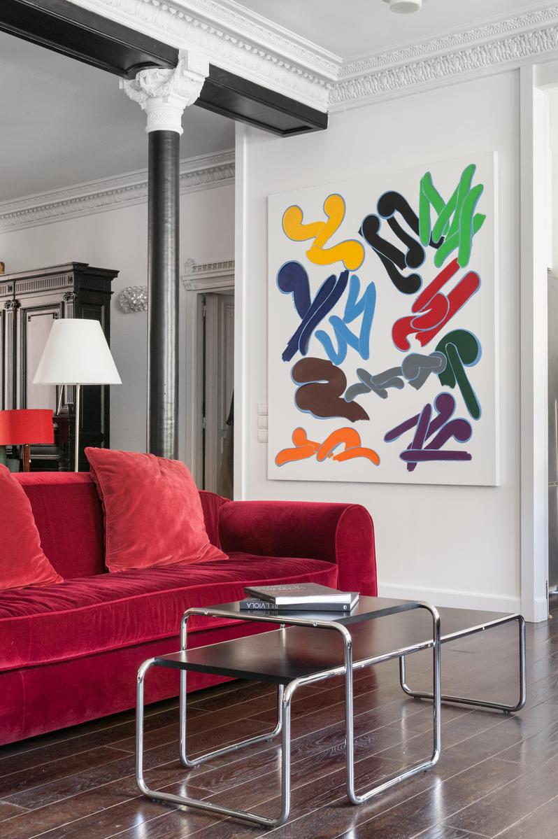 Couleurs vives, texte en gras, graphisme vibrant – Rue des Filles du Calvaire donne un coup de poing visuel audacieux. D’immenses fenêtres signalent les origines de l’espace en tant que moulin à eau, mais dans sa dernière incarnation, c’est à la fois une maison et une installation artistique : des toiles audacieuses aux couleurs sûres propulsent la propriété vers l’avenir. Des étagères anciennes pleines de livres et de journaux dans un coin salon confortable et un espace d’étude. Et dans le coin de la pièce ouverte, des verres à vin comme des ampoules éclairent la cuisine chromée.