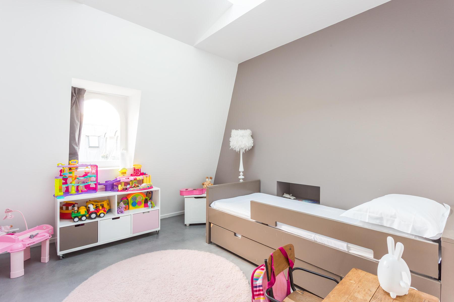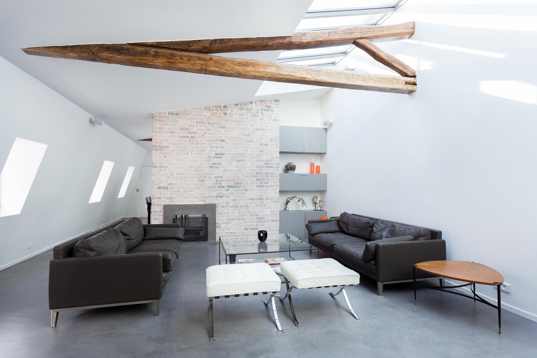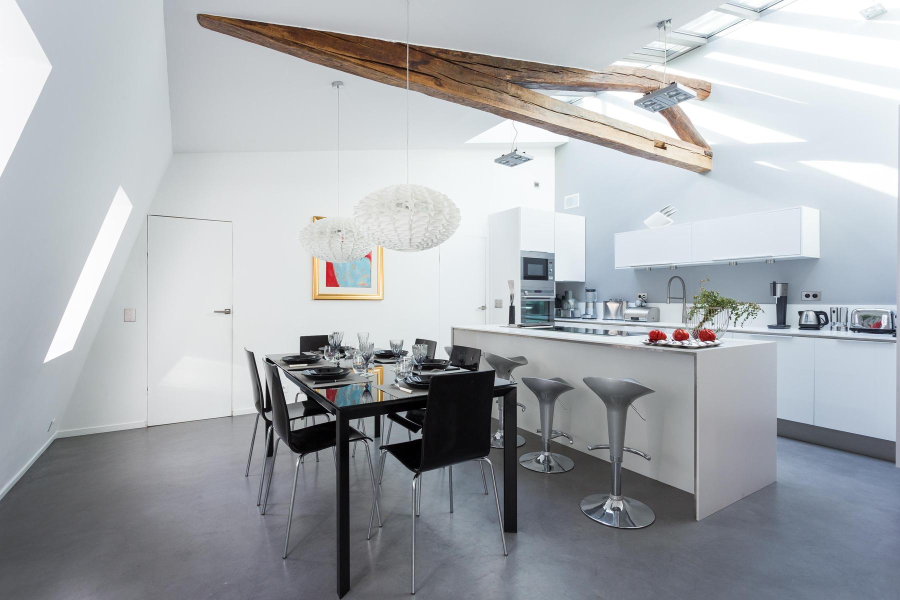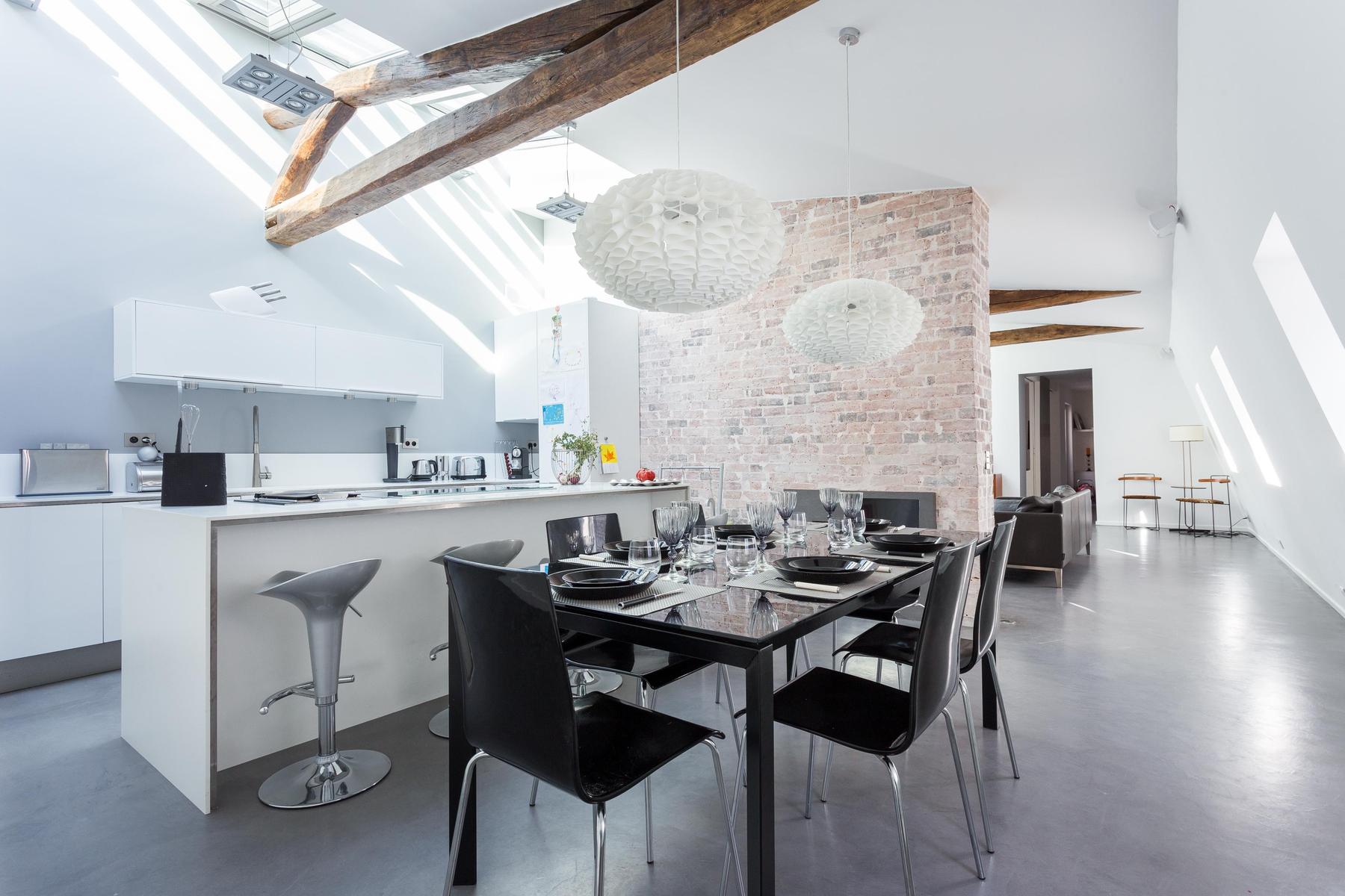 Un mélange harmonieux d’ancien et de neuf, cette maison remplit tout le cinquième étage et surplombe une cour tranquille. Chaque pièce est reliée au système de sonorisation à la fine pointe de la technologie – de la chambre des maîtres à la salle de bain atmosphérique. L’éclairage est également innovant. Vous trouverez des lustres contemporains suspendus au-dessus de la table à manger et un éclairage de style industriel au milieu des poutres en bois de la cuisine. Une cheminée originale se trouve entre ici et le salon, où le mobilier est épuré et propre. Mais les chambres des enfants sont plus colorées que cool et sont remplies de jouets et de livres.