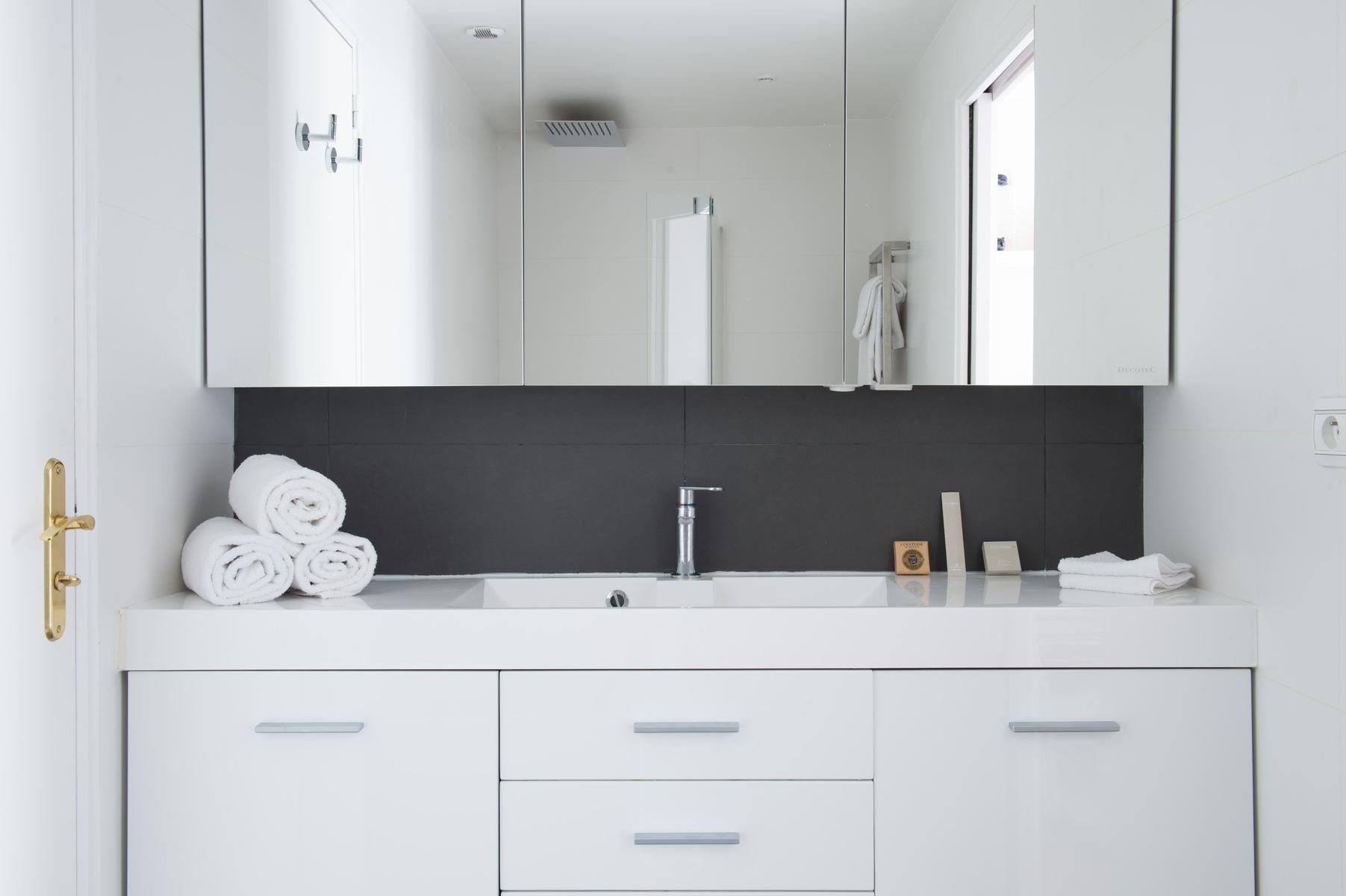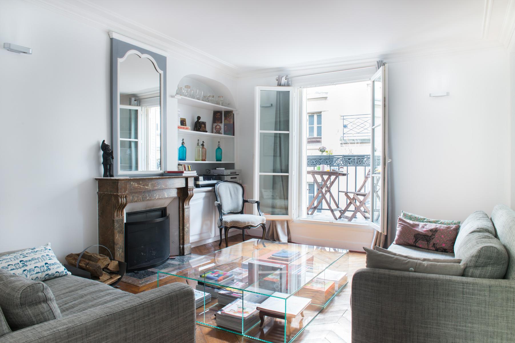 En face, vous trouverez l’espace de vie ouvert. Deux canapés gris clair face à la cheminée ornementale en marbre, devant laquelle se trouve un ensemble de portes françaises donnant sur un petit balcon. Des peintures aux couleurs douces, des statuettes de caractère et des bouteilles en verre antiques font de cette maison tout simplement chic.