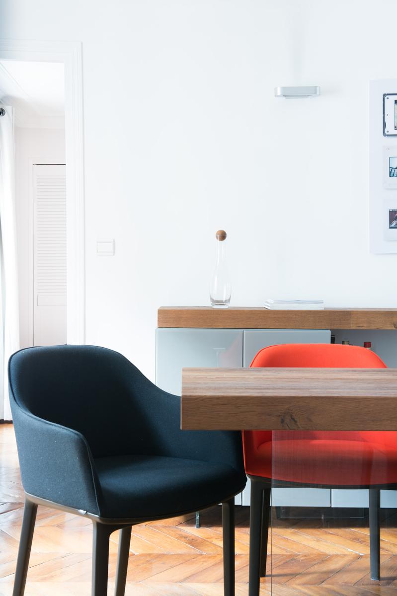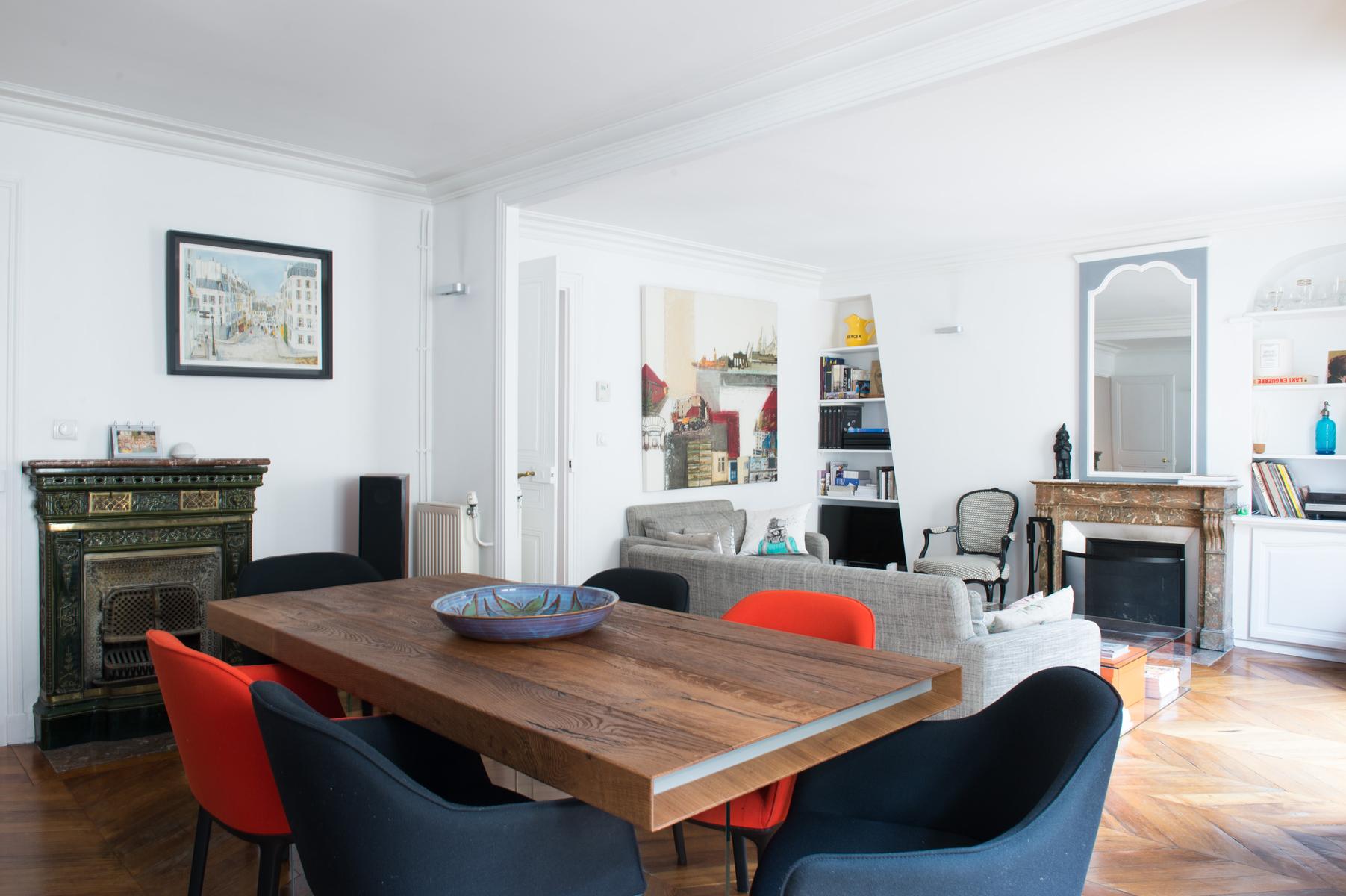 Cette maison est située à quatre étages au-dessus des restaurants et cafés excentriques de South Pigalle. La porte d’entrée s’ouvre sur un couloir, où se trouvent à droite le vestiaire soigné et la salle de bains principale, avec baignoire et douche en forêt tropicale. La salle de bains est reliée à la chambre double avec parquet (également accessible depuis la salle à manger). Puis, à gauche, vous voyez la cuisine monochrome – un espace élégant et pratique qui fait allusion aux tendances culinaires de vos hôtes. Ensuite se trouve la chambre à coucher principale, dont le caractère est donné par sa carte encadrée et ses étagères pleines.