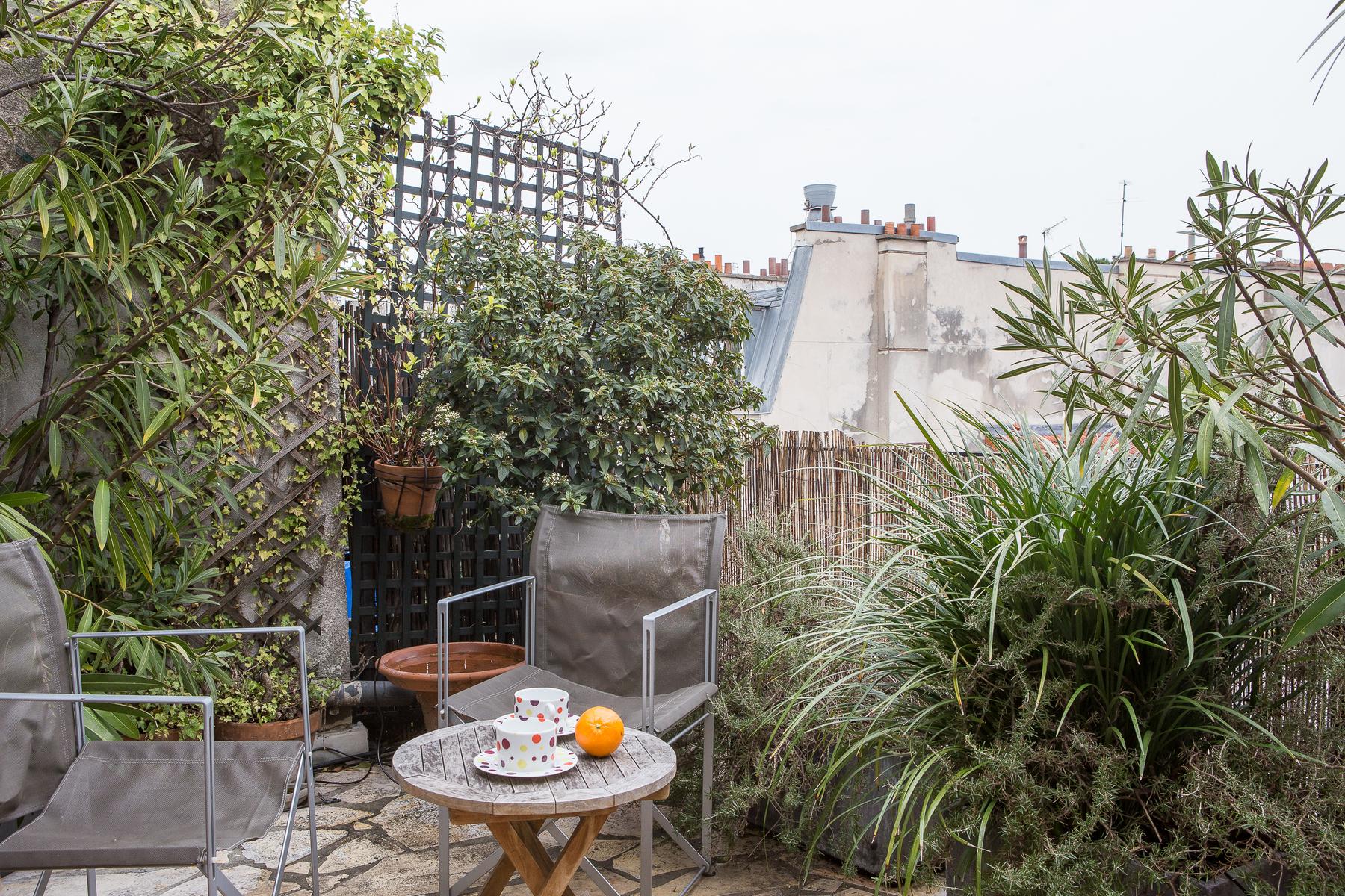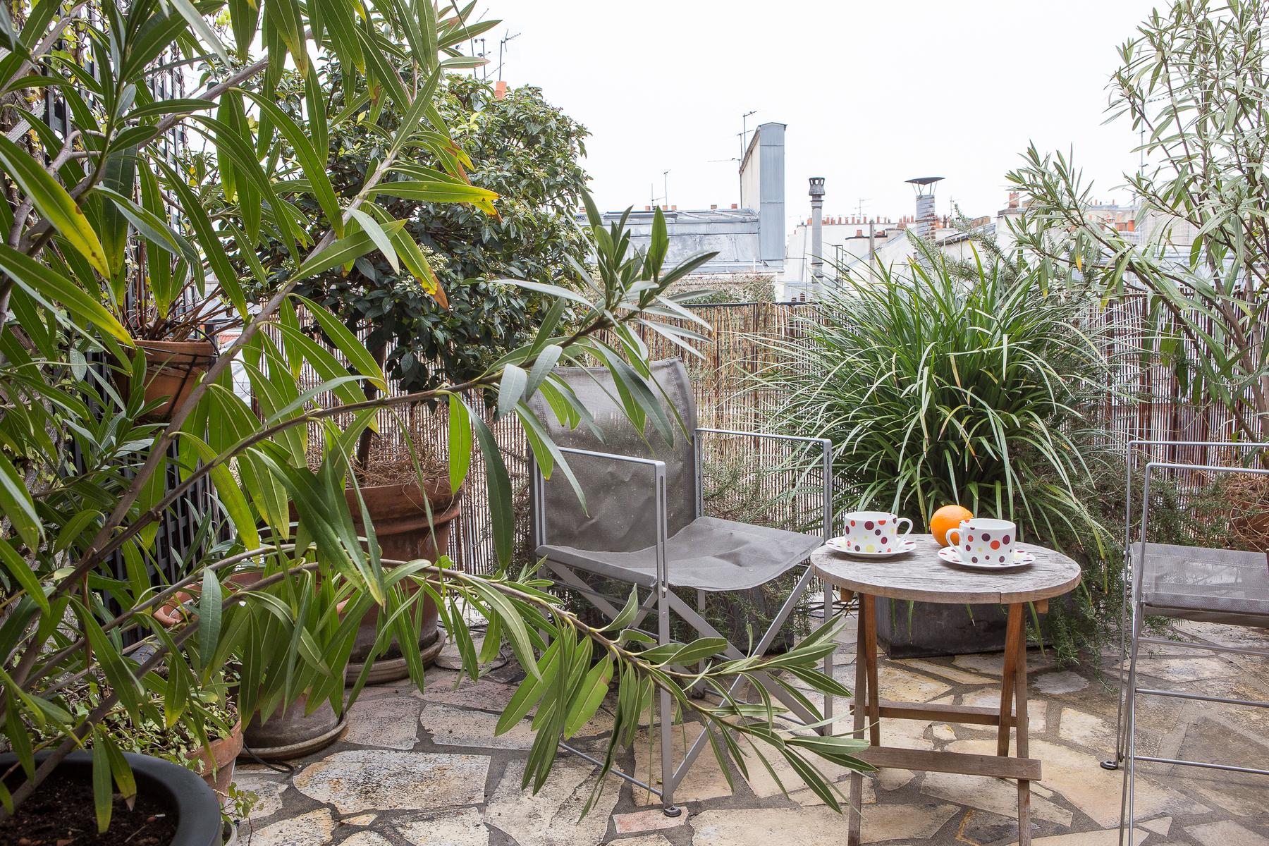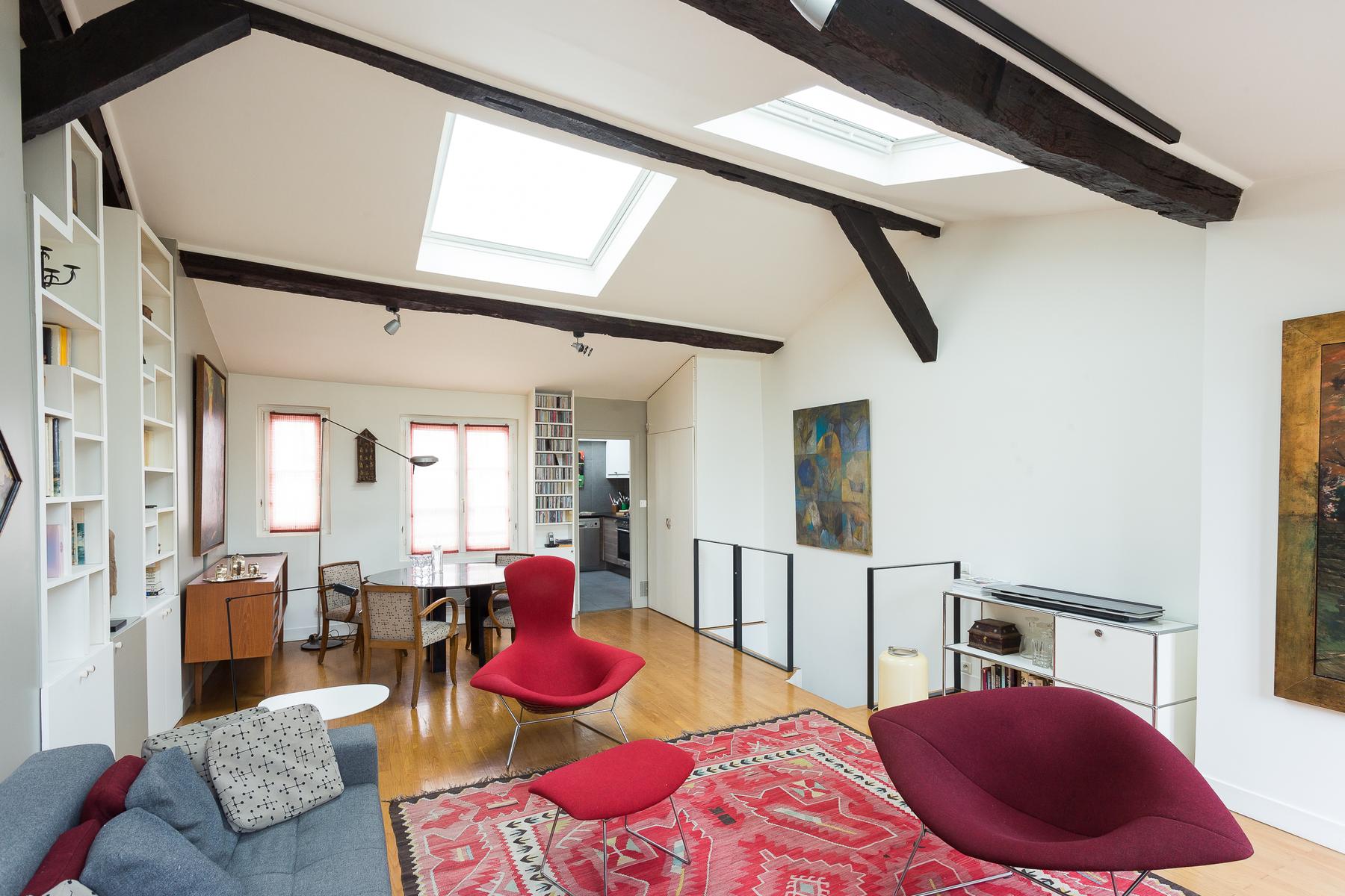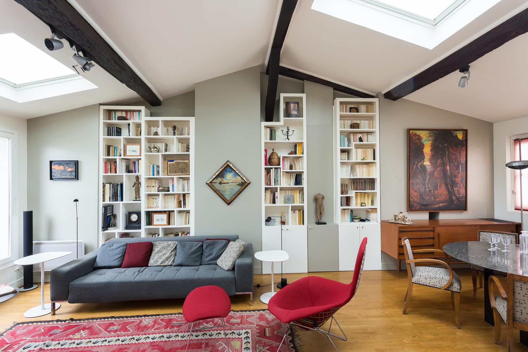 Un escalier vous mène au salon de la rue des Petits Carreaux, qui a des planchers de bois et des plafonds à poutres apparentes. A l’une des extrémités se trouve une table à manger en granit, juste après laquelle se trouve la cuisine. Et à l’autre, il y a un coin salon avec un canapé, deux fauteuils contemporains et beaucoup de beaux livres et d’œuvres d’art. De là, les fenêtres s’ouvrent sur un autre balcon.