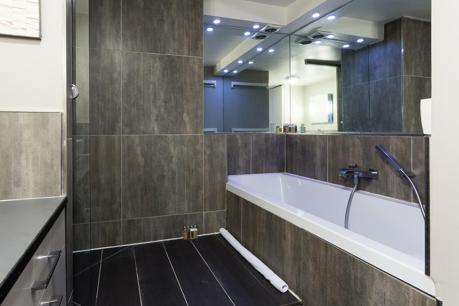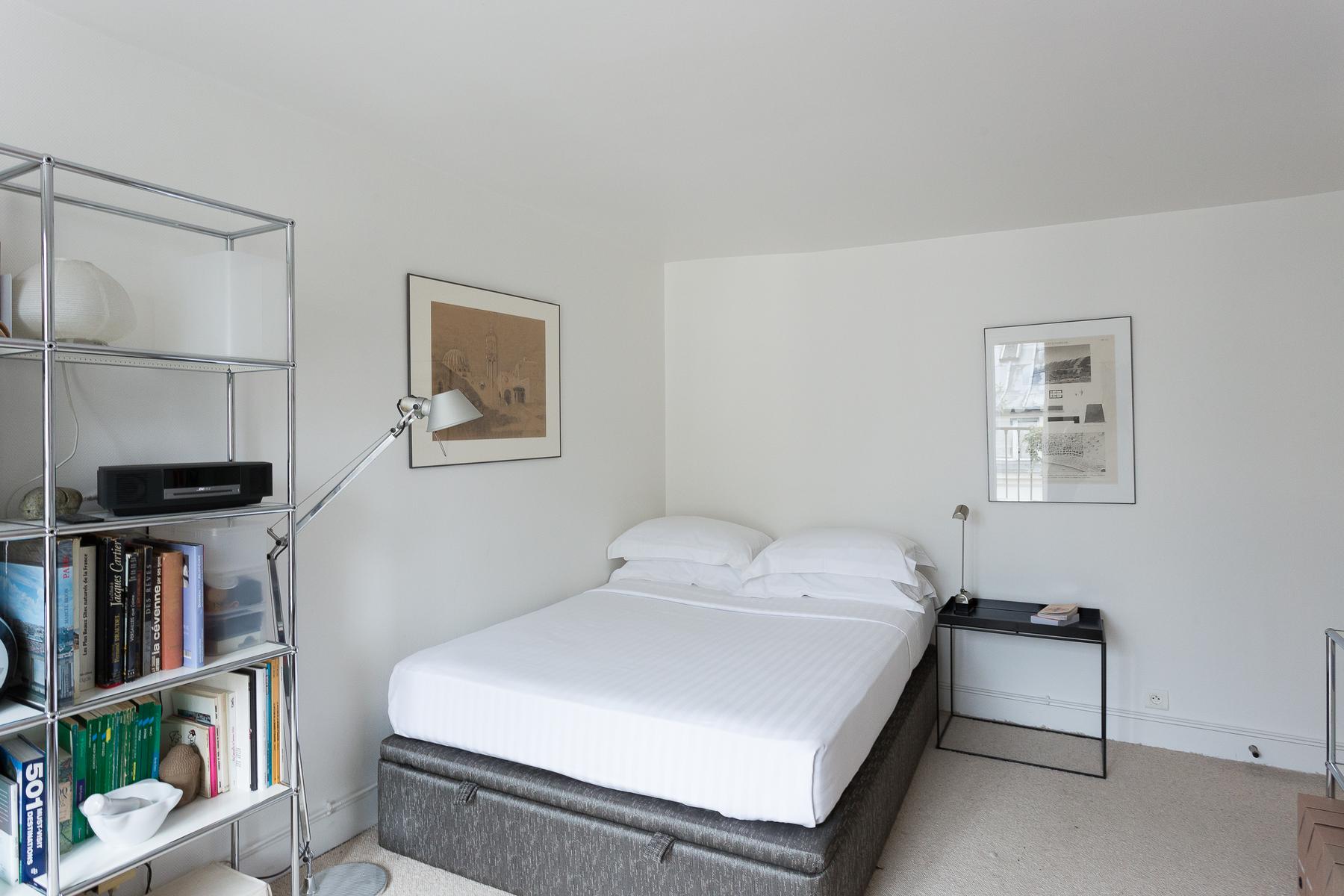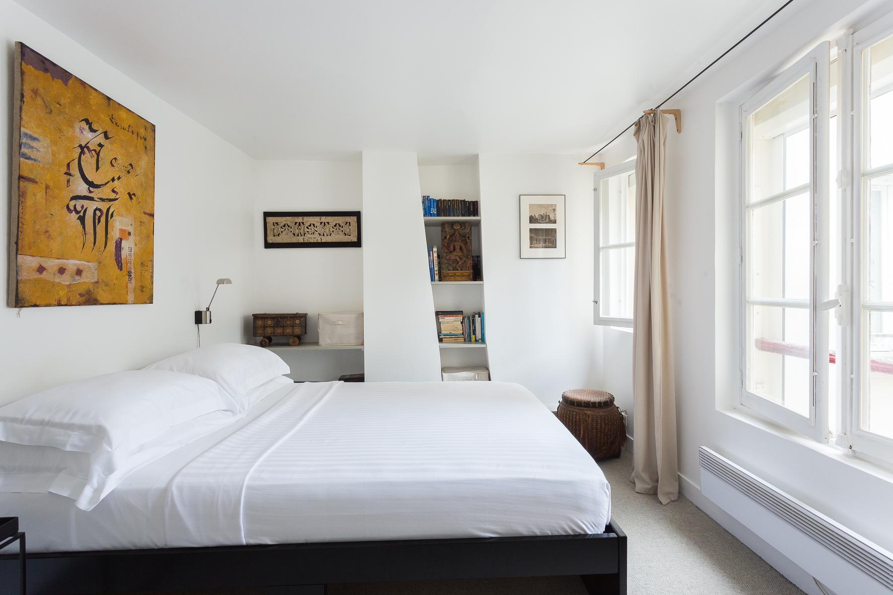 Aussi raffinée que cette partie appréciée de Paris, cette maison du cinquième étage vaut la peine d’être escaladée. La porte d’entrée donne sur un couloir qui mène d’abord à la chambre des maîtres. Peint en blanc et simplement meublé, il est rendu caractère par de nombreuses œuvres d’art et antiquités exotiques. Au-delà, il y a une salle de toilette et la salle de bain aux lignes pures et aux miroirs, et au bout du couloir, il y a la deuxième chambre à coucher. Aussi peint en blanc, il a un lit double, un bureau et un petit balcon.