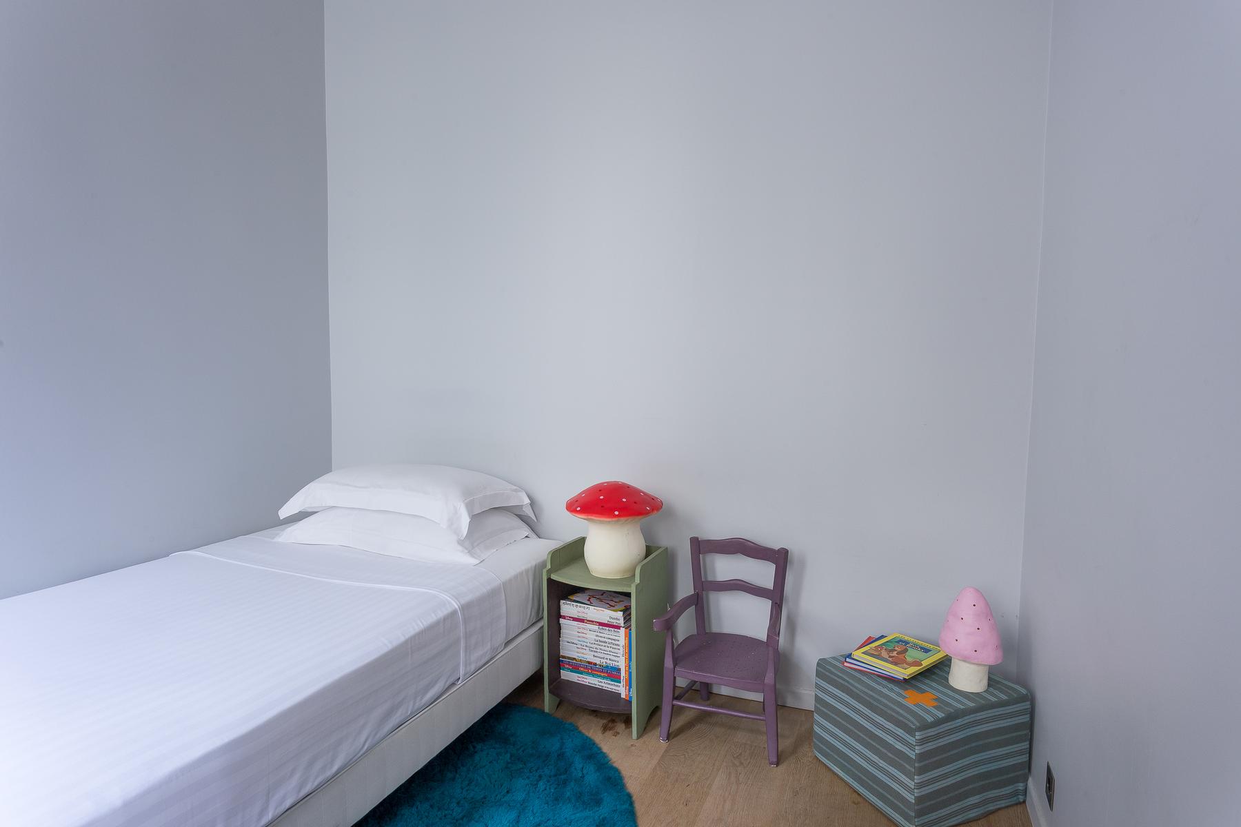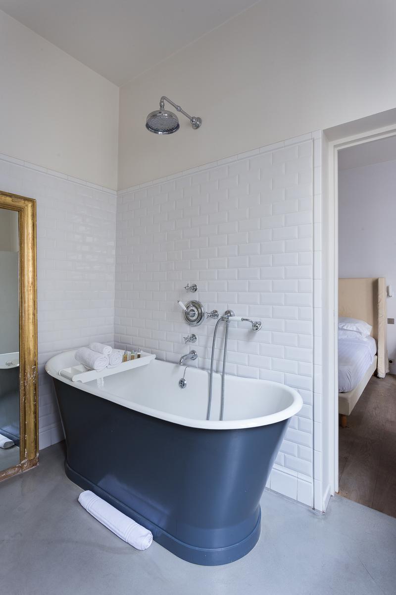 Ensuite, par une deuxième porte, se trouve la chambre principale. C’est un espace discret, avec un lit queen-size et une longue fenêtre bordée de rideaux argentés. La porte de gauche ouvre sur la deuxième chambre (bleu pâle, avec quelques accessoires ludiques et un petit lit double), tandis que celle de droite mène à une salle de bains attenante avec une belle baignoire à roulettes avec douche intégrée.