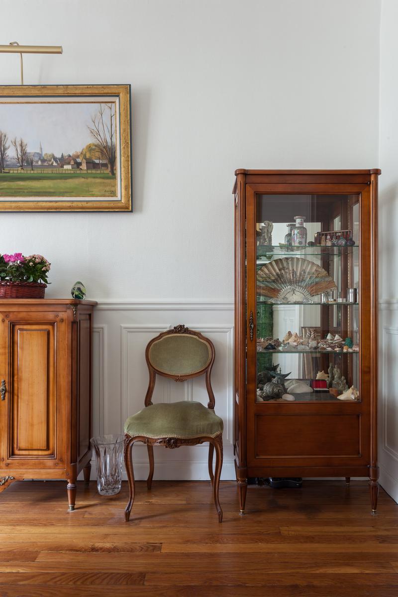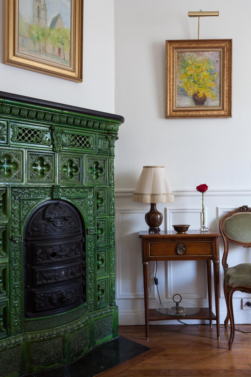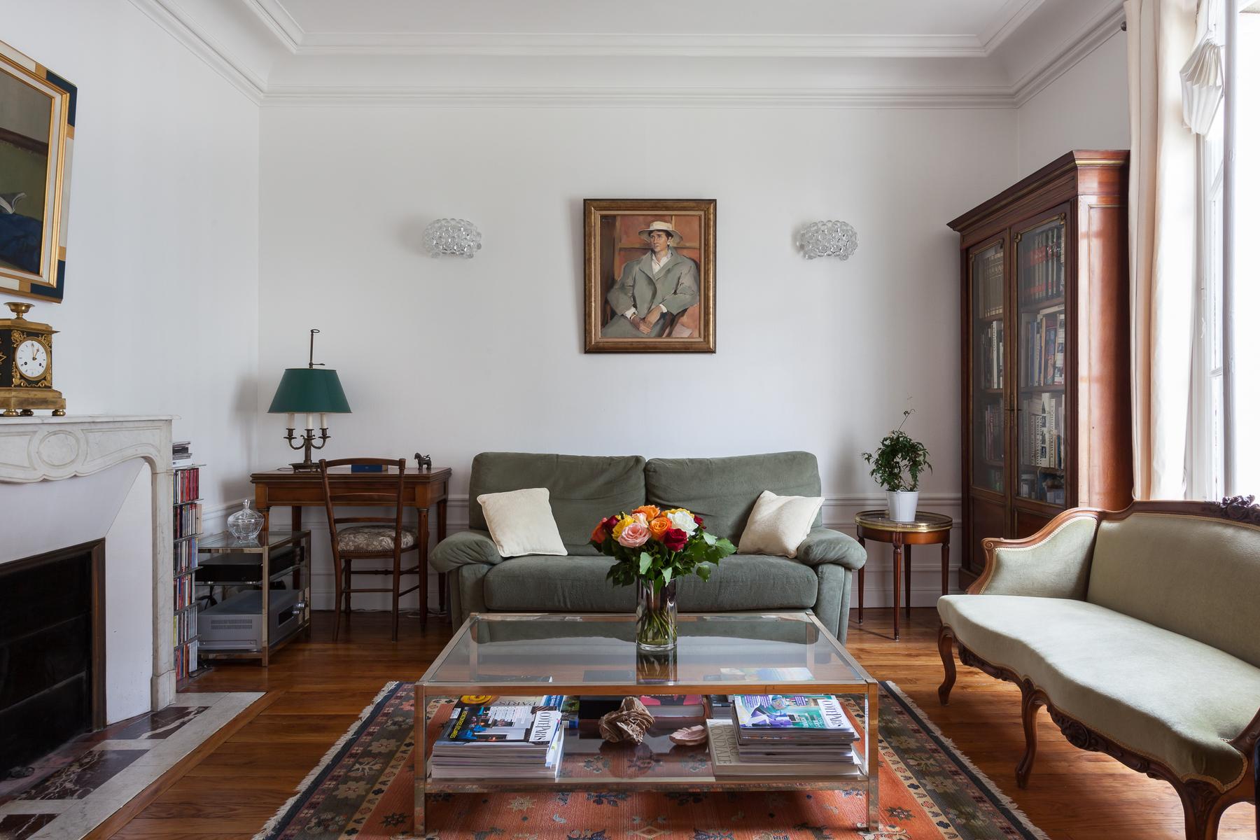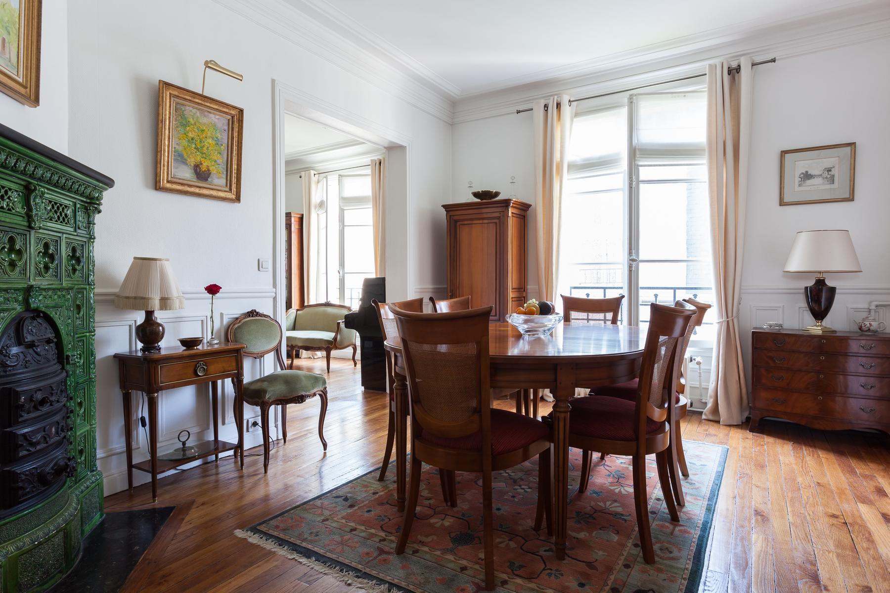 Ouvrez la porte de la rue du Cherche-Midi V pour trouver les planchers de bois, les hauts plafonds et les moulures délicates d’un intérieur parisien par excellence. Chaque chambre bifurque d’un couloir central, le premier à gauche est le salon élégant. Ici, des meubles rembourrés en velours vert entourent une table basse en verre à côté d’une étagère ancienne en acajou. Les portes-fenêtres s’ouvrent sur une cour tranquille. Après un piano poli, une arcade s’ouvre sur la salle à manger. Un poêle à bois du début du siècle suit l’esthétique traditionnelle, des peintures encadrées tapissent les murs et il y a une table pour six personnes.