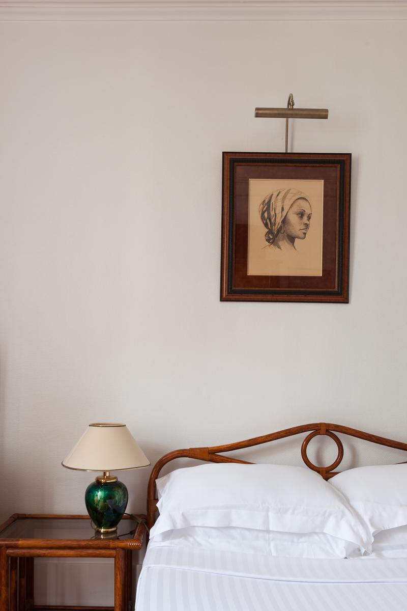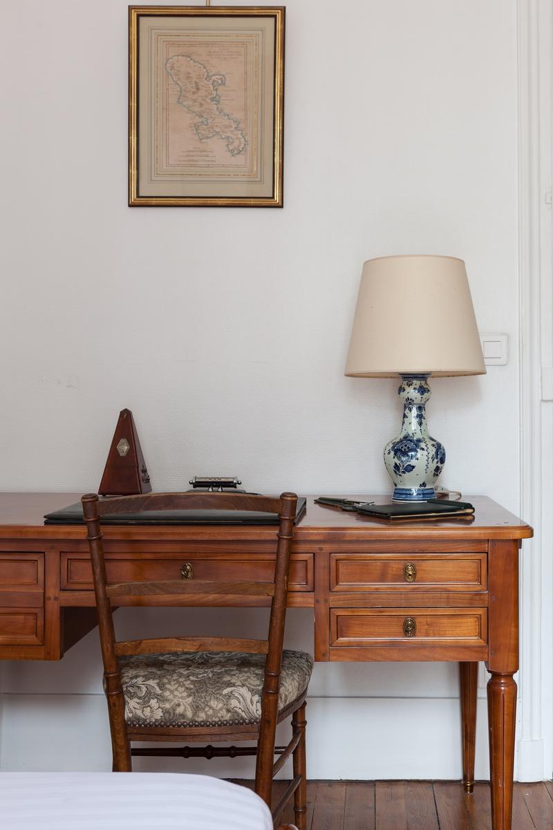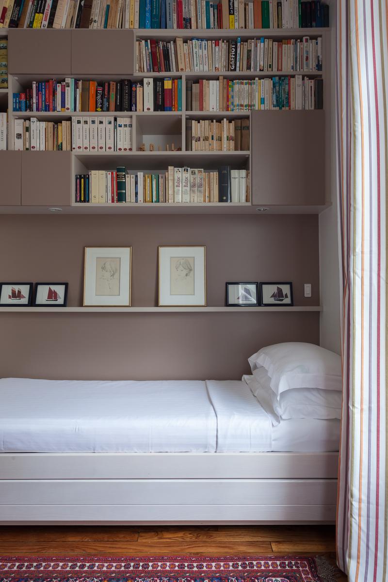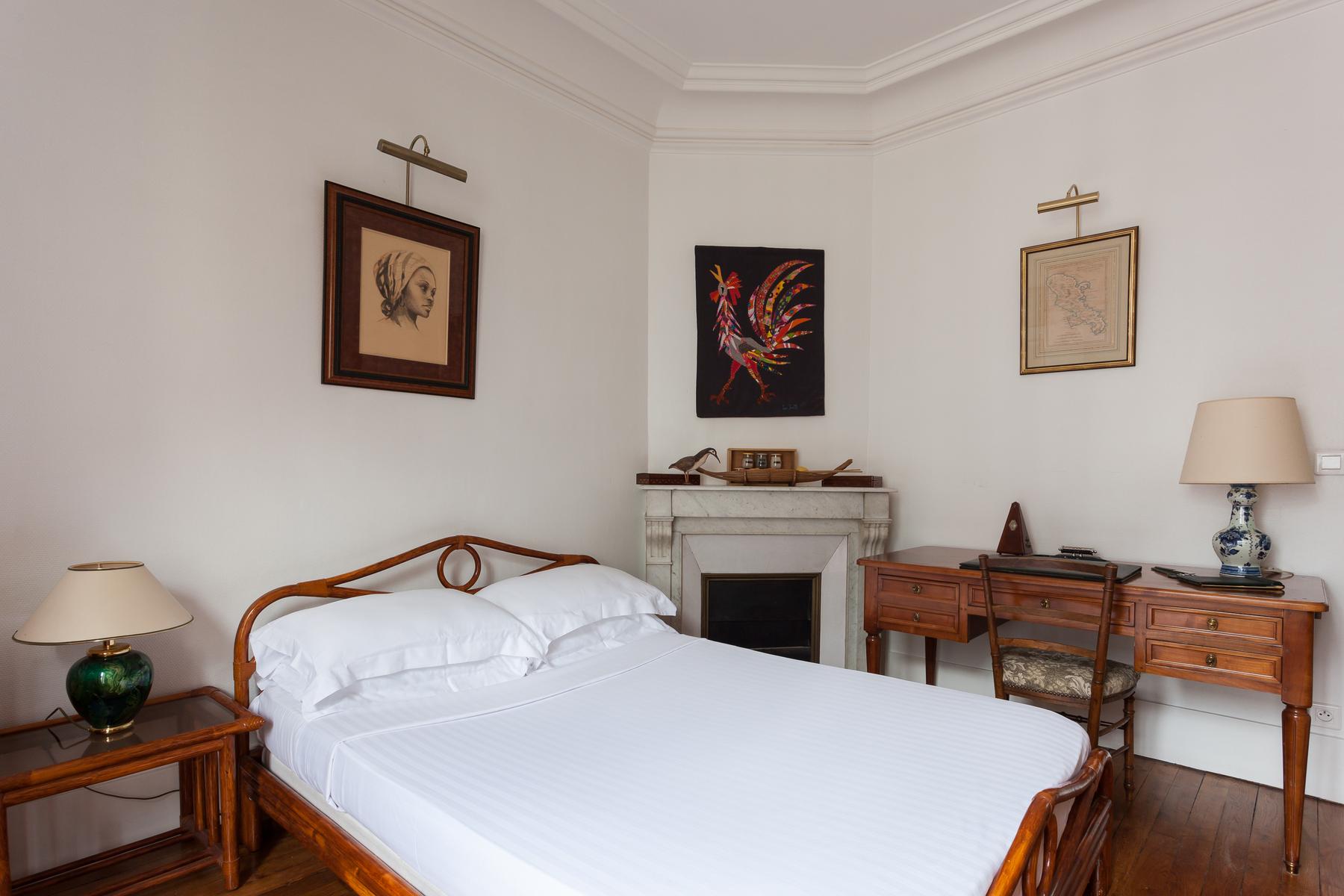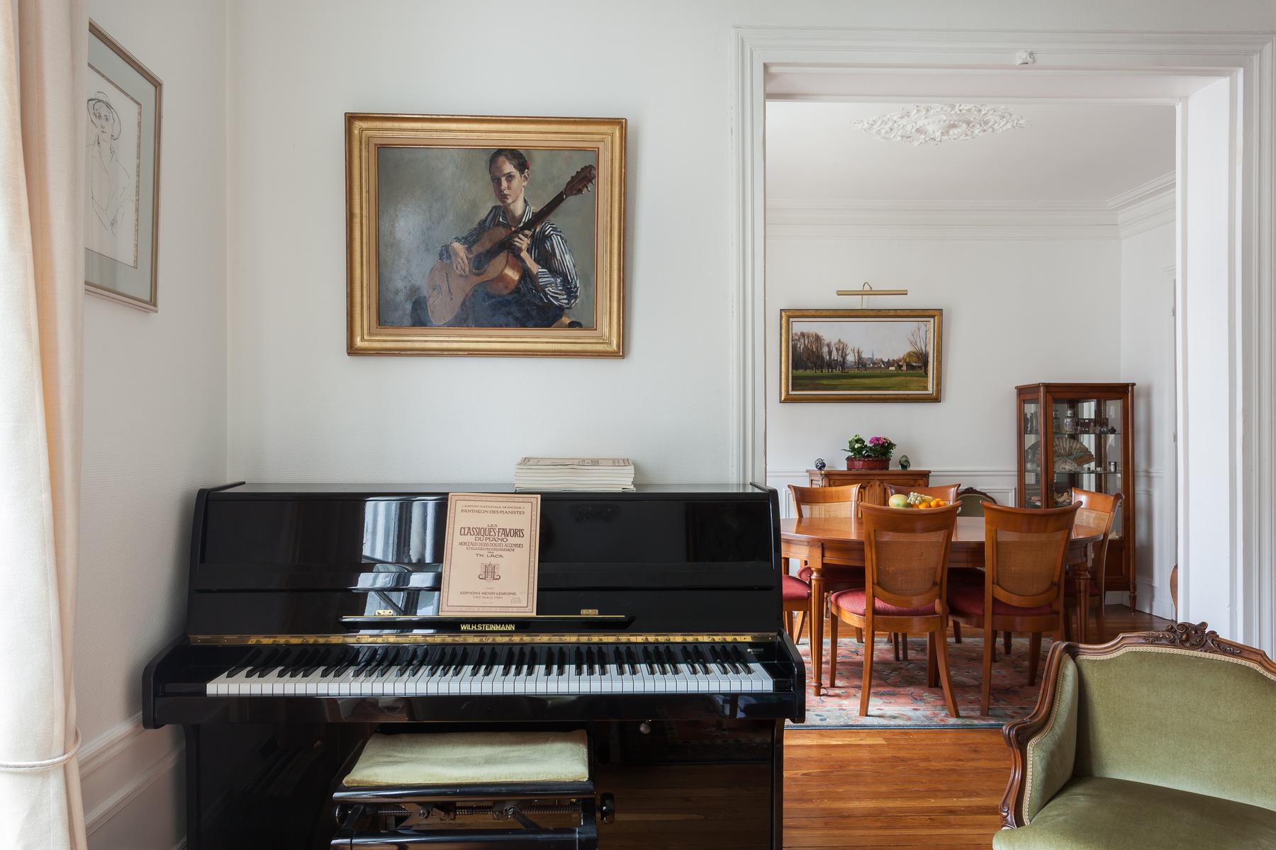 Ouvrez la porte de la rue du Cherche-Midi V pour trouver les planchers de bois, les hauts plafonds et les moulures délicates d’un intérieur parisien par excellence. Chaque chambre bifurque d’un couloir central, le premier à gauche est le salon élégant. Ici, des meubles rembourrés en velours vert entourent une table basse en verre à côté d’une étagère ancienne en acajou. Les portes-fenêtres s’ouvrent sur une cour tranquille. Après un piano poli, une arcade s’ouvre sur la salle à manger. Un poêle à bois du début du siècle suit l’esthétique traditionnelle, des peintures encadrées tapissent les murs et il y a une table pour six personnes.