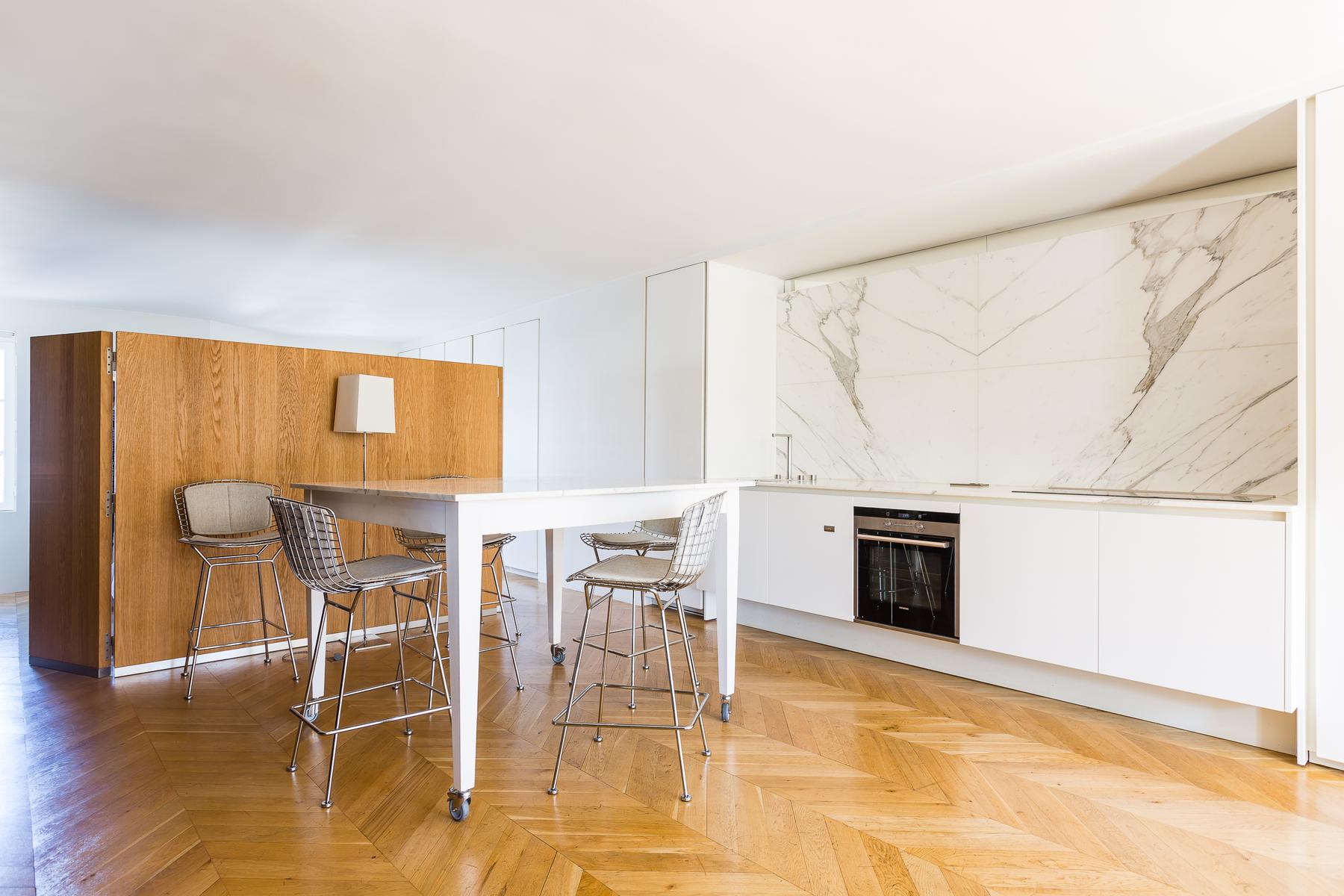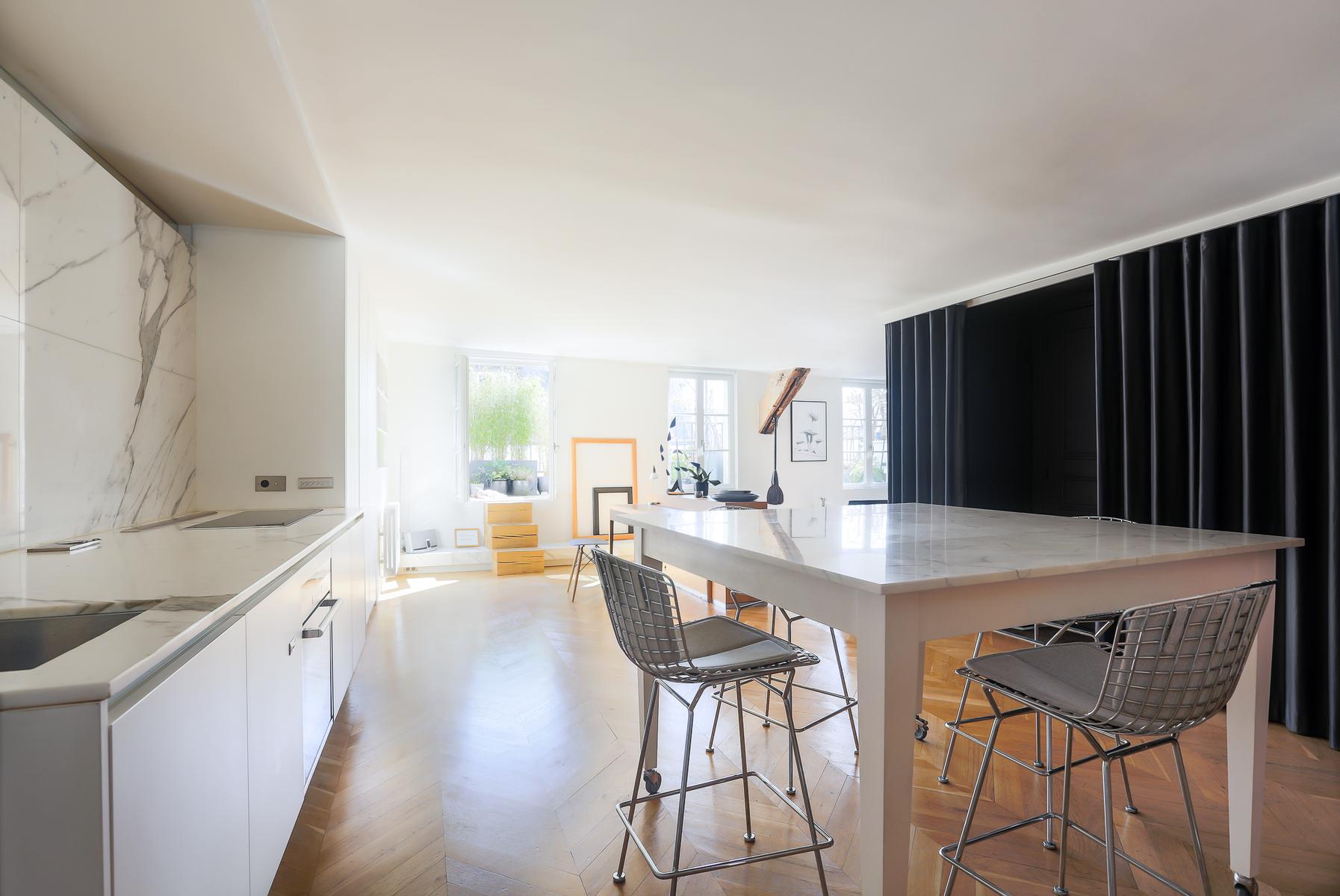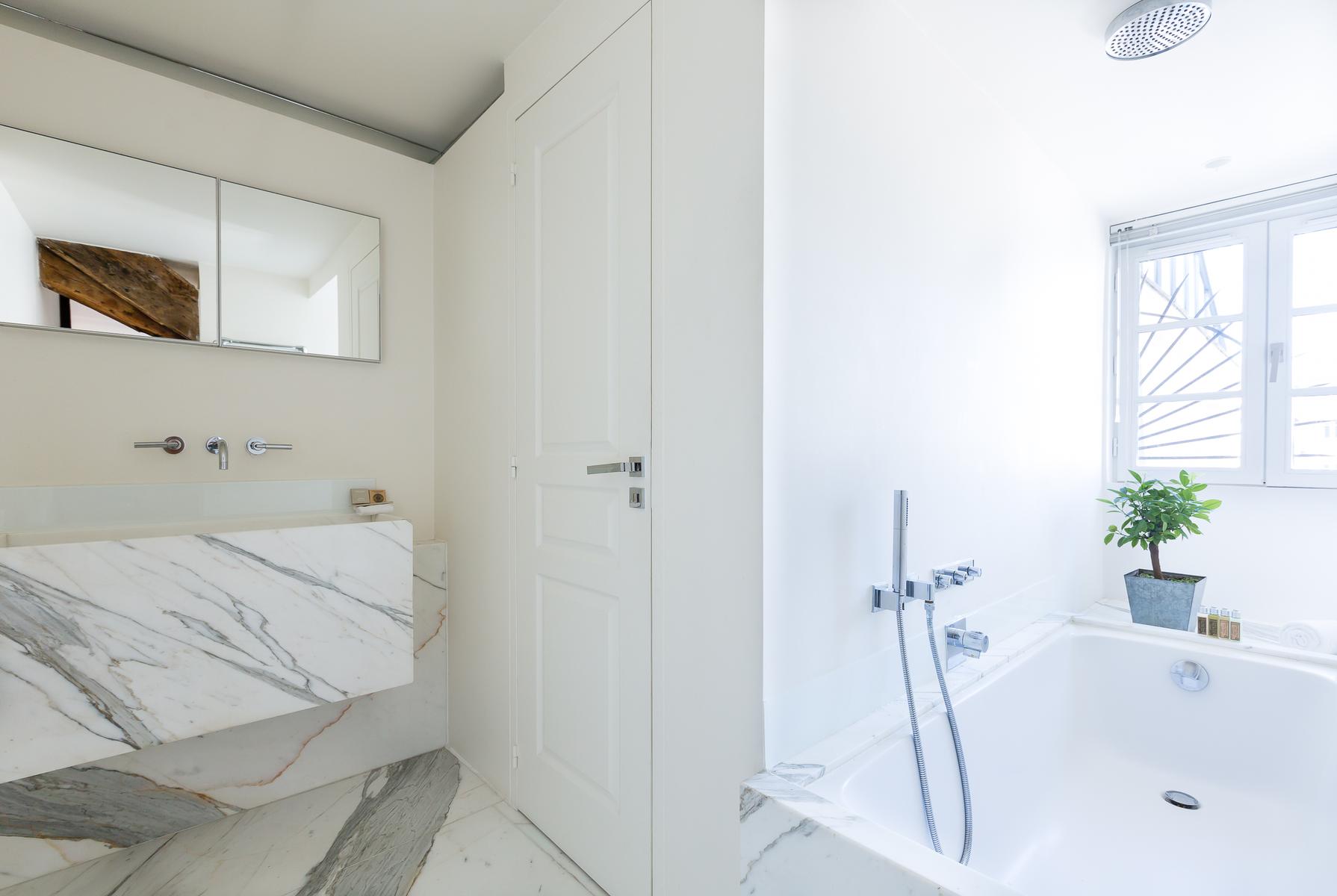 La rue du Faubourg Poissonnière doit être l’un des endroits les plus élégants de l’Opéra. La porte d’entrée donne directement sur la cuisine, qui a un mur de marbre et une grande table à manger avec six tabourets. A gauche, cachée derrière un écran en bois, se trouve la chambre principale – entièrement blanche, avec un lit queen-size et des armoires élégantes. Elle jouxte la salle de bain en marbre, avec sa spacieuse baignoire (avec douche intégrée).