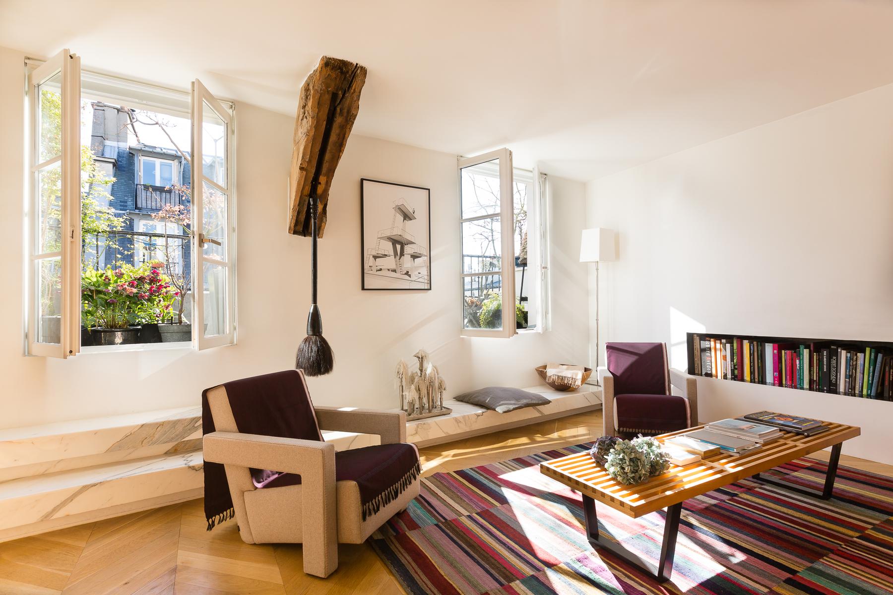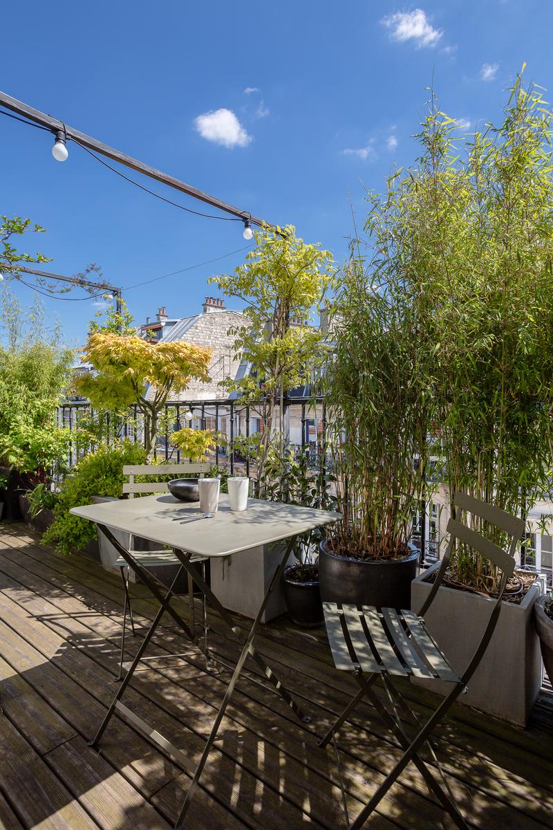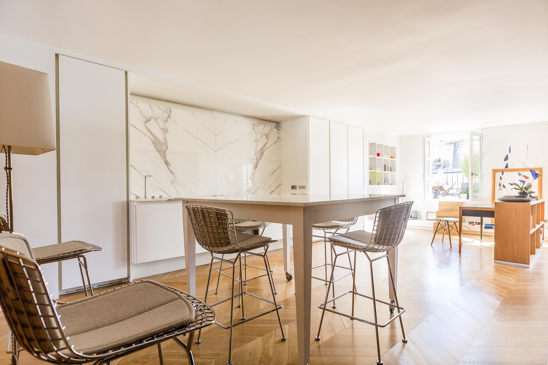 La rue du Faubourg Poissonnière doit être l’un des endroits les plus élégants de l’Opéra. La porte d’entrée donne directement sur la cuisine, qui a un mur de marbre et une grande table à manger avec six tabourets. A gauche, cachée derrière un écran en bois, se trouve la chambre principale – entièrement blanche, avec un lit queen-size et des armoires élégantes. Elle jouxte la salle de bain en marbre, avec sa spacieuse baignoire (avec douche intégrée).