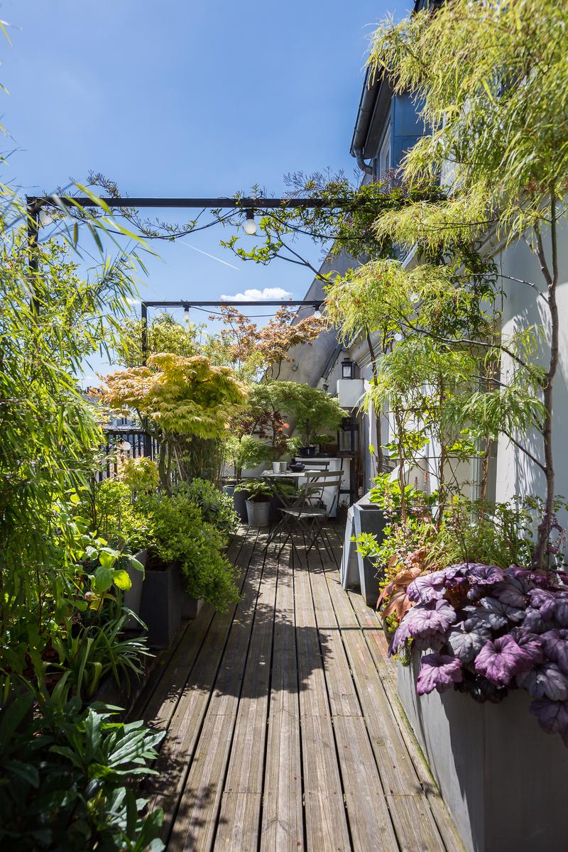Et puis, à droite de la cuisine, vous trouverez le salon, un espace élégamment conçu. À l’extrémité proche, il y a un petit bureau, et au-delà, il y a un coin salon avec un élégant canapé et des fauteuils, un tapis vif et plusieurs œuvres d’art inhabituelles. De plus, des marches en bois mènent à l’une des fenêtres de cette pièce, qui donne sur une terrasse verdoyante avec table et chaises.