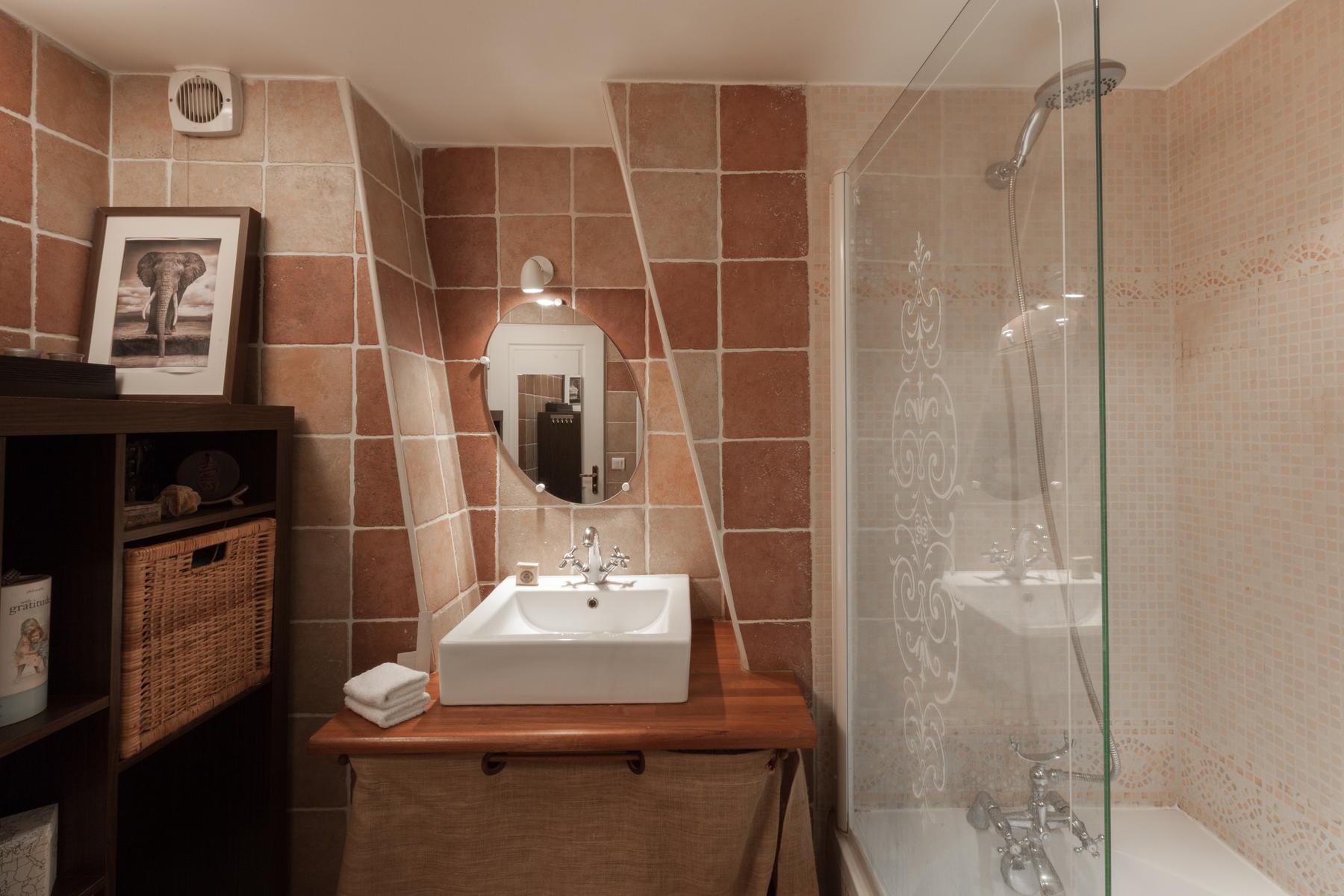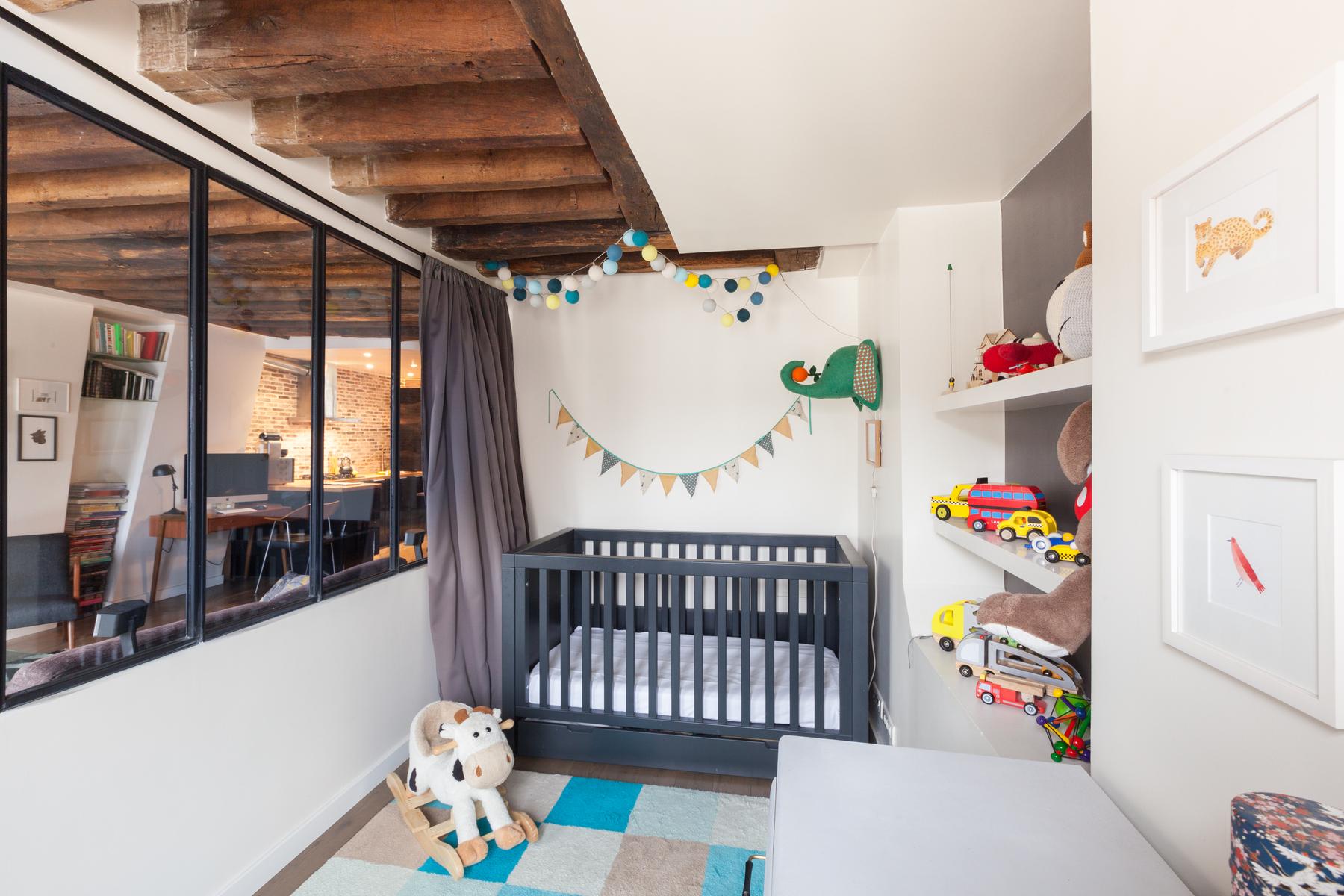 Situé sur un ancien boulevard du Temple, il n’est pas surprenant que le bâtiment du Faubourg Saint-Martin soit historique. Dans le salon accueillant, les planchers de bois donnent lieu à des fenêtres drapées et des poutres de bois foncé courent le long du plafond. Des fenêtres d’atelier séparent la jolie chambre d’enfant de l’espace de vie principal, ses empreintes animales douces contrastant avec les œuvres d’art plus audacieuses du salon. Et dans cette maison à aire ouverte, il y a aussi une chaise berçante doublée de peau d’agneau, près de la pile de magazines lustrés que vos hôtes collectionnent.