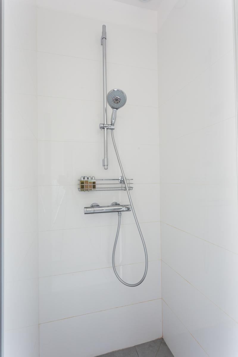 De retour à l’entrée, les autres chambres se trouvent sur la droite. Tout d’abord la salle de bains principale, puis les deuxième et troisième chambres à coucher. Et enfin, vous arriverez à la chambre principale bleue et blanche, qui a un lit queen-size et une salle de bain avec douche.