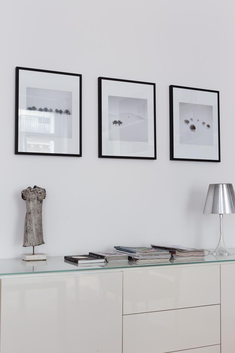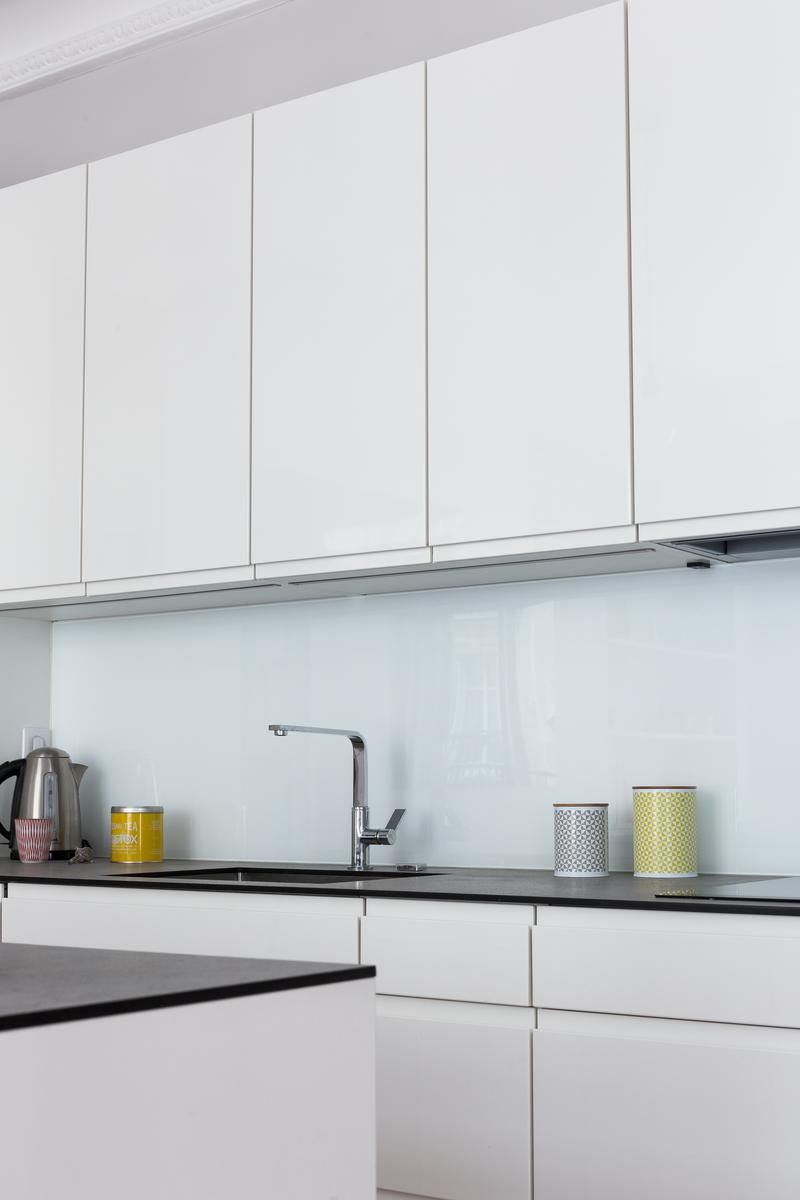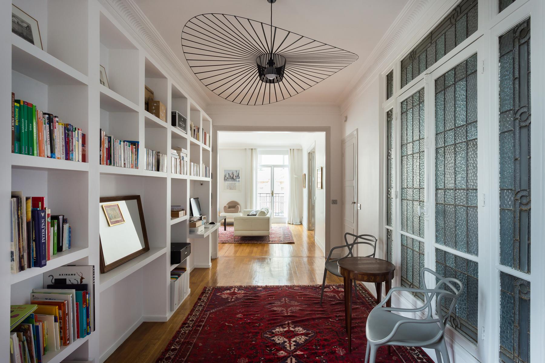 Dans un bâtiment Art Déco, un mélange de détails traditionnels charmants et de pièces contemporaines donne à cette maison son air sophistiqué. A gauche dans l’élégant hall d’entrée, vous trouverez deux salles de toilettes, puis le salon. Peint en blanc et plancher de bois, avec de longues fenêtres drapées de couleur pâle, c’est une collection d’œuvres d’art et de livres qui lui donne de la personnalité. Au centre, sur un tapis à motifs, un canapé et une paire de fauteuils anciens se font face sur une table basse propre. Au-delà du canapé, une porte mène à la cuisine, élégamment décorée en noir, gris et blanc, avec une table à manger élégante.