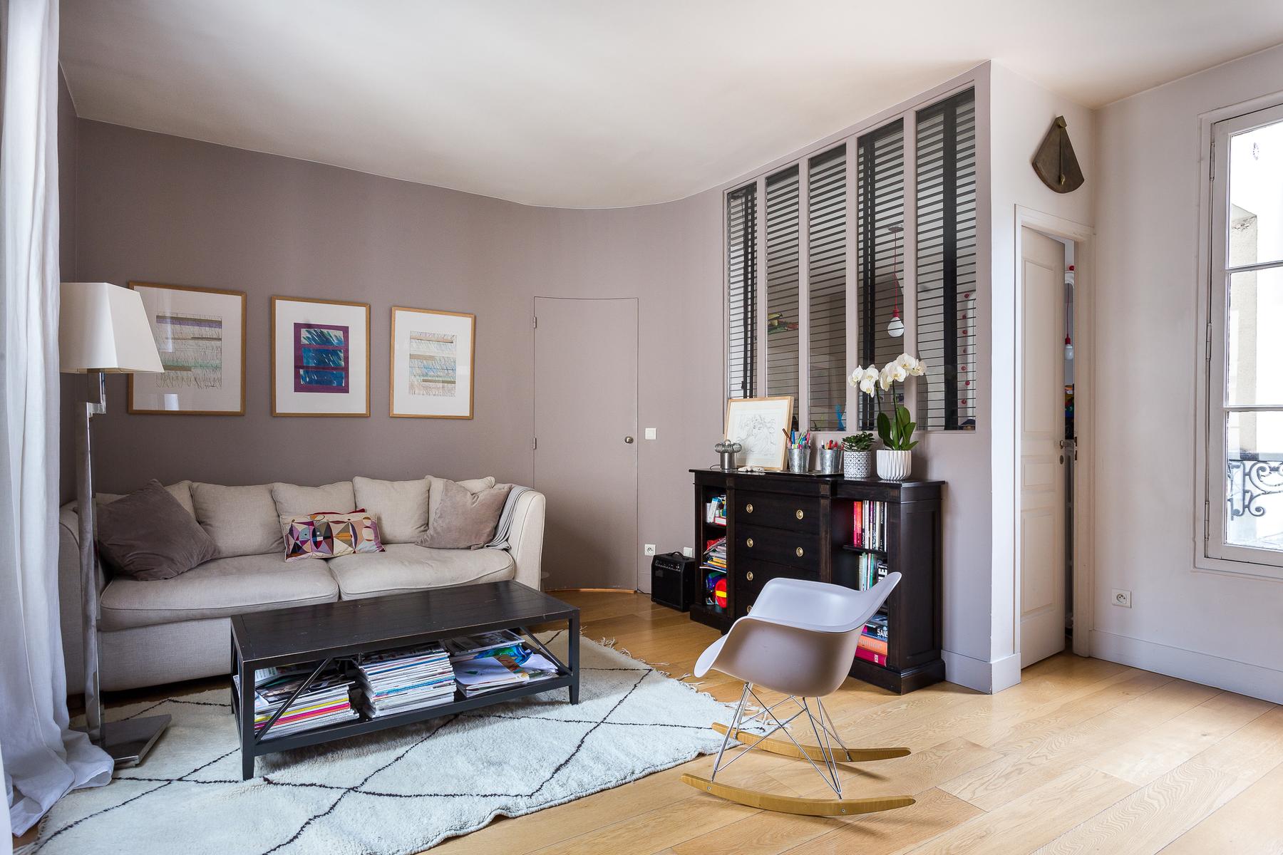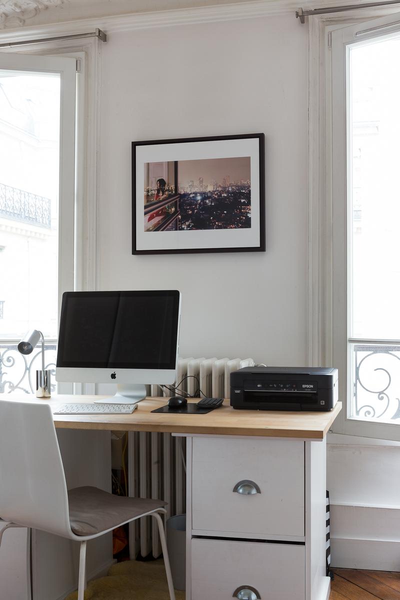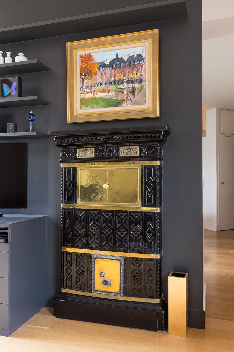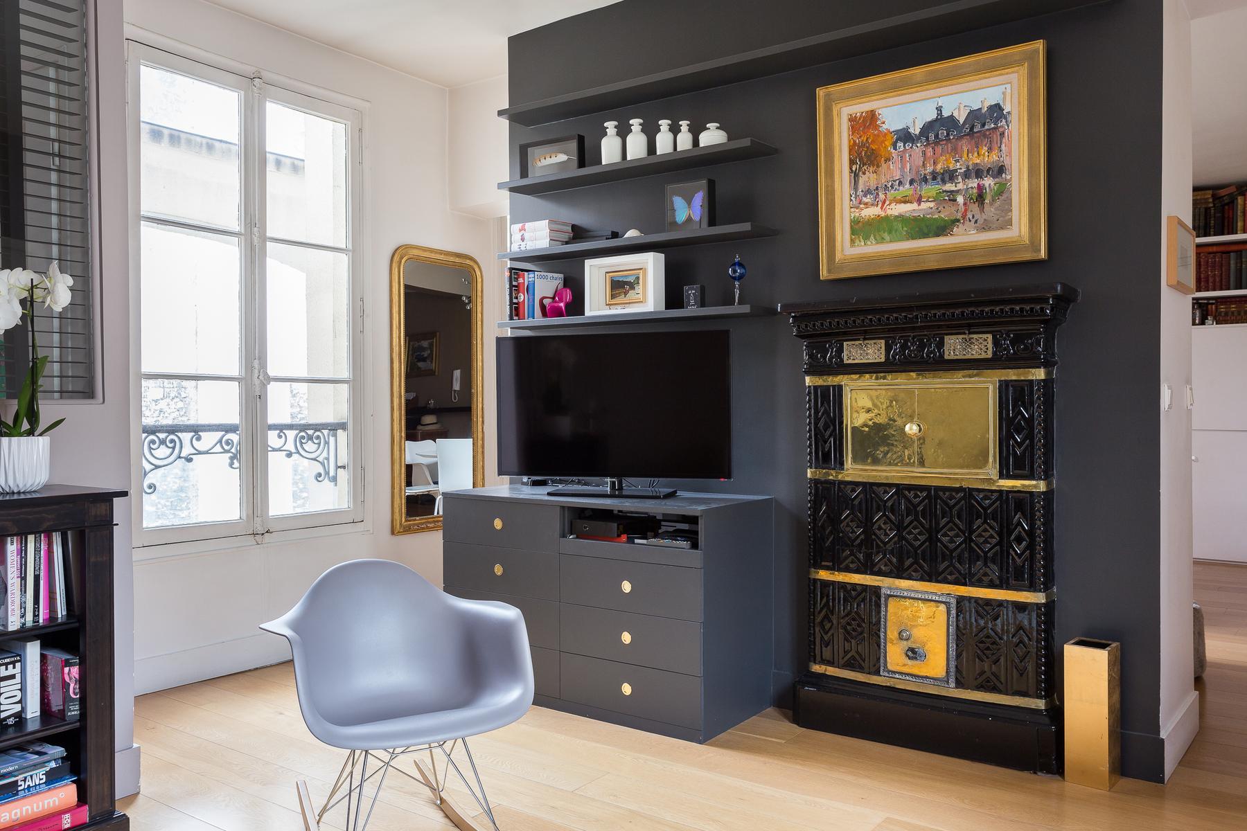 A la fois classique et contemporaine, cette maison de Saint-Germain-des-Prés est tout à fait chic. La porte d’entrée se trouve en haut de plusieurs volées d’escaliers (il n’y a pas d’ascenseur), et s’ouvre sur un couloir. Vous passez devant une salle de bains et passez devant la cuisine, où vous trouverez, en plus d’un coin cuisine élégant de couleur aubergine, une table de salle à manger élégante pour six personnes. Ensuite, les deux portes de chaque côté du piano de cette pièce vous mènent au salon – une pièce au plancher de bois peint en gris avec un poêle antique décoratif, un bureau encastré et un canapé, le tout entouré d’œuvres d’art diverses.