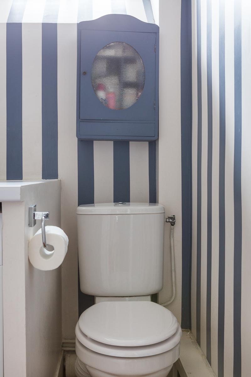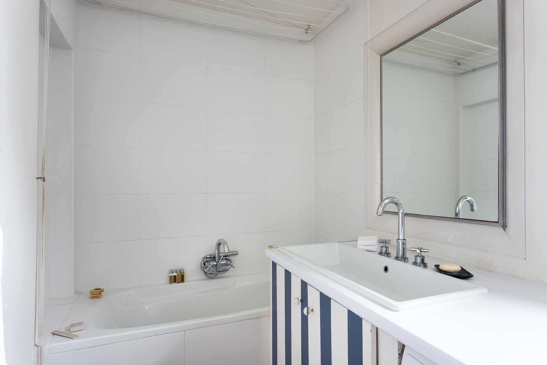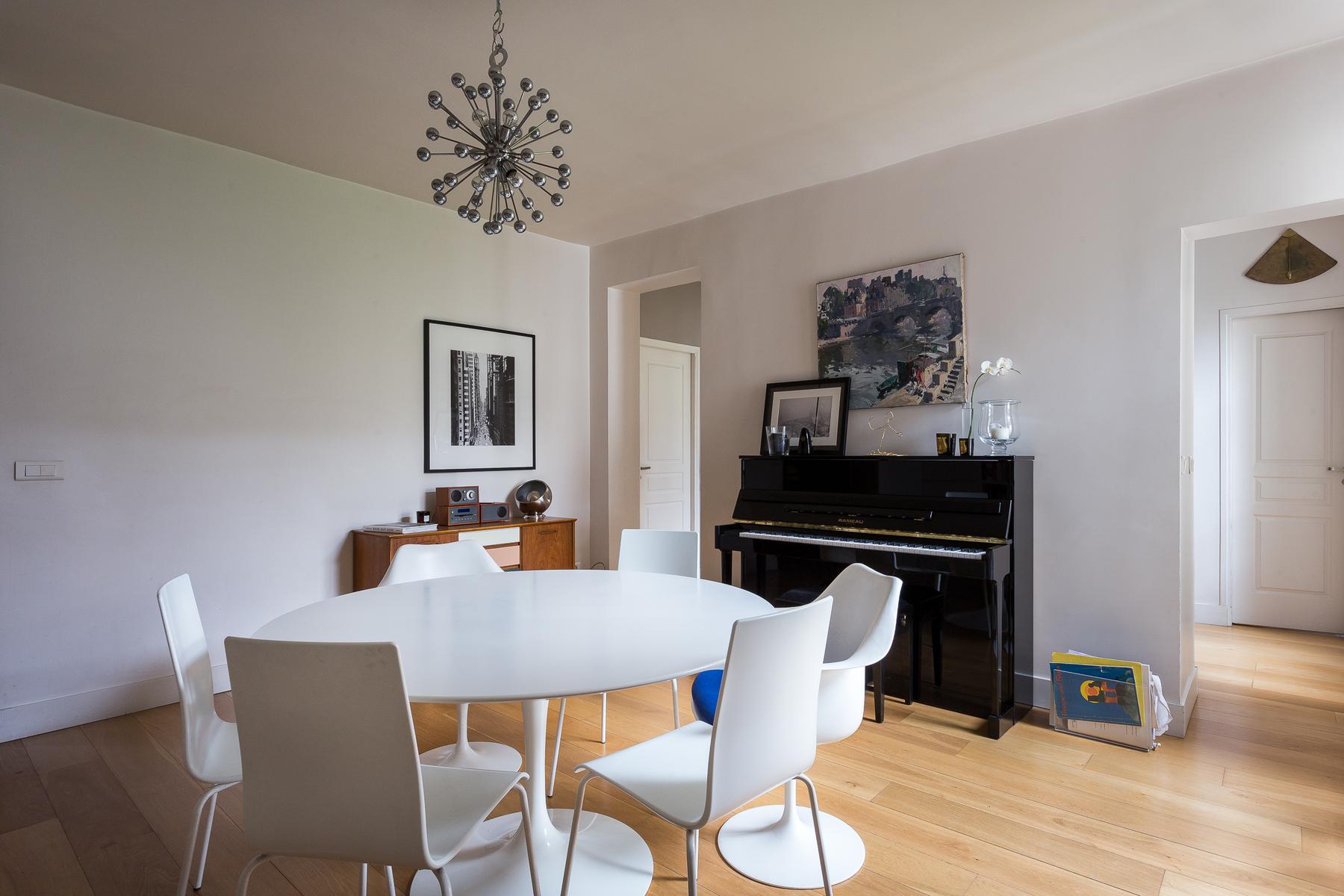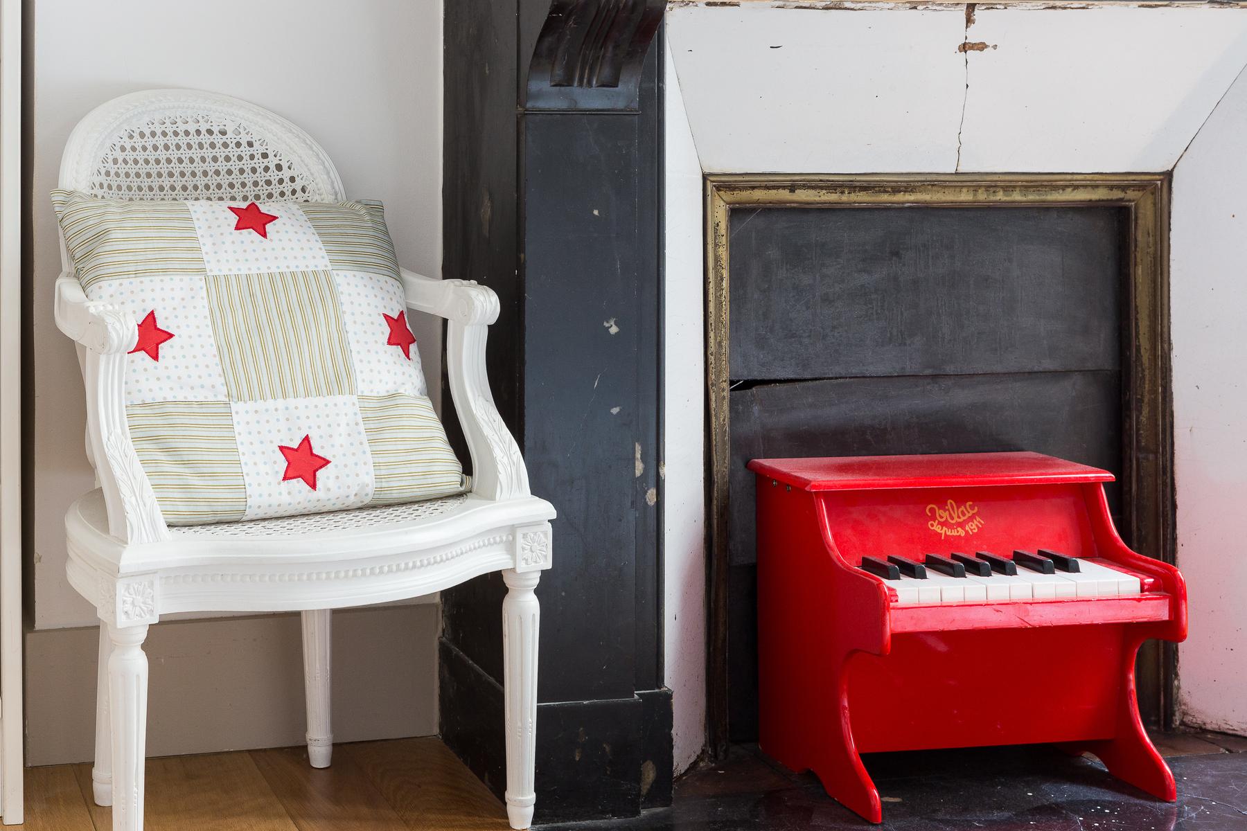 A la fois classique et contemporaine, cette maison de Saint-Germain-des-Prés est tout à fait chic. La porte d’entrée se trouve en haut de plusieurs volées d’escaliers (il n’y a pas d’ascenseur), et s’ouvre sur un couloir. Vous passez devant une salle de bains et passez devant la cuisine, où vous trouverez, en plus d’un coin cuisine élégant de couleur aubergine, une table de salle à manger élégante pour six personnes. Ensuite, les deux portes de chaque côté du piano de cette pièce vous mènent au salon – une pièce au plancher de bois peint en gris avec un poêle antique décoratif, un bureau encastré et un canapé, le tout entouré d’œuvres d’art diverses.