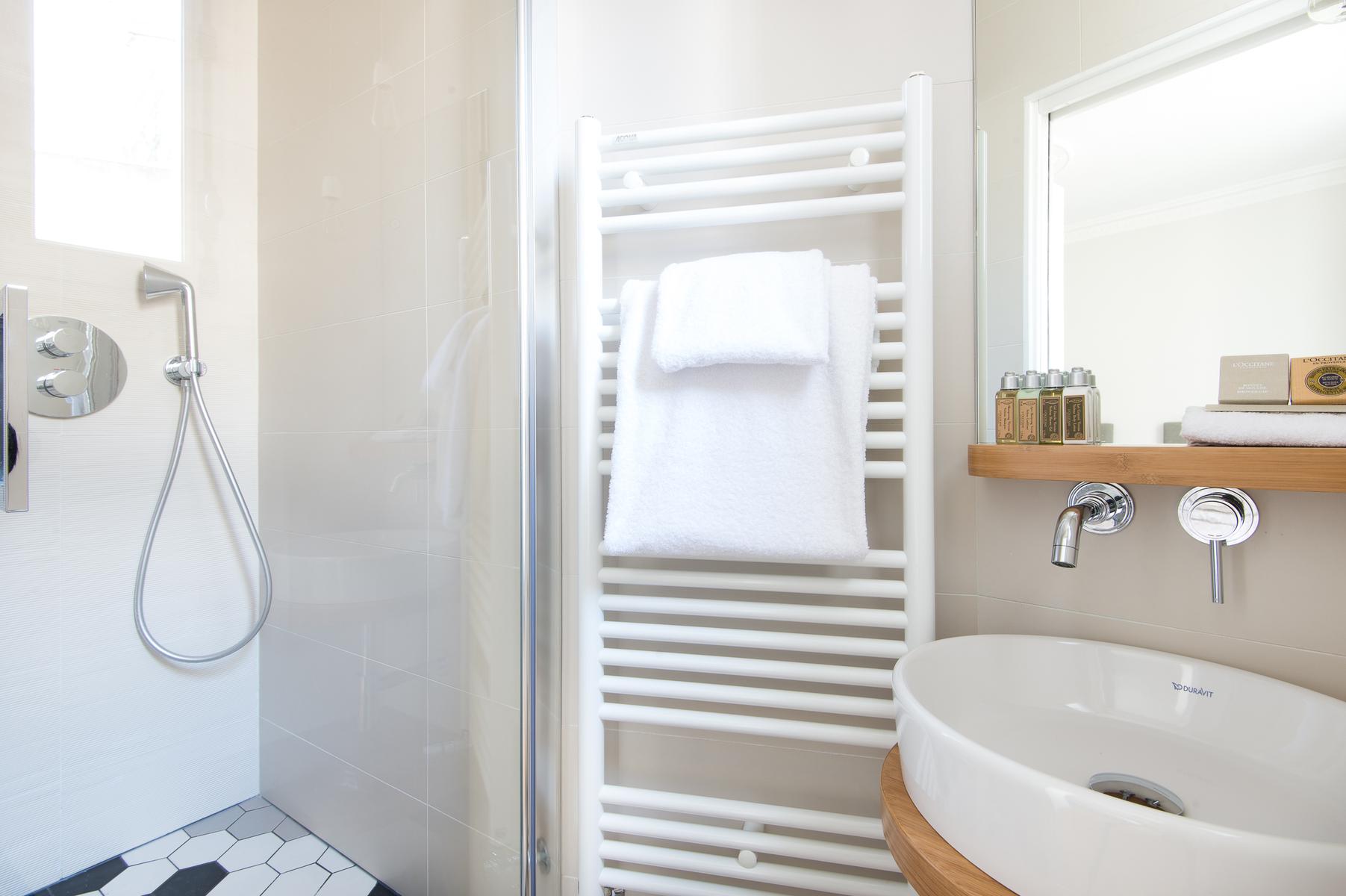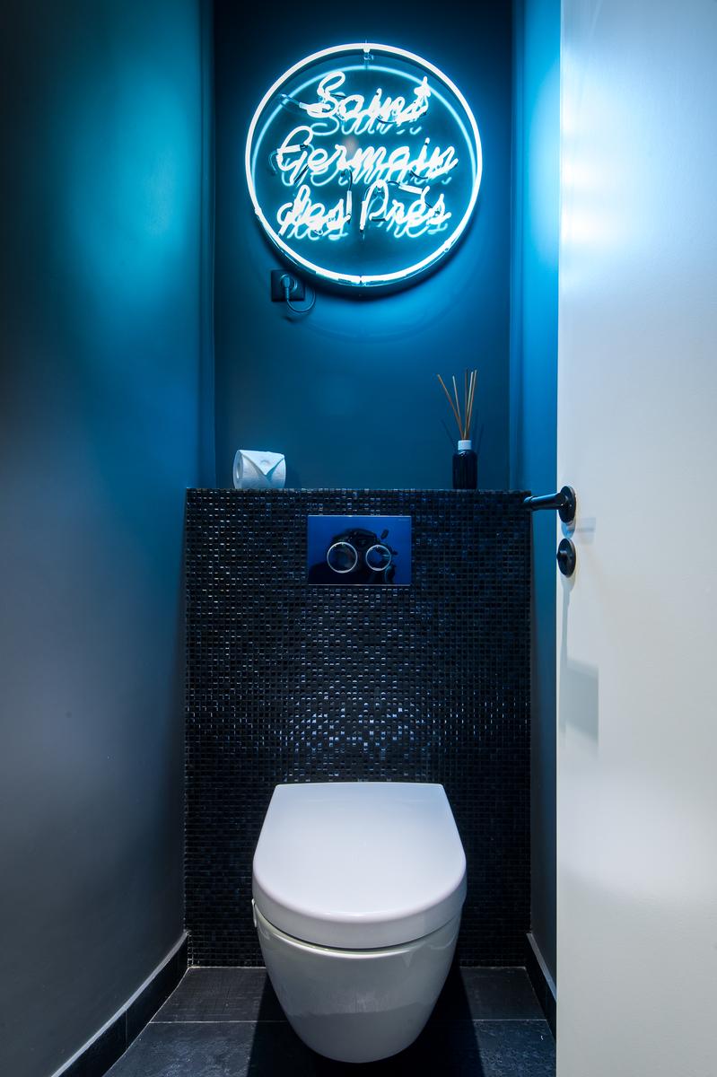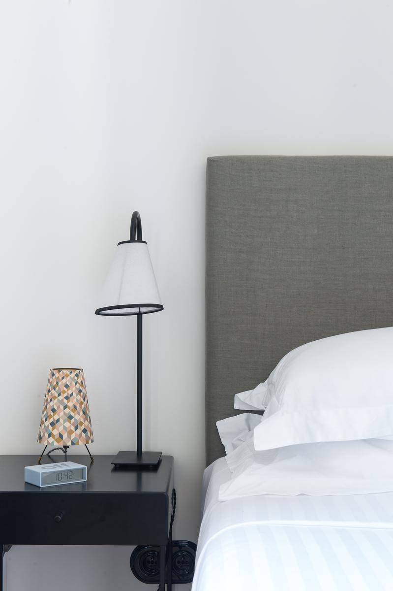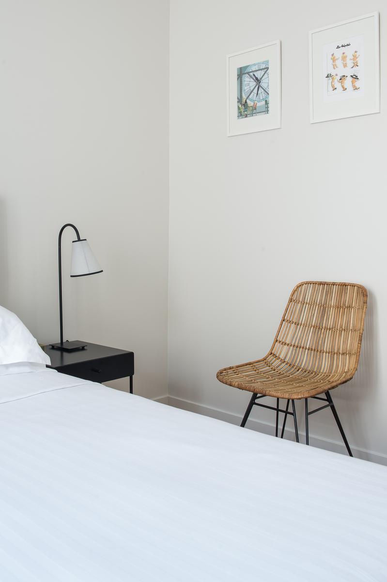Ensuite, à gauche de l’entrée, juste après une salle de toilette, se trouve la deuxième chambre à coucher (décorée dans des couleurs plus douces, avec une salle de bain attenante). Et à côté, vous trouverez la chambre principale. Avec son papier peint en trompe l’œil, son lit king size et sa salle de bain contemporaine, il est à la fois chic et accueillant.
