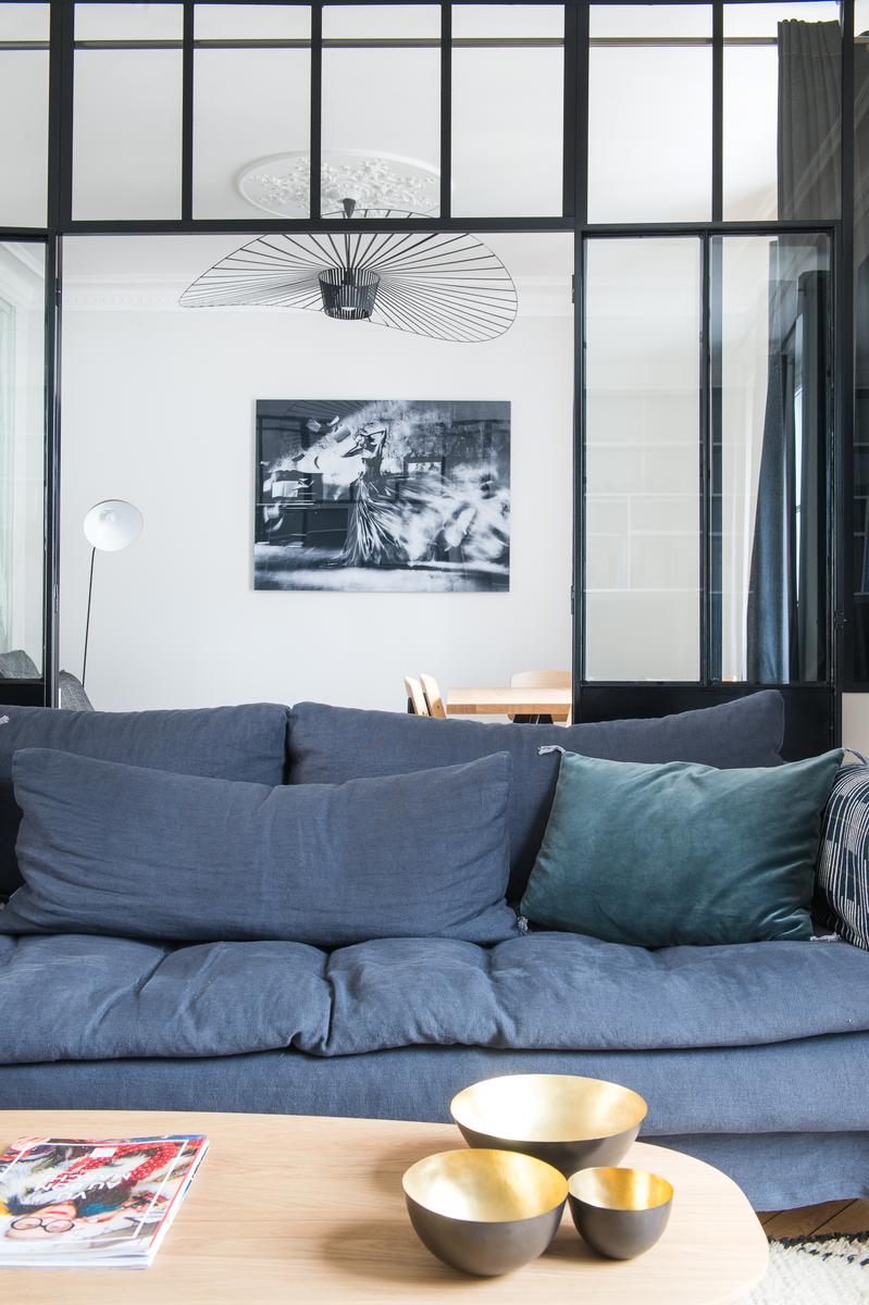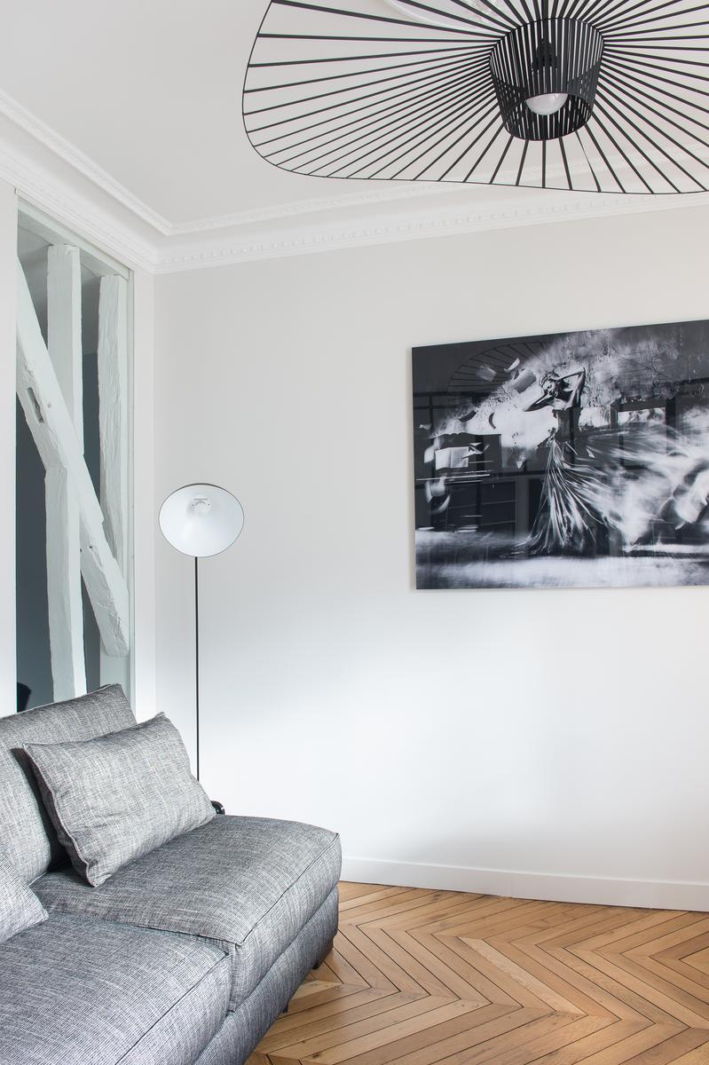 Une palette de couleurs monochromes, une utilisation intelligente de l’espace et des œuvres d’art qui suscitent la réflexion – Rue Gît-le-Cœur II est certainement distinctive. En tournant à droite dans le long hall d’entrée, vous arriverez en premier à la cuisine. Il dispose d’armoires blanches brillantes, de carreaux de sol à motifs et d’un bar pour le petit-déjeuner qui donne sur le salon attenant. Cette chambre est décontractée, avec un canapé long et un tapis duveteux, ainsi que deux fauteuils design. Une porte vitrée le sépare de la salle à manger, où un canapé-lit et une table de salle à manger en bois se trouvent sous une œuvre d’art en noir et blanc.