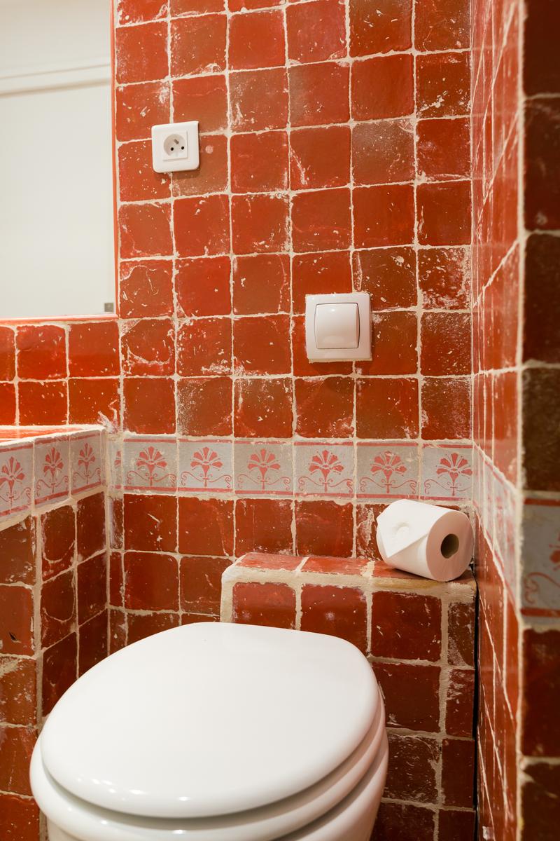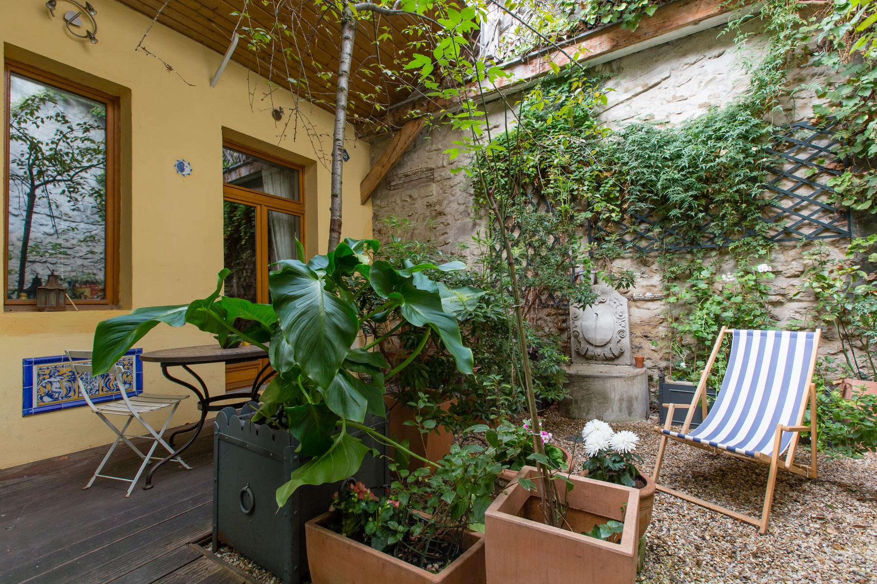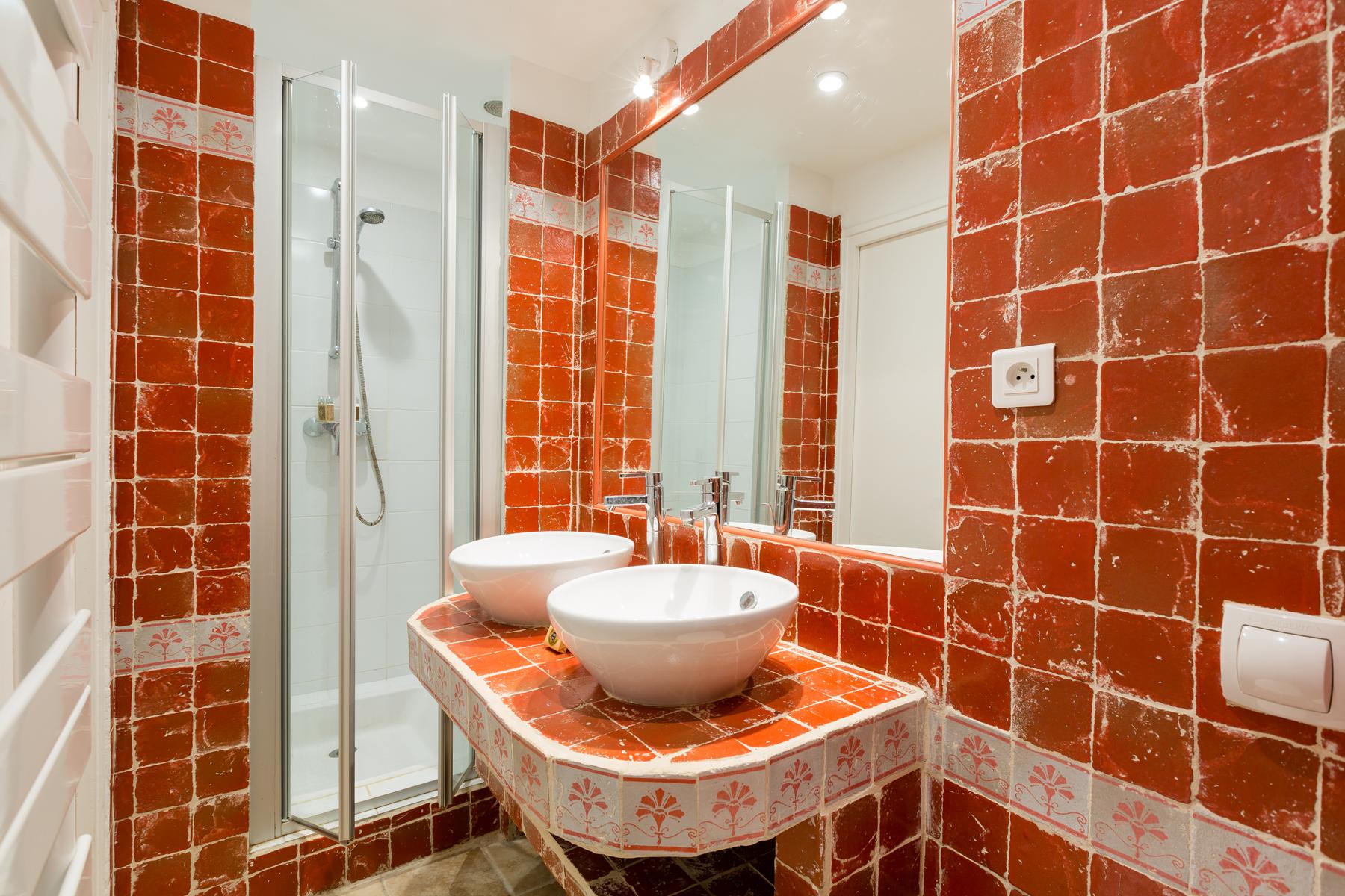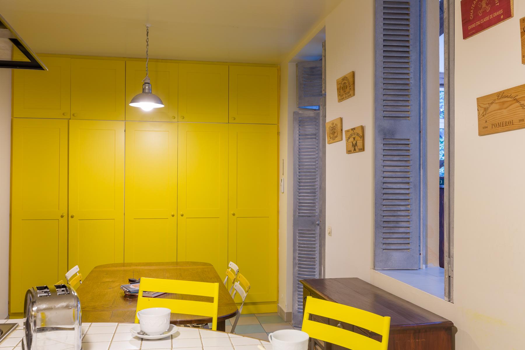 A travers les volets rustiques en bois, vous trouverez la cuisine – les armoires jaune vif et les carreaux blancs sont un mélange rafraîchissant, et les chaises de la table à manger sont brossées avec des teintes ensoleillées. Suivez le couloir pour trois des quatre chambres à coucher, y compris deux chambres simples et une chambre des maîtres inhabituelle. Ici, le sol est carrelage vert et blanc, les portes s’ouvrent sur le pont, et il y a une salle de bains teintée sarcelle cachée derrière les volets. La quatrième chambre à coucher de couleur orange et confortable remplit le premier étage. Les rues animées de la Bastille sont bordées de bars à la mode et de brasseries pittoresques.