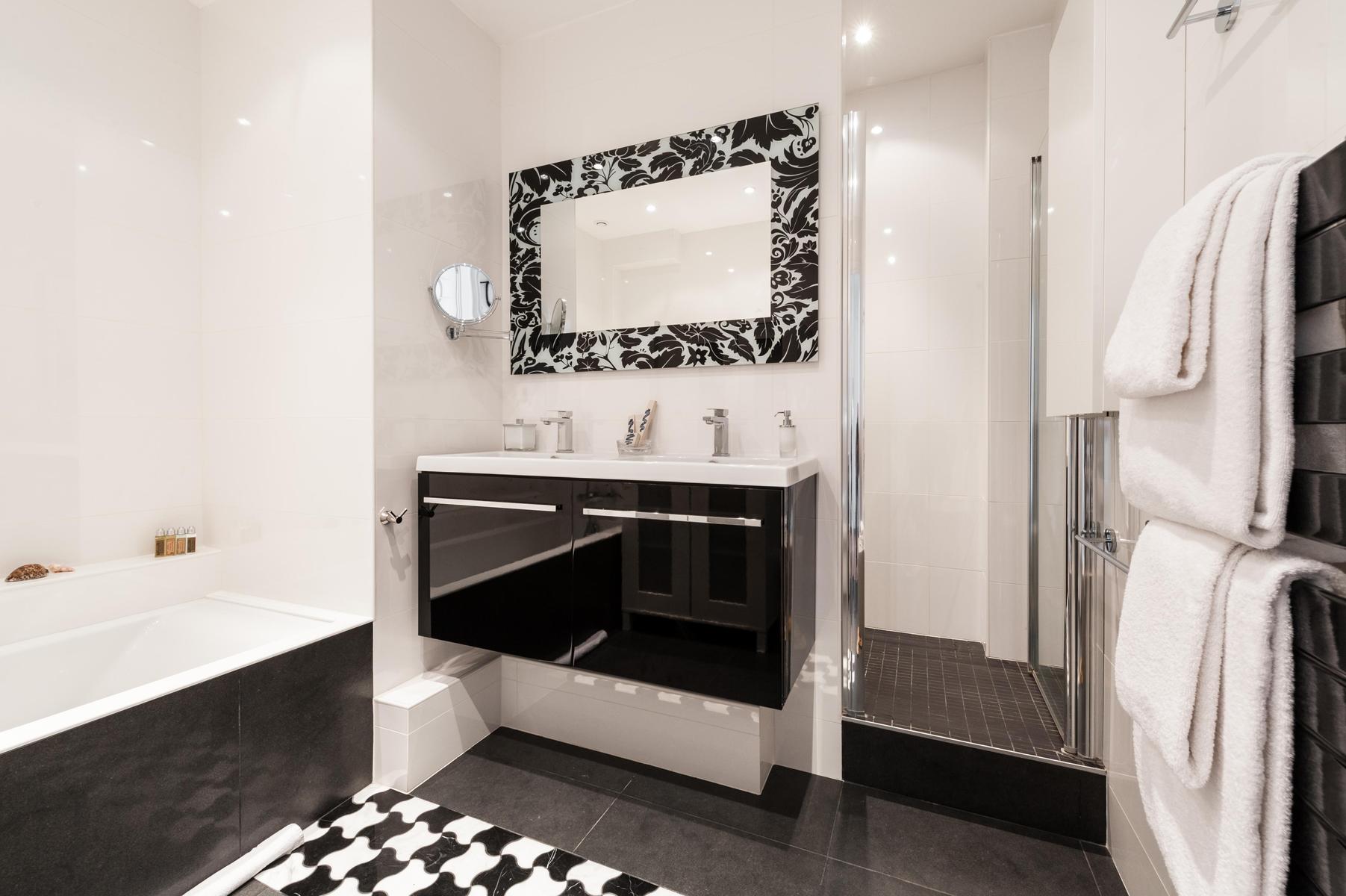 A côté, la table à manger quatre places, la cuisine brillante est toute neuve, et il y a des livres et des affiches, des éclairages ingénieux et des impressions vibrantes. La salle de bain principale est chic en noir et blanc, et les deux chambres doubles sont aussi paisibles que jolies.