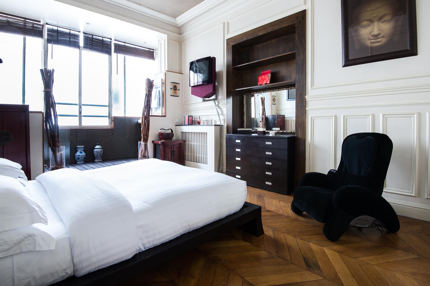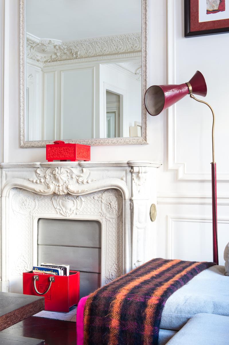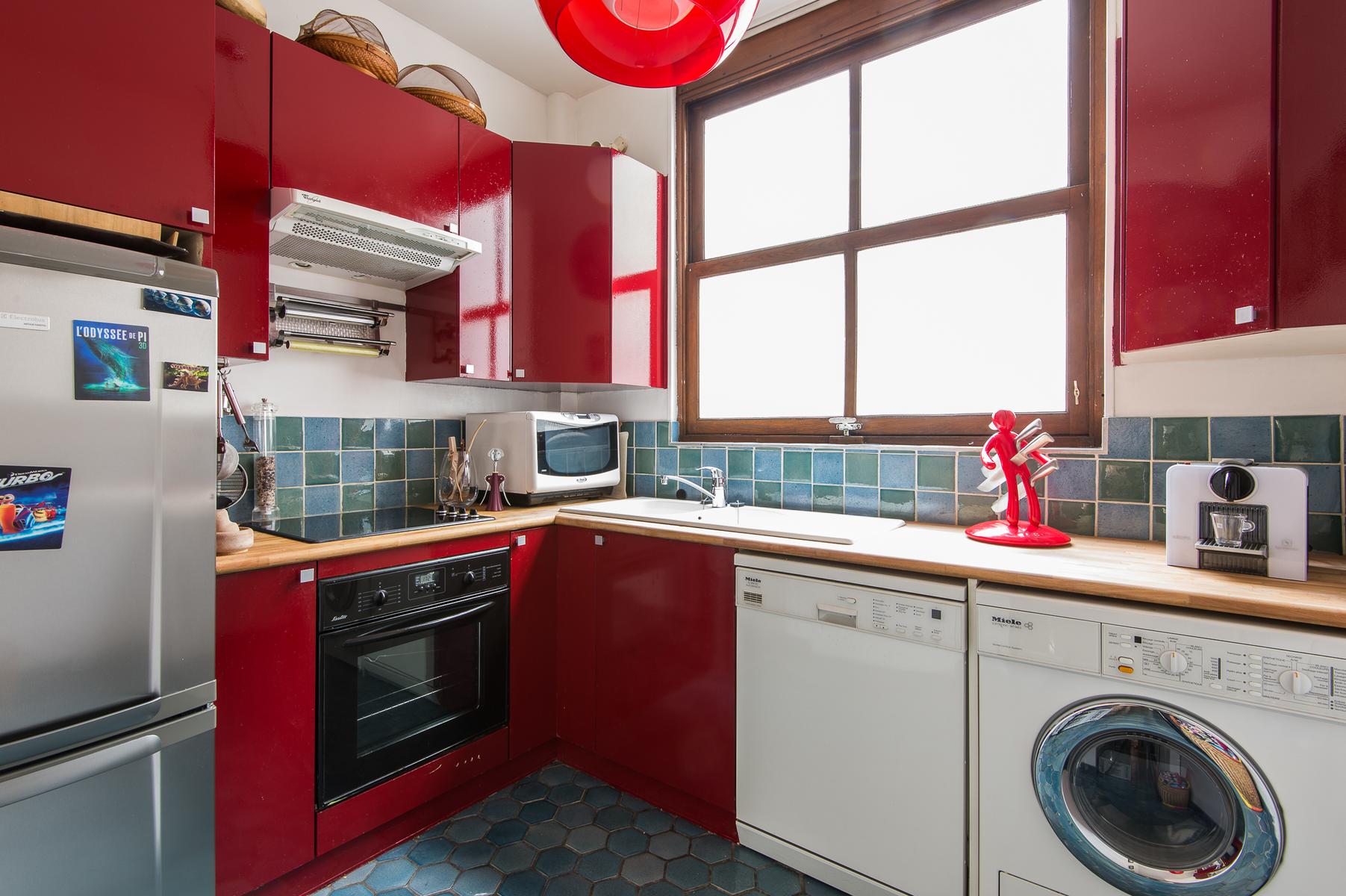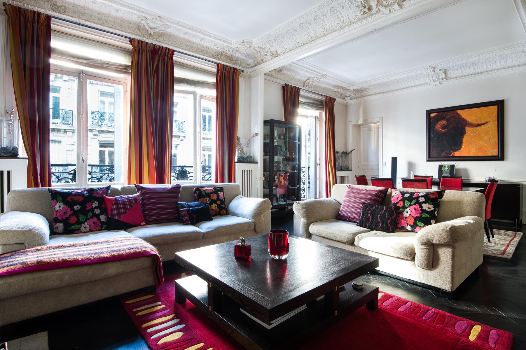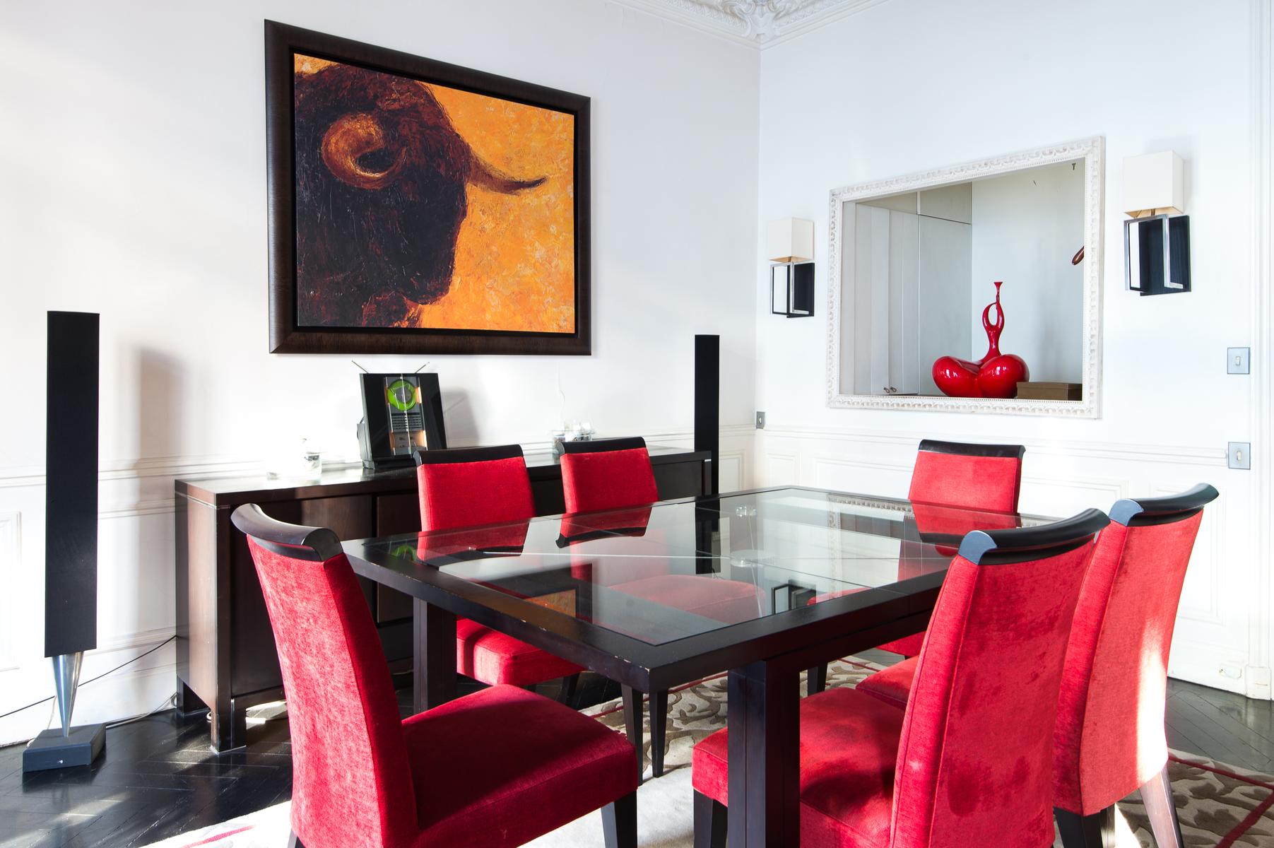 Entourée d’un paysage qui tourne la tête, cette maison dans l’Arc de Triomphe – Champs-Élysées est elle-même frappante. Tout d’abord le long du hall d’entrée se trouve le salon – un espace impressionnant avec un plafond orné et des parquets. En plus d’un coin salon avec deux canapés (tous deux avec des coussins mal assortis) et une table basse robuste, il y a une salle à manger. Sa table, ornée de chaises rouges, se dresse à côté d’une peinture colorée d’un taureau.