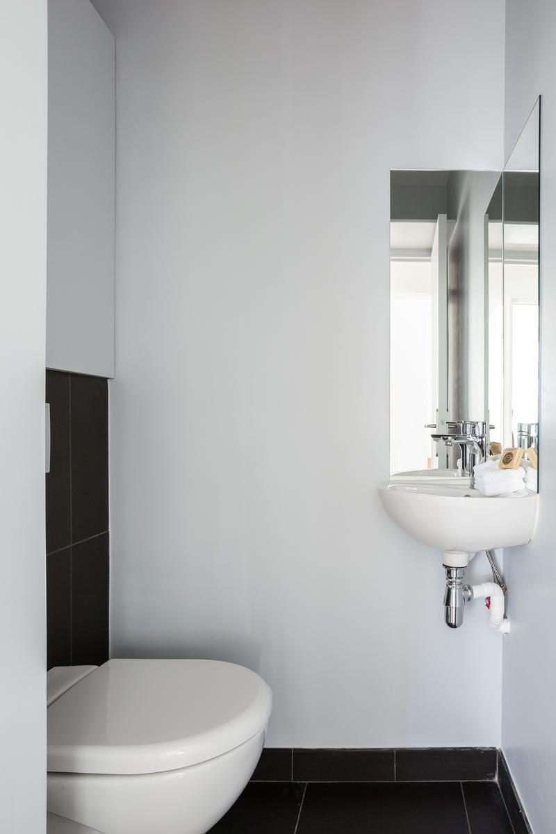 La porte à gauche vous mène à un couloir, où il y a d’abord une salle de bain et ensuite une salle de toilette. Ensuite se trouve la deuxième chambre à coucher, avec des murs blancs croustillants et un tapis rouge rubis. Enfin, il y a la chambre à coucher principale, très bien discrète, avec une large fenêtre et un air tranquille.