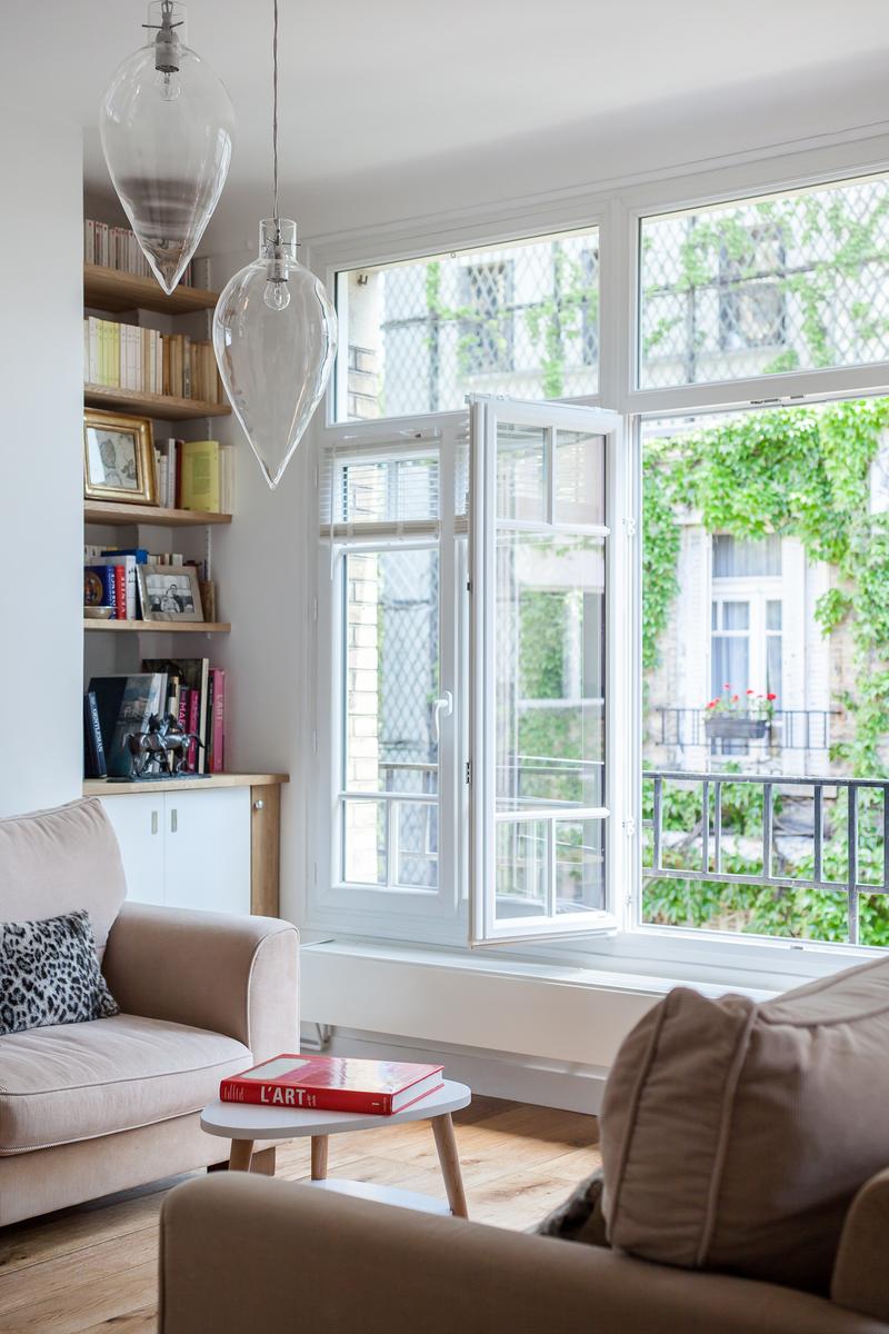 La rue Michel-Ange II est un petit coin particulièrement calme d’Auteuil – Roland-Garros. En traversant deux cours fleuries et en montant jusqu’au troisième étage, vous arriverez à la porte d’entrée qui mène à l’espace de vie ouvert. Sur la gauche se trouve la cuisine intelligente, avec son bar en bois pour quatre personnes. Et tout droit devant se trouve le coin salon. Les murs d’un blanc pur et les planchers de bois blond donnent à ce lieu une impression de sérénité, mais ses deux canapés crème classiques (coiffés de coussins imprimés) et la collection de livres et de vases délicats lui confèrent une atmosphère chaleureuse