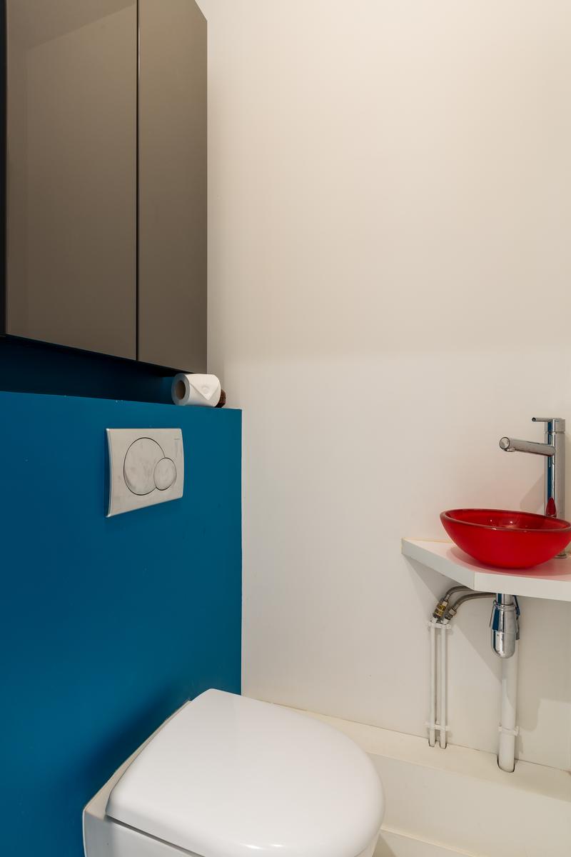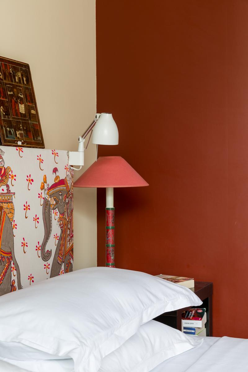 A droite de la cuisine, vous trouverez une salle de toilette et la salle de bain – contemporaine, avec quelques pops de couleur. Ensuite, les deux chambres à coucher ne sont plus dans le salon. A gauche se trouve la deuxième chambre à coucher (avec salle de bains), et à droite, la chambre principale colorée. D’autres ornements accrocheurs entourent son lit king size à motifs d’éléphants, au-delà duquel de longues fenêtres mènent au balcon.