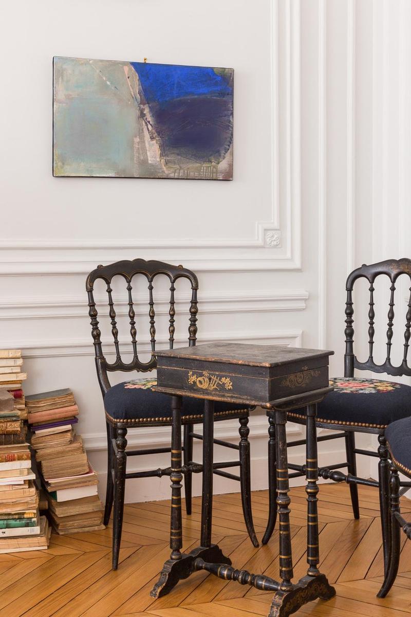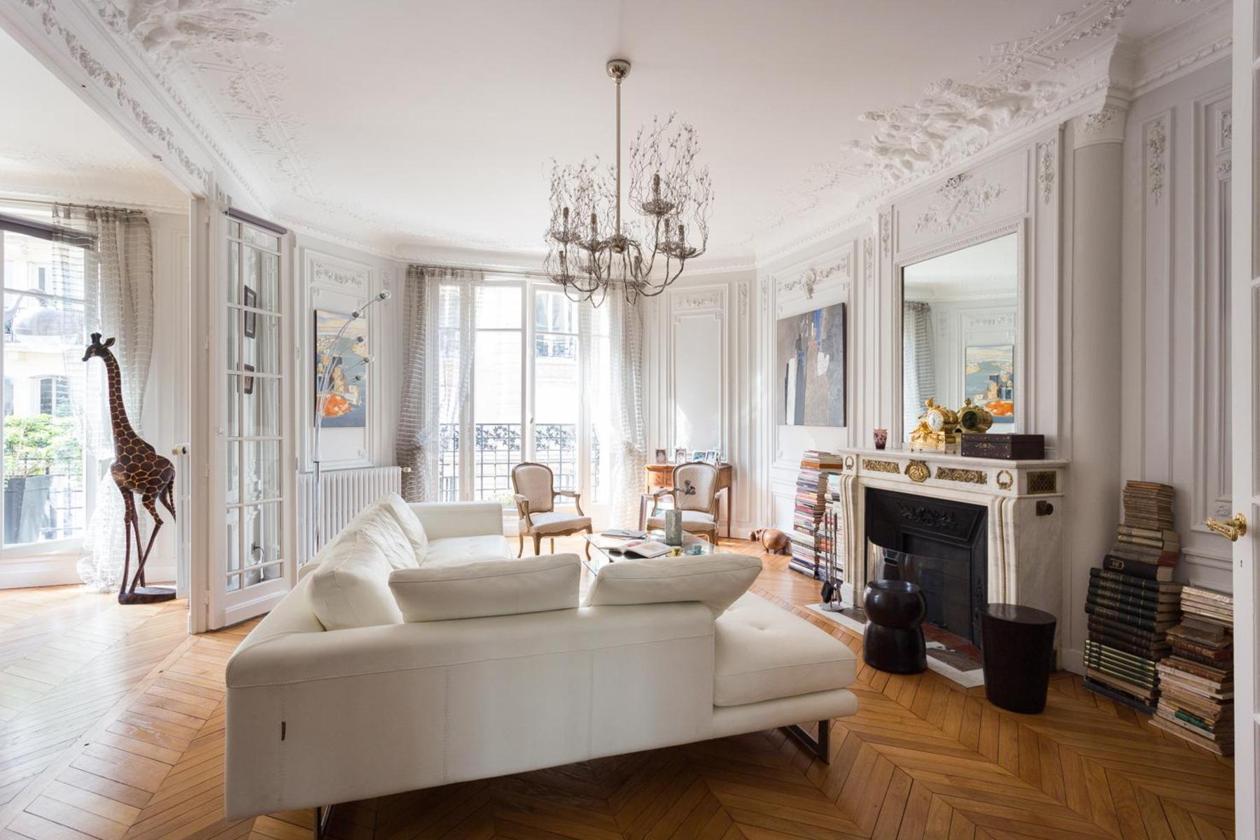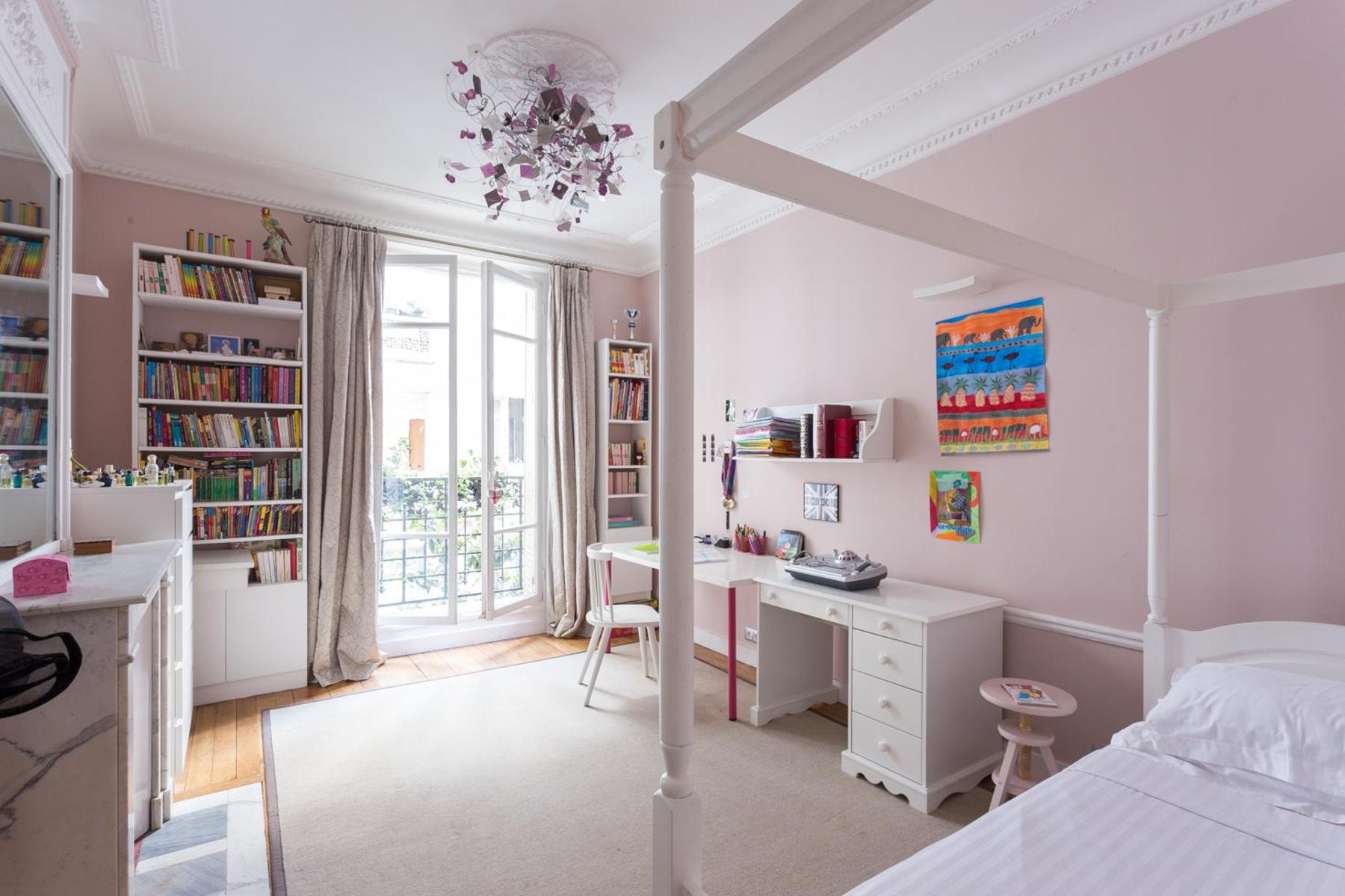 La rue Pétrarque II est un lieu distinctif, avec les boutiques de la rue de Passy, les brasseries traditionnelles de la place du Trocadéro et la Tour Eiffel qui l’entoure. Hauts plafonds, avec de majestueuses cheminées en marbre et de nombreuses pièces d’antiquités, cette maison est faite pour vivre grandiose. Et ses fioritures imaginatives – murs aux couleurs vives, rideaux diaphanes et lustres scintillants – ajoutent une touche étincelante. L’espace de vie frappant est le point focal de cette maison, où il y a des antiquités ornées et de larges portes françaises encadrant des vues sur les rues traditionnelles en contrebas – et vous pouvez tout prendre dans le canapé blanc modish en face.