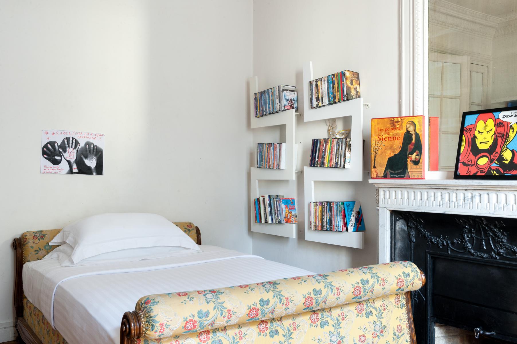 On the fifth and top floor of a typically Parisian building in Saint-Germain-des-Prés (picture a charming stone façade with ornate Juliet balconies), Rue Péguy is full with stories. Books fill every room, collected by your literary host and stacked on shelves, ladders – even a nook behind the bathtub. As you enter the front hall, you’ll find a bright bedroom to your left with a built-in desk and floral bed frame.