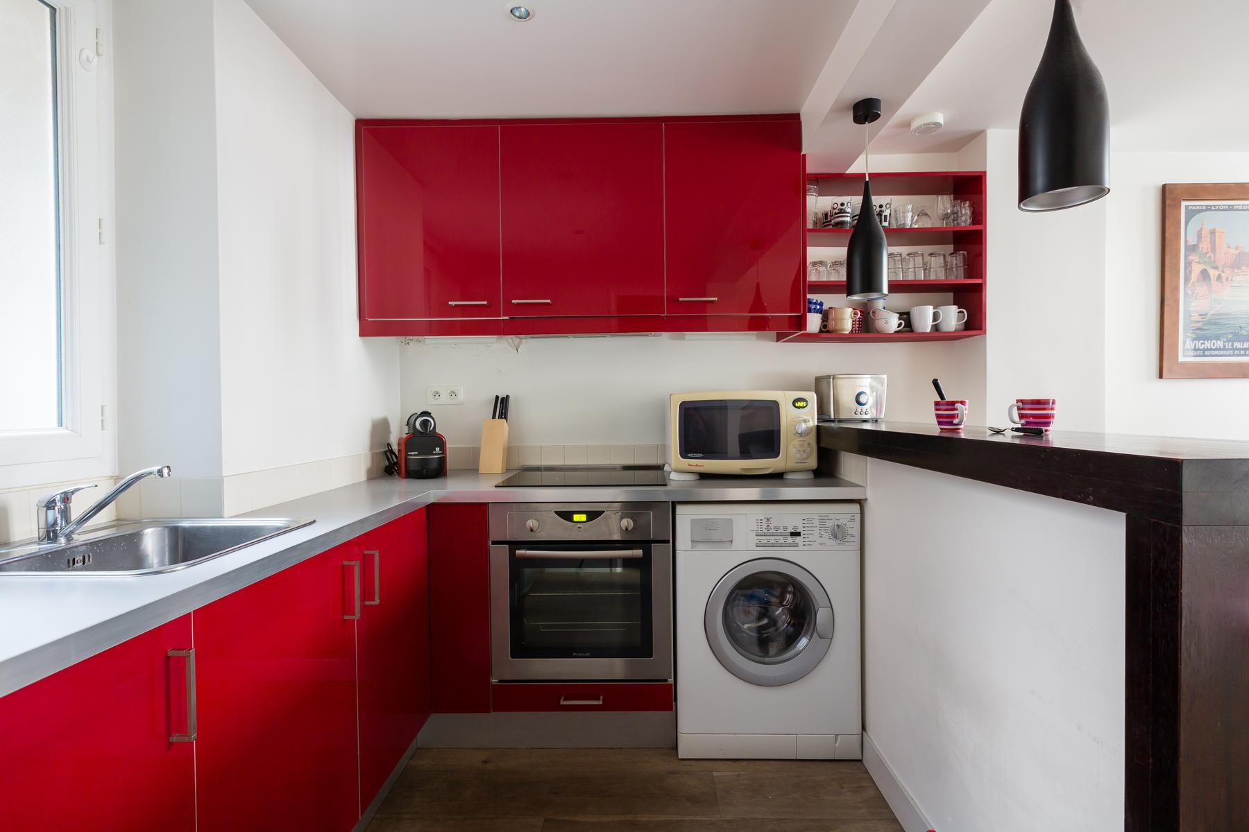 A quelques pas de la Tour Eiffel, cette maison est un endroit chic. Tout d’abord, il y a la salle de séjour ouverte, où il y a une cuisine rouge et blanche à l’extrémité proche. Sur la gauche se trouve une salle de toilette, puis, au-delà du bar brillant du petit déjeuner, vous trouverez le coin salon avec un grand canapé d’angle, deux fauteuils et une table basse élégante. Juste après, il y a une salle à manger, sa table noire avec des chaises design et ses étagères doublées d’accessoires tout aussi élégants.