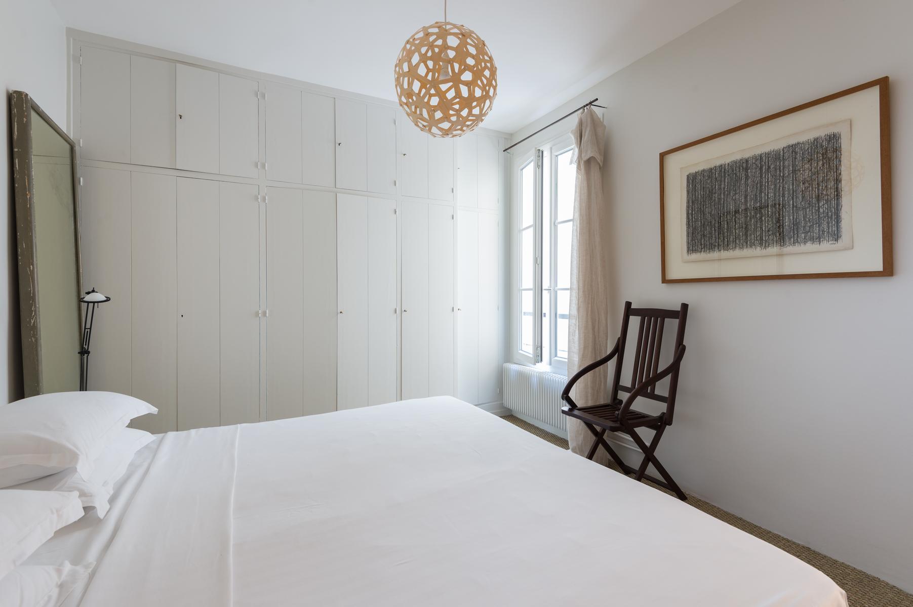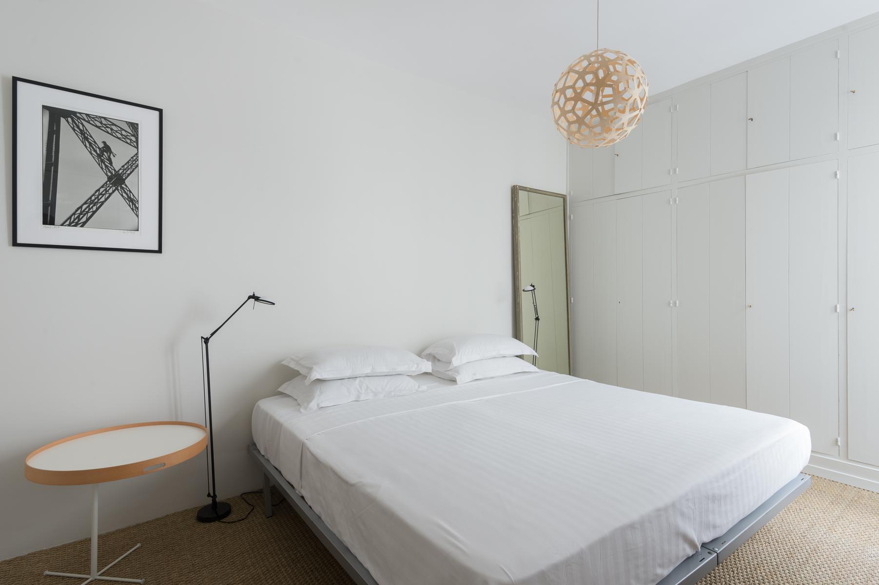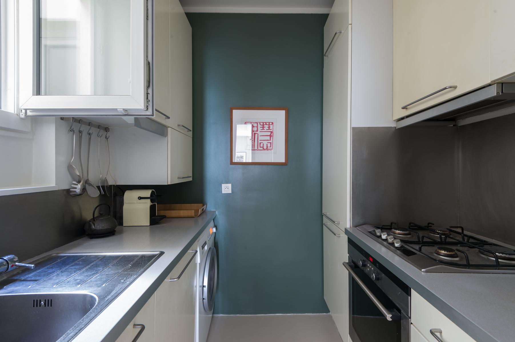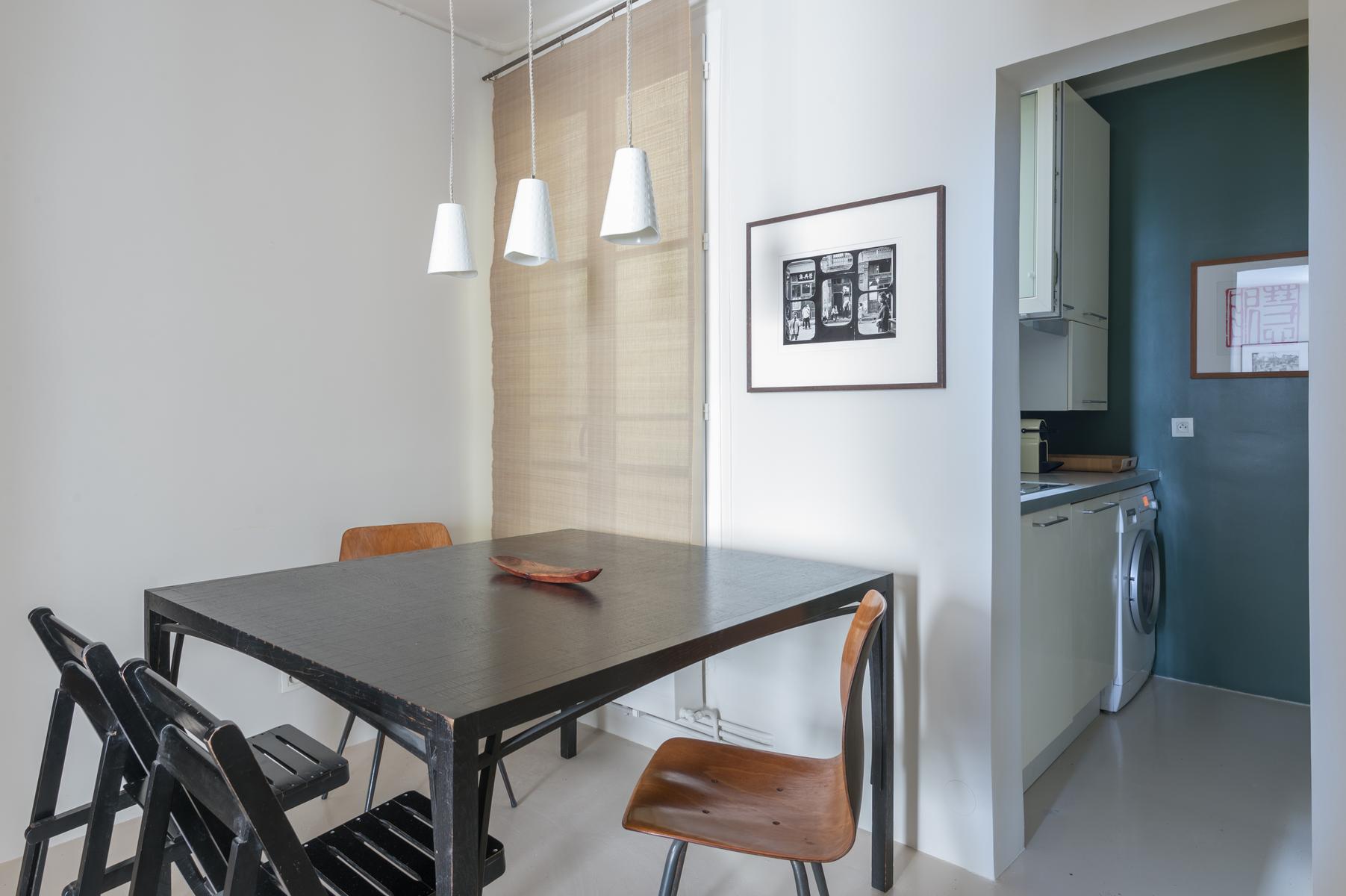 A proximité des plus belles curiosités du centre de Paris (plus une charmante boucle de la Seine), la rue Surcouf se trouve dans une position privilégiée. À l’intérieur, vous trouverez la salle de bain tout droit devant, et la deuxième chambre à coucher – toutes des pièces discrètes et des photos en noir et blanc – immédiatement à gauche. Puis, à droite, la salle à manger, où se trouve une table vintage pour quatre personnes, sous trois lampes contemporaines. Au-delà, une porte ouverte mène à la cuisine grise et verte.