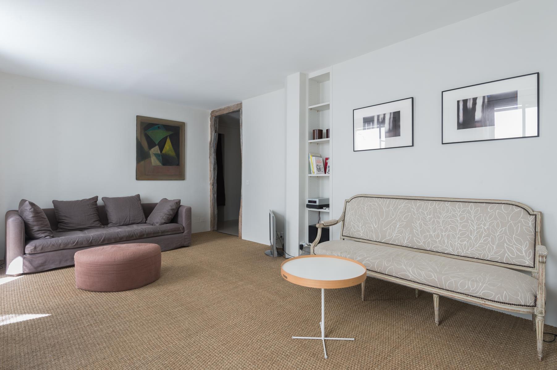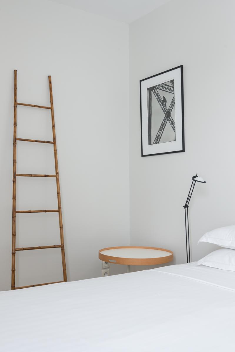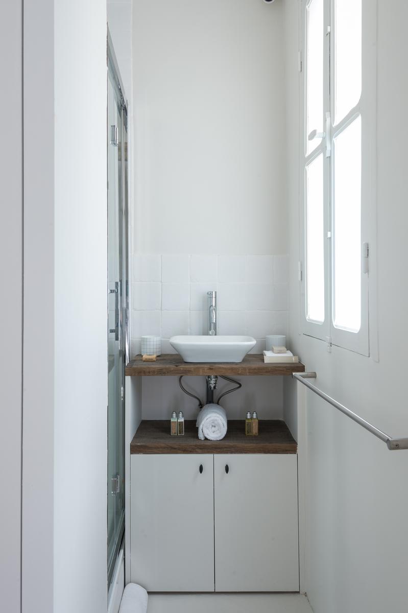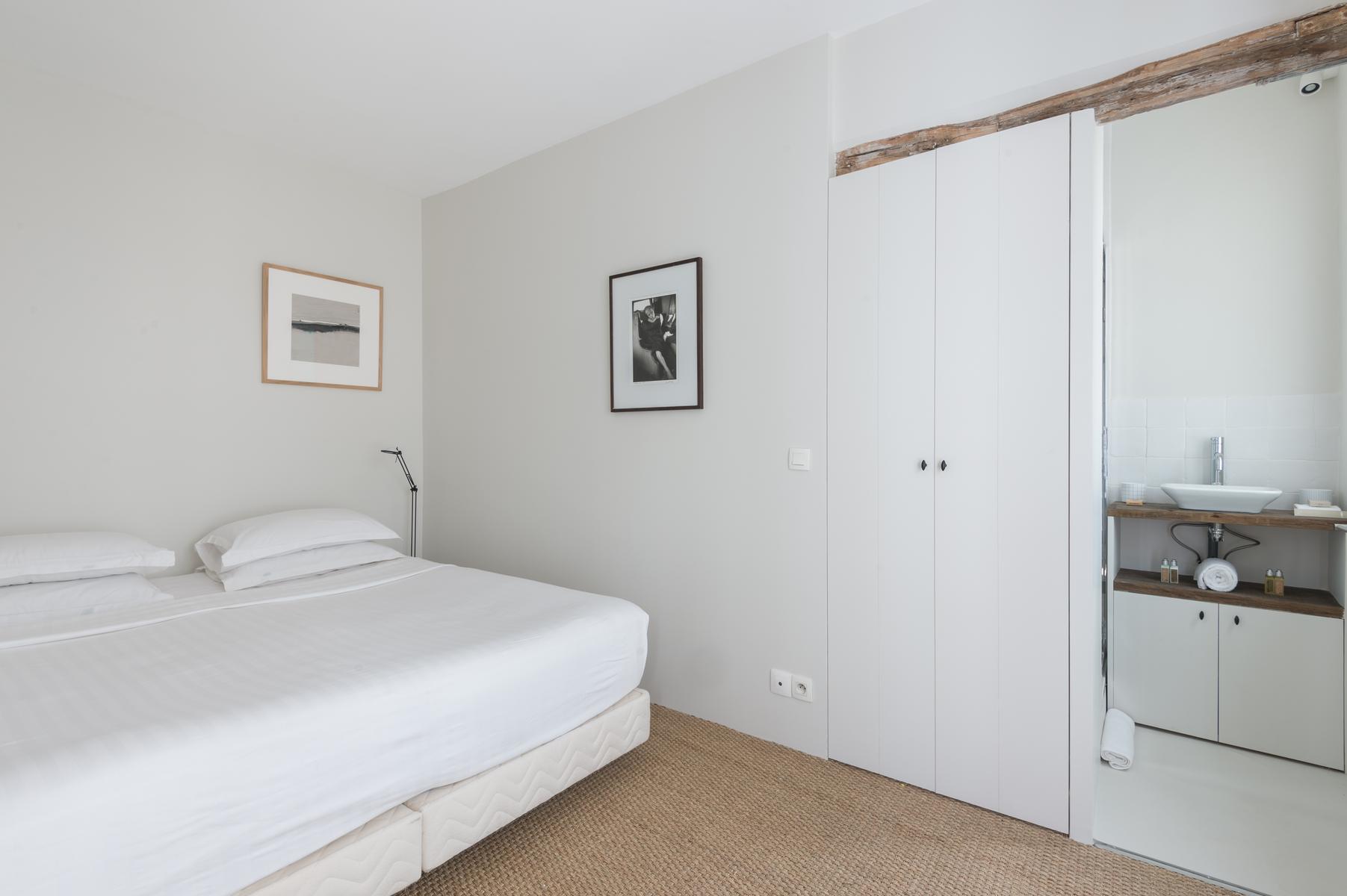 A proximité des plus belles curiosités du centre de Paris (plus une charmante boucle de la Seine), la rue Surcouf se trouve dans une position privilégiée. À l’intérieur, vous trouverez la salle de bain tout droit devant, et la deuxième chambre à coucher – toutes des pièces discrètes et des photos en noir et blanc – immédiatement à gauche. Puis, à droite, la salle à manger, où se trouve une table vintage pour quatre personnes, sous trois lampes contemporaines. Au-delà, une porte ouverte mène à la cuisine grise et verte.