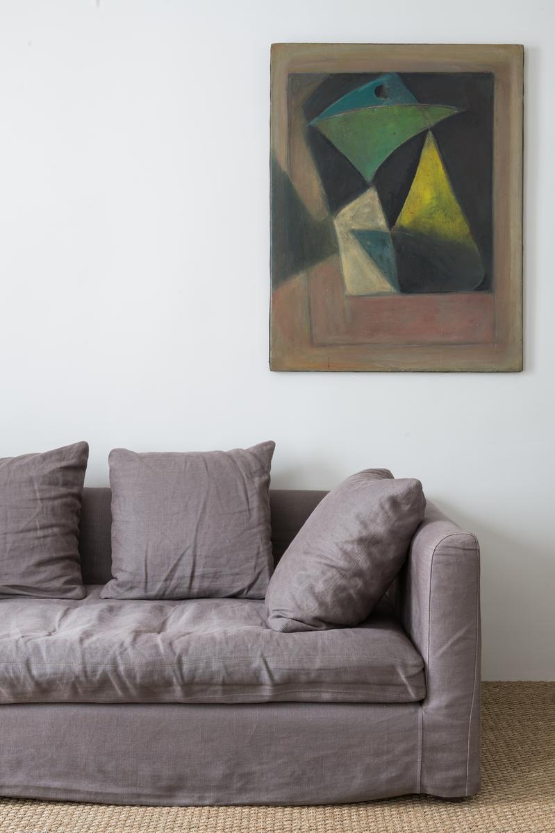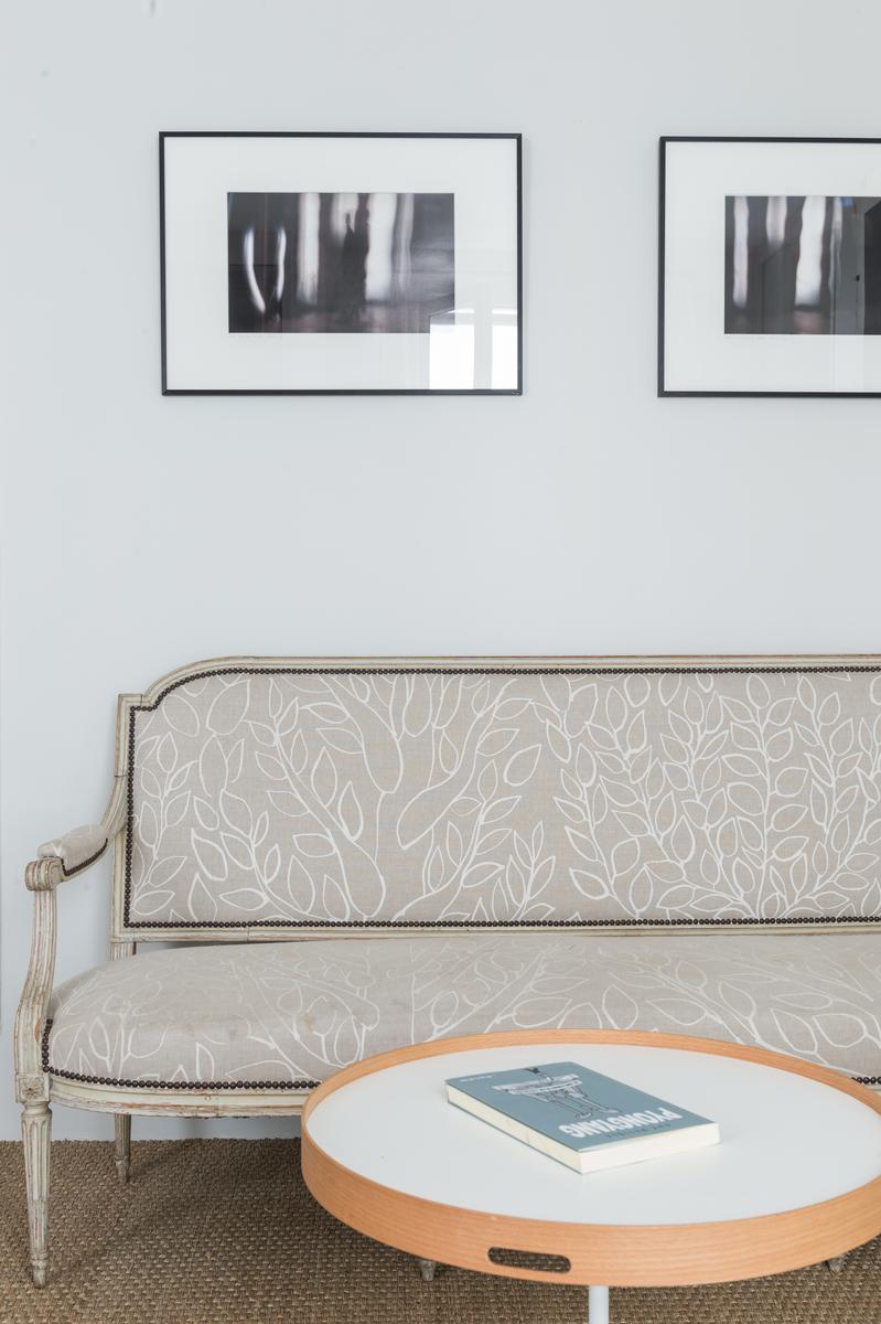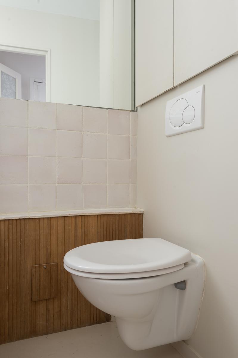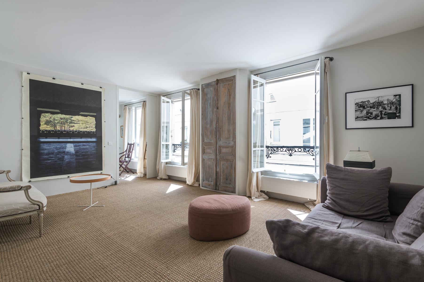 A proximité des plus belles curiosités du centre de Paris (plus une charmante boucle de la Seine), la rue Surcouf se trouve dans une position privilégiée. À l’intérieur, vous trouverez la salle de bain tout droit devant, et la deuxième chambre à coucher – toutes des pièces discrètes et des photos en noir et blanc – immédiatement à gauche. Puis, à droite, la salle à manger, où se trouve une table vintage pour quatre personnes, sous trois lampes contemporaines. Au-delà, une porte ouverte mène à la cuisine grise et verte.