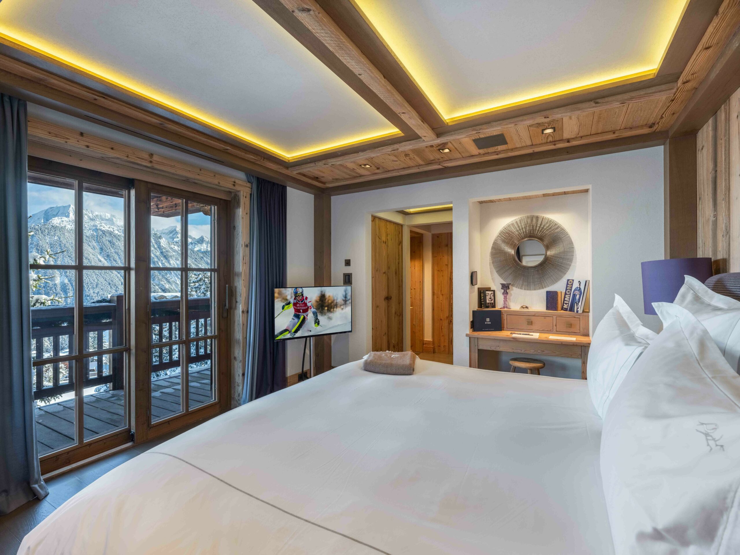 Réparti sur cinq niveaux, le chalet accueille ses hôtes dans six chambres spacieuses, toutes ouvertes sur les paysages grandioses de la vallée. Les larges baies vitrées laissent entrer la lumière des Alpes et offrent une vue apaisante sur les forêts enneigées. Les terrasses aménagées invitent à savourer l’air pur de la montagne, un café chaud à la main, tandis que les flocons dansent au-dessus des sapins.