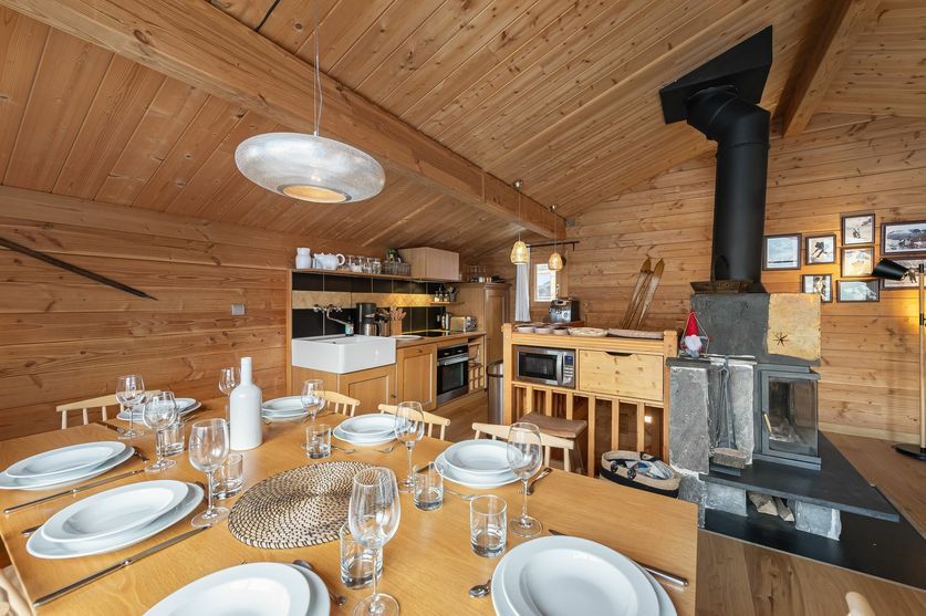 De construction traditionnelle avec le charme du bois qui s’allie parfaitement avec le mobilier contemporain. Un grand salon très cosy avec une cheminée qui réchauffe les cœurs. Un intérieur agréable et lumineux avec de grandes vitres qui permettent d’admirer la montagne. On profite d’une vue magnifique sur les sommets et on discute ensemble des exploits de la journée de ski.