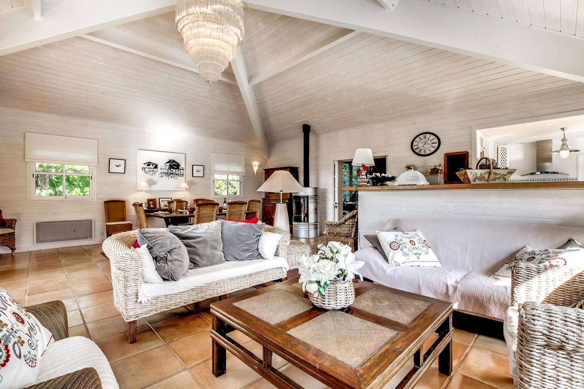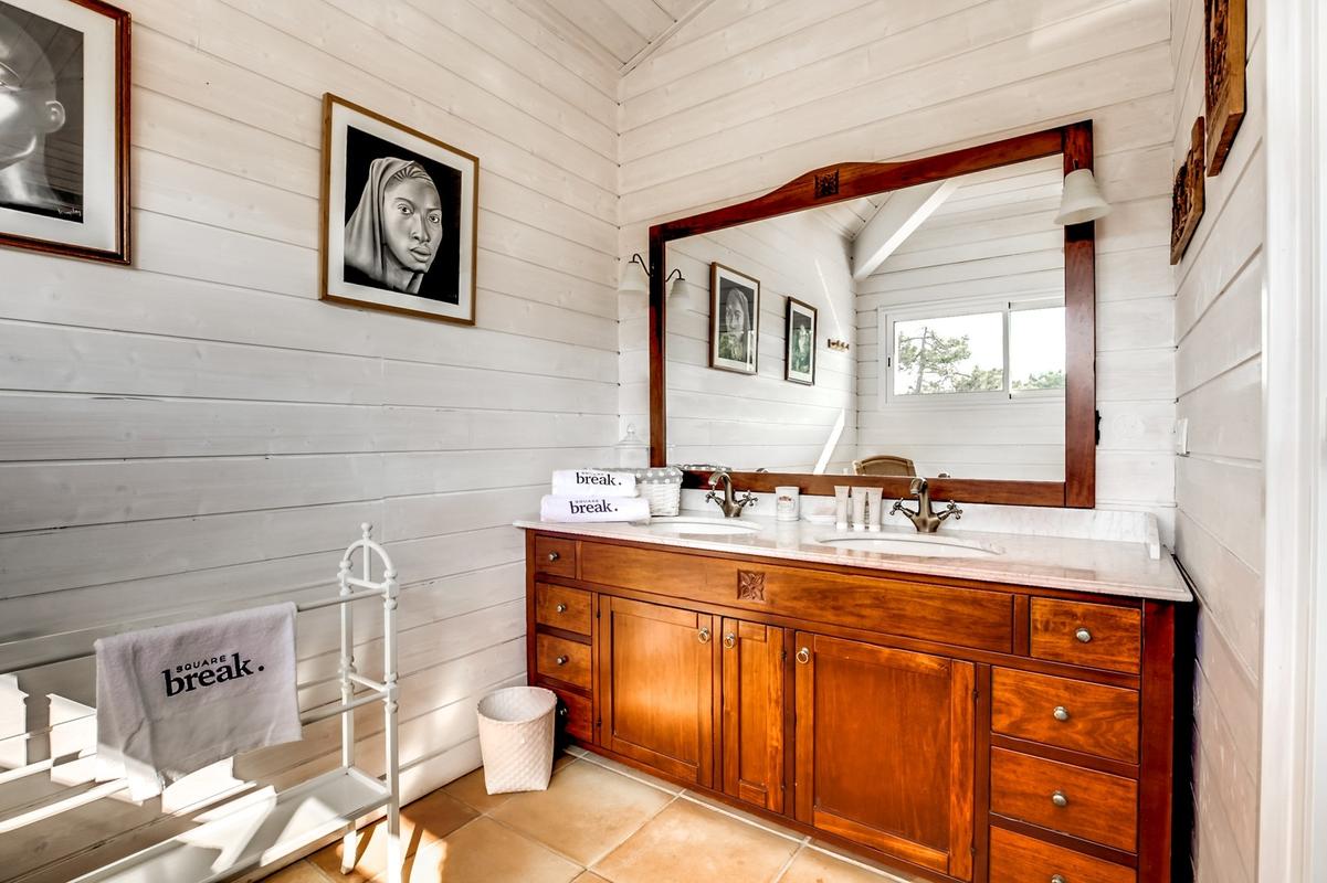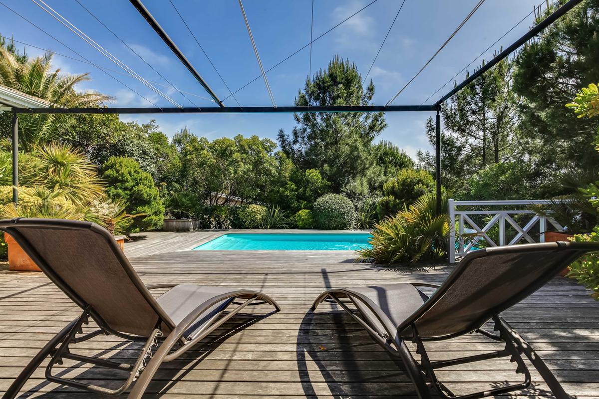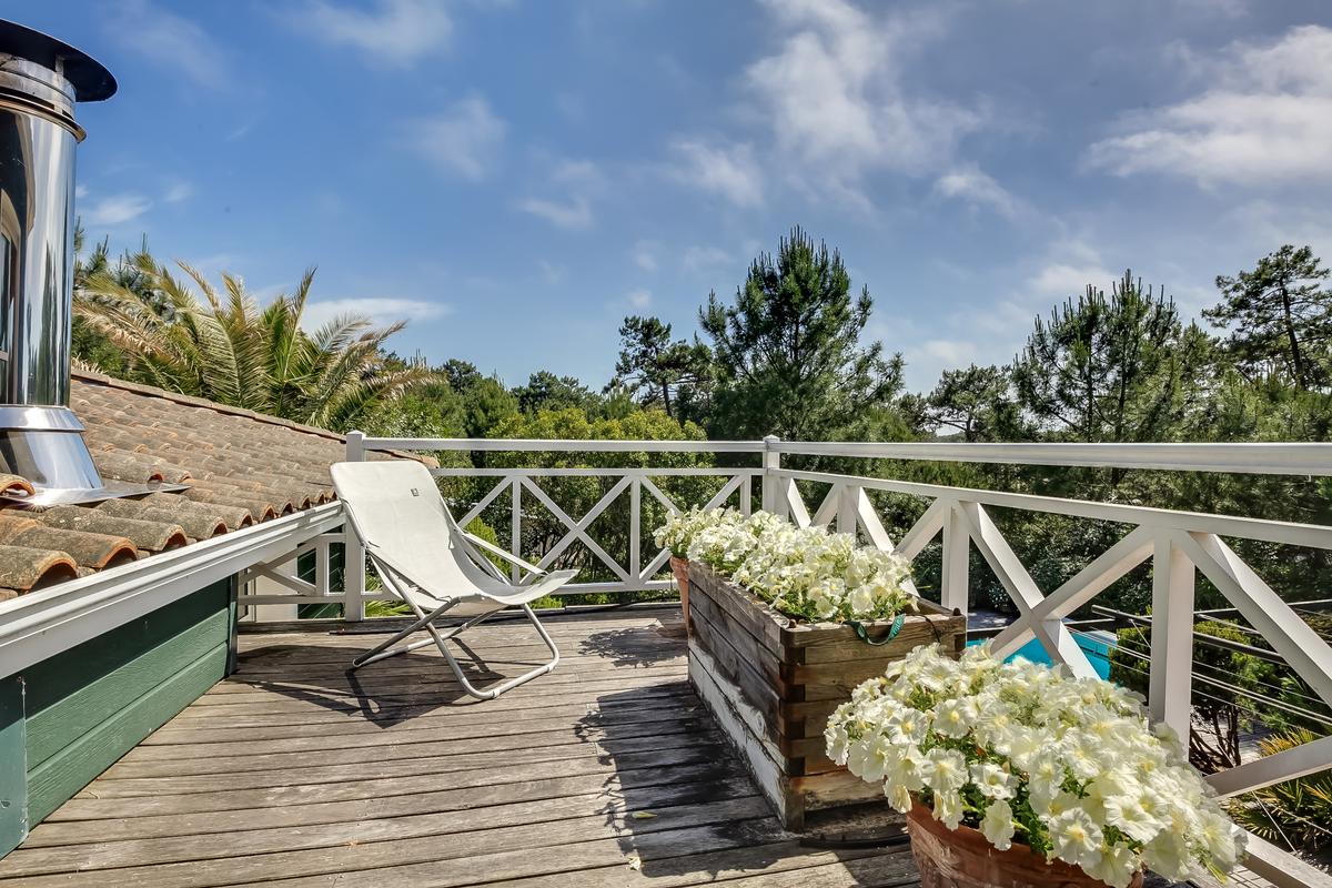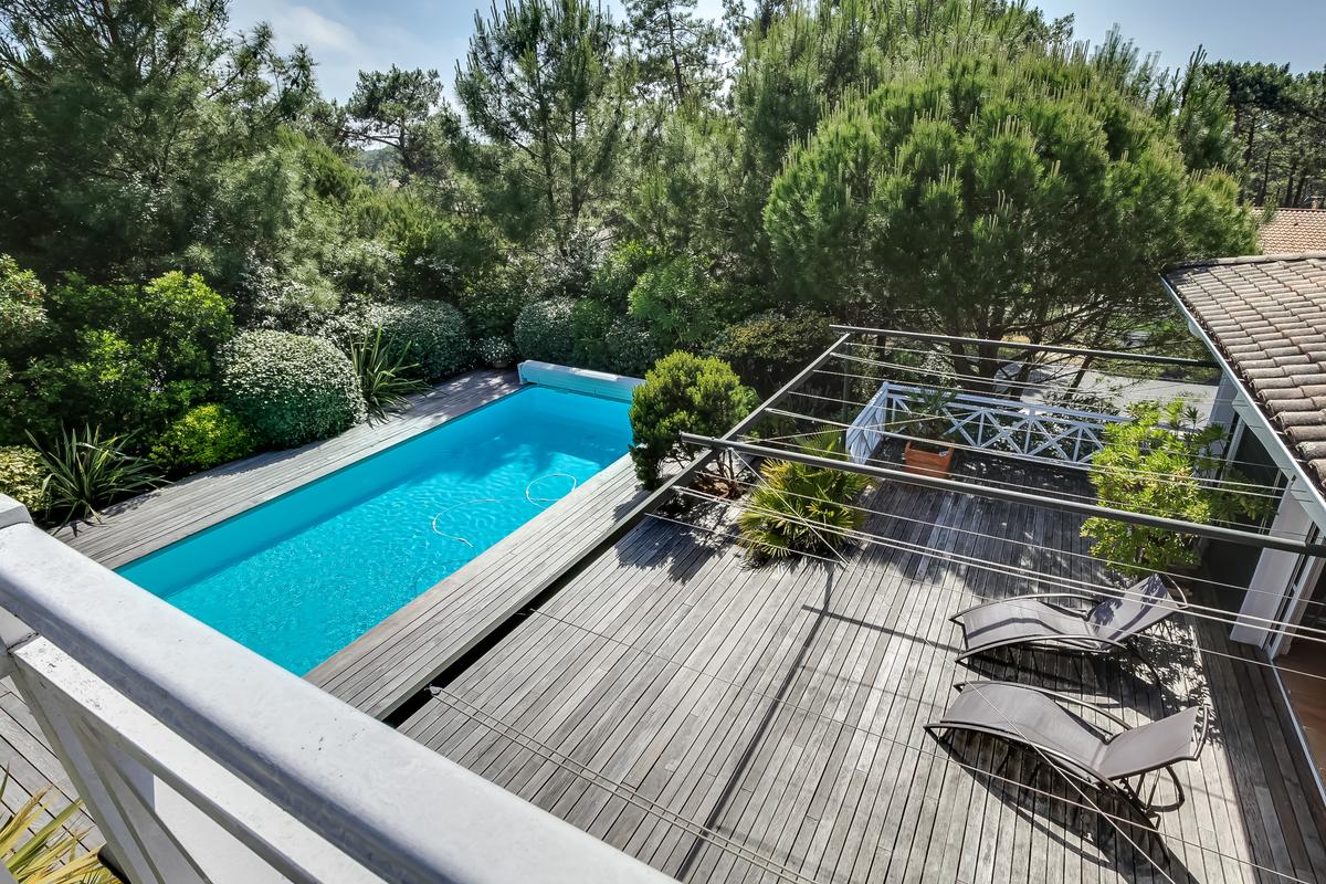 Une ambiance exotique règne, quelque part entre la Louisiane et les tropiques. C’est certainement dû à la végétation exubérante qui abrite le jardin et la piscine, mais aussi la charpente en bois de la villa, les terrasses et les porches où l’on peut déjeuner, se détendre, profiter de la mer et de la forêt de pins…. Les enfants vont adorer la piscine d’eau salée de 9x4m, chauffée de la mi-mai à la mi-octobre.