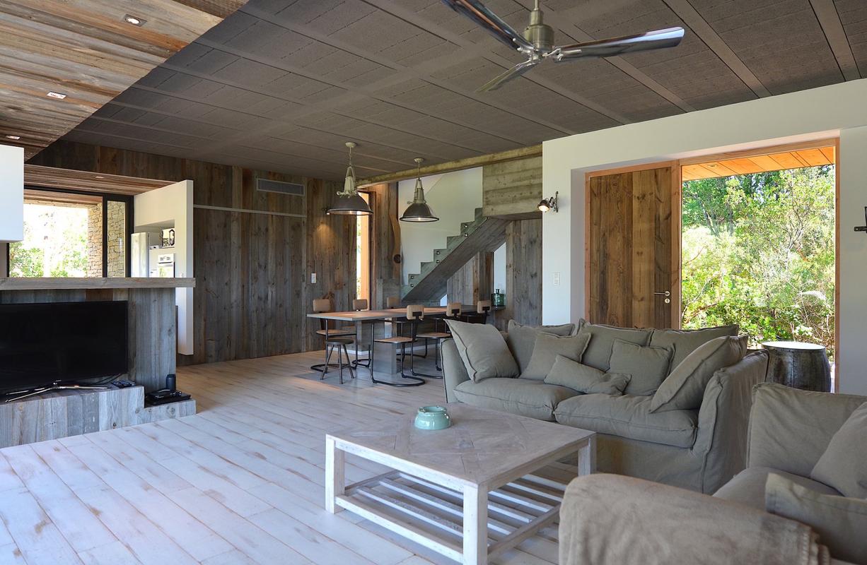 La villa de 180m2 a un intérieur moderne et élégant de style loft, avec des espaces ouverts et des matériaux de haute qualité tels que le bois et la pierre. Les grandes baies vitrées réunissent l’extérieur et en.