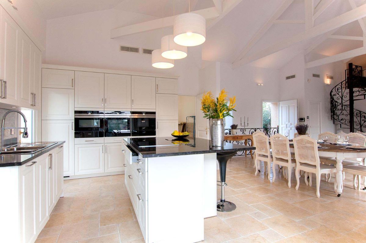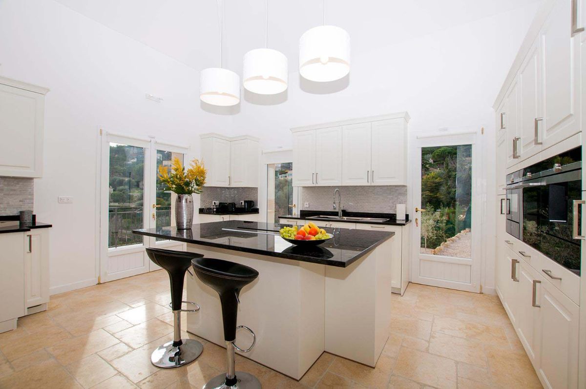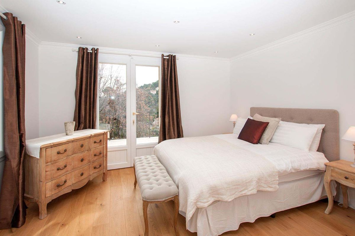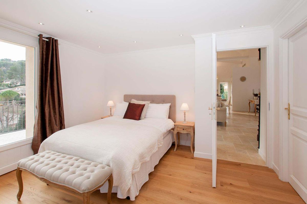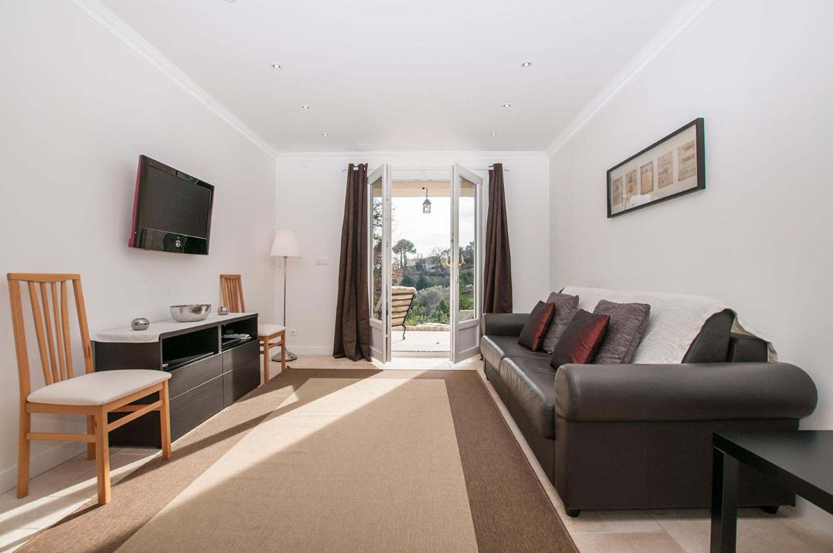 En effet, les pièces de vie bénéficient de portes-fenêtres ouvrant sur une grande terrasse avec vue mer. Mais également une vue sur le village de Mougins et les montagnes de l’Esterel.