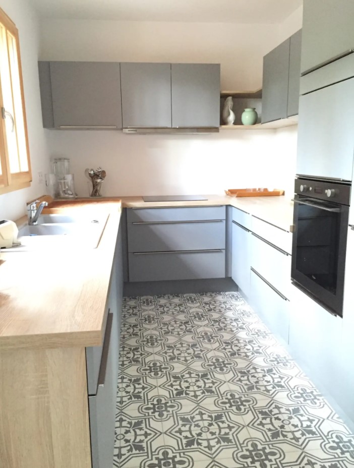 Puis, un salon spacieux avec une grande table de famille pour diner. Ainsi qu’une cuisine toute équipée, ornée de carreaux bleu comme l’océan. Le mobilier recustomisé avec gout, nous rappelle les bienfaits d’un ameublement simple et charmant.