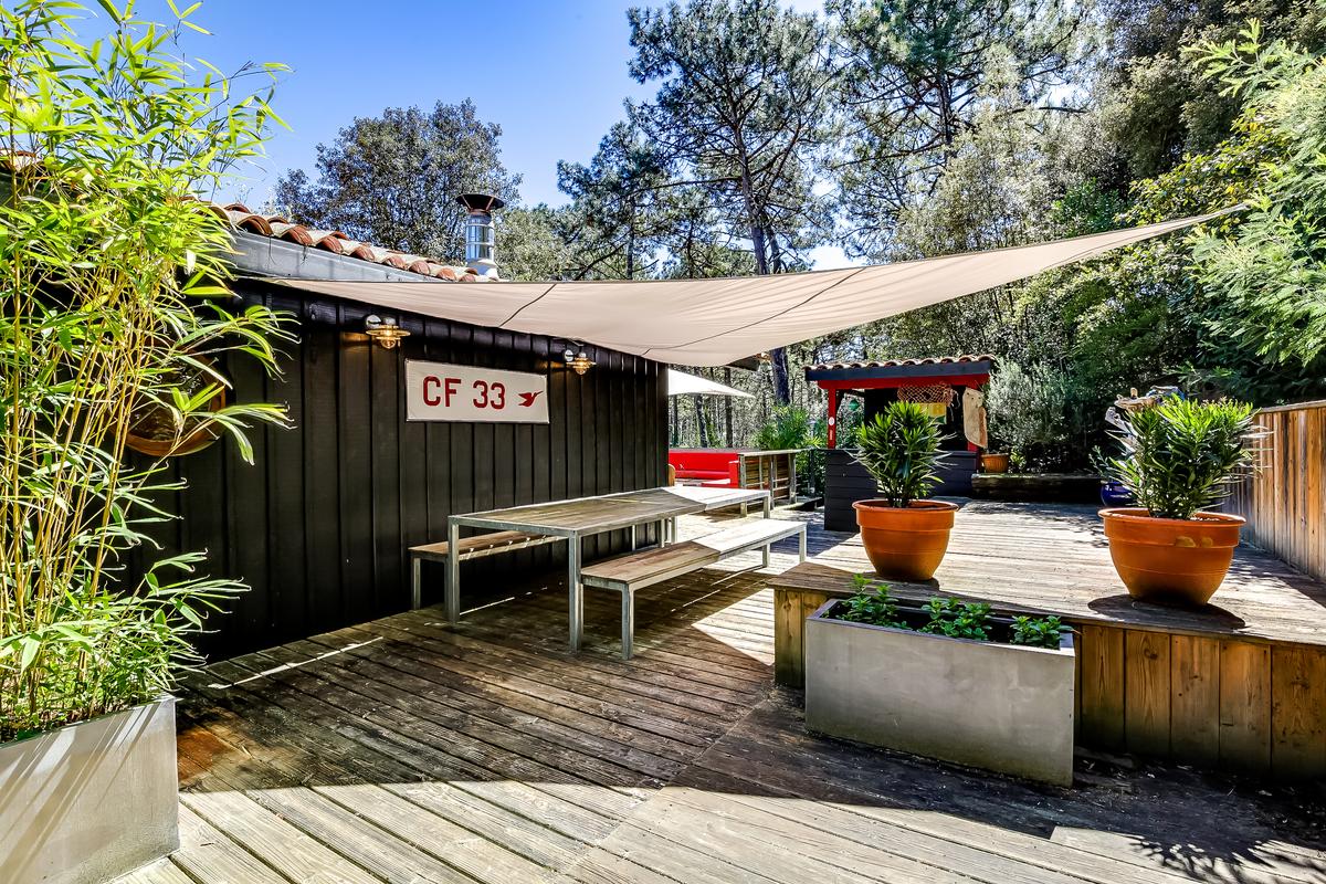 – terrasse avec salon extérieur, grande table pour manger à l’abri du soleil à l’ombre d’un tissu, véritable bar à huîtres, grill