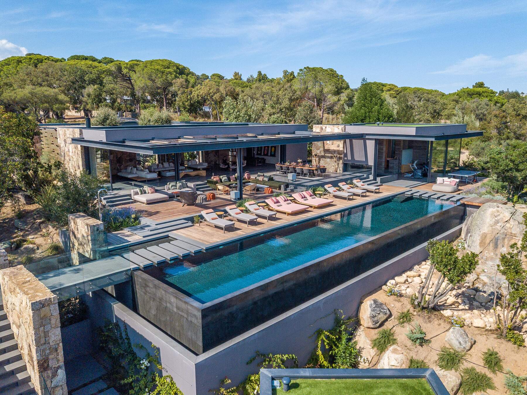 Le jardin arboré avec des essences méditerranéenne donne un air de maquis Corse à ce coin idyllique. Puis, la piscine à débordement, un couloir de nage, chauffée avec nage à contre courant et hydromassage. En effet, cette villa offre toutes les prestations sportives telles que hammam, jacuzzi, fitness, salle de sport, salle de massage. Les espaces ludiques sont nombreux pour le plaisir de chacun, terrain de boules, bar extérieur, terrain de football, ping Pong et Putting green. De plus, équipements nautiques à votre disposition, kayacs, paddles, location de bateaux possible également. A noter libre accès au golf.