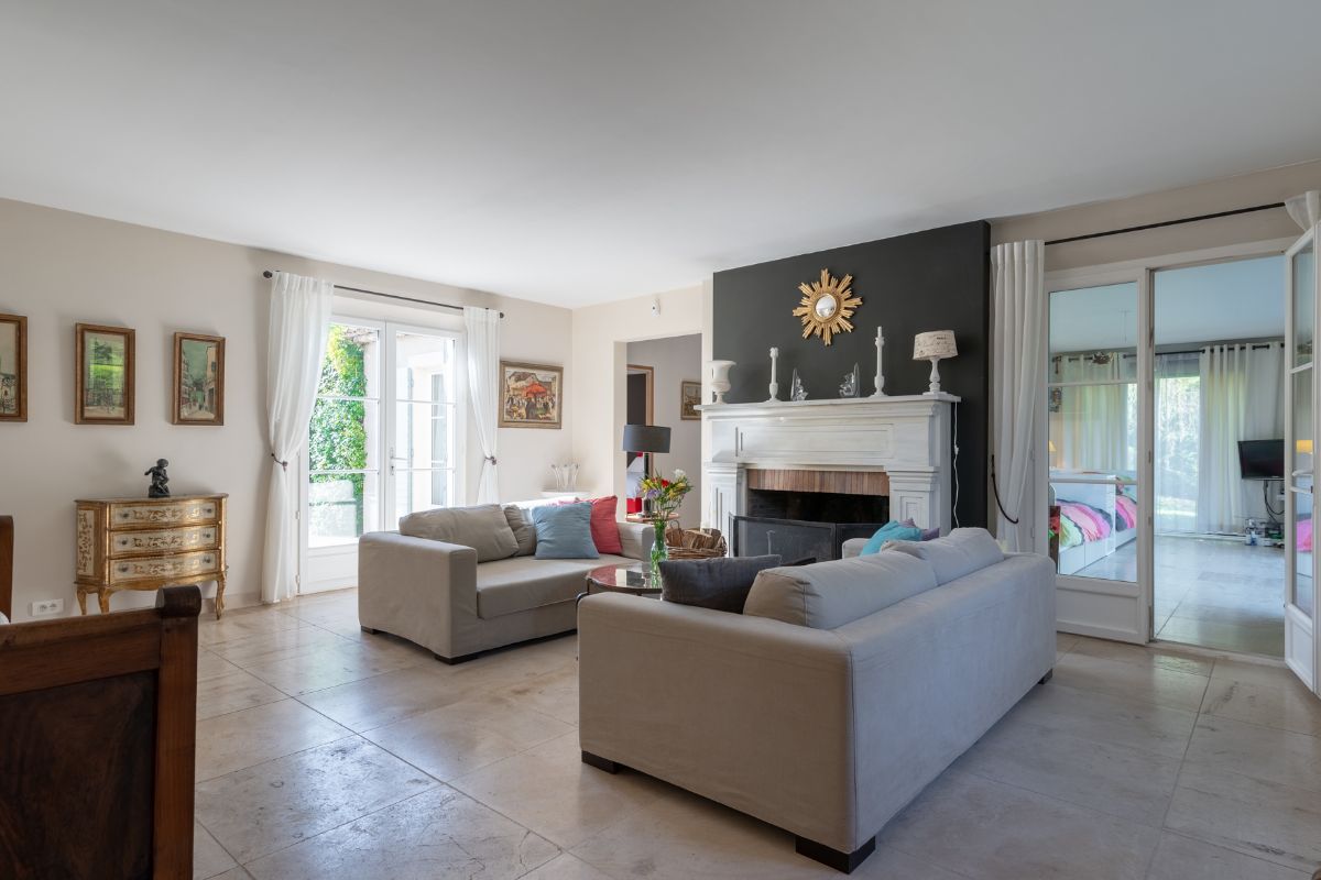 Puis, les pièces de vie très spacieuses, avec cuisine entièrement équipée ouverte. Des espaces très conviviaux, notamment le salon avec cheminée, mur en pierre. De plus une salle à manger très contemporaine ouverte sur l’extérieur par de grandes baies.